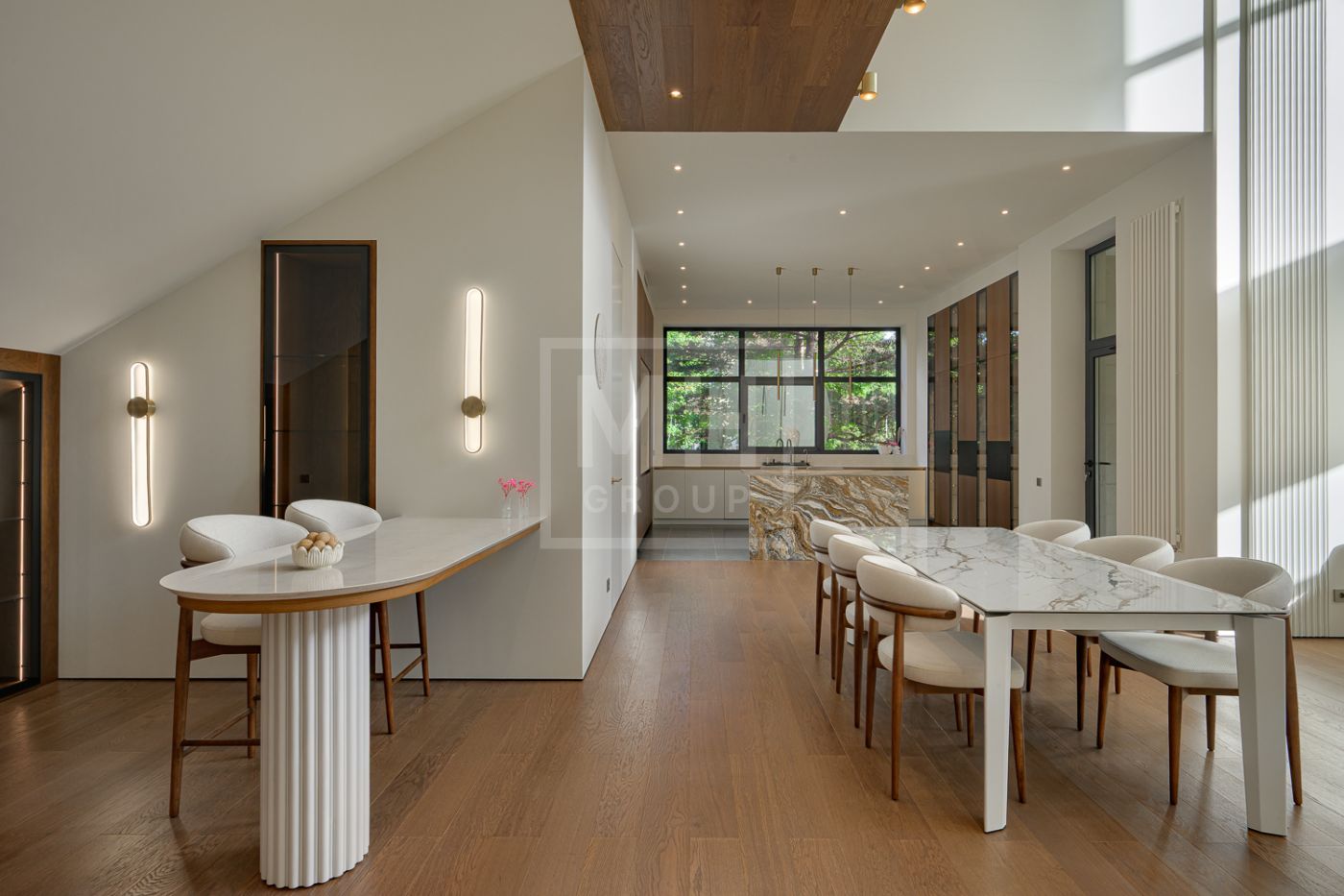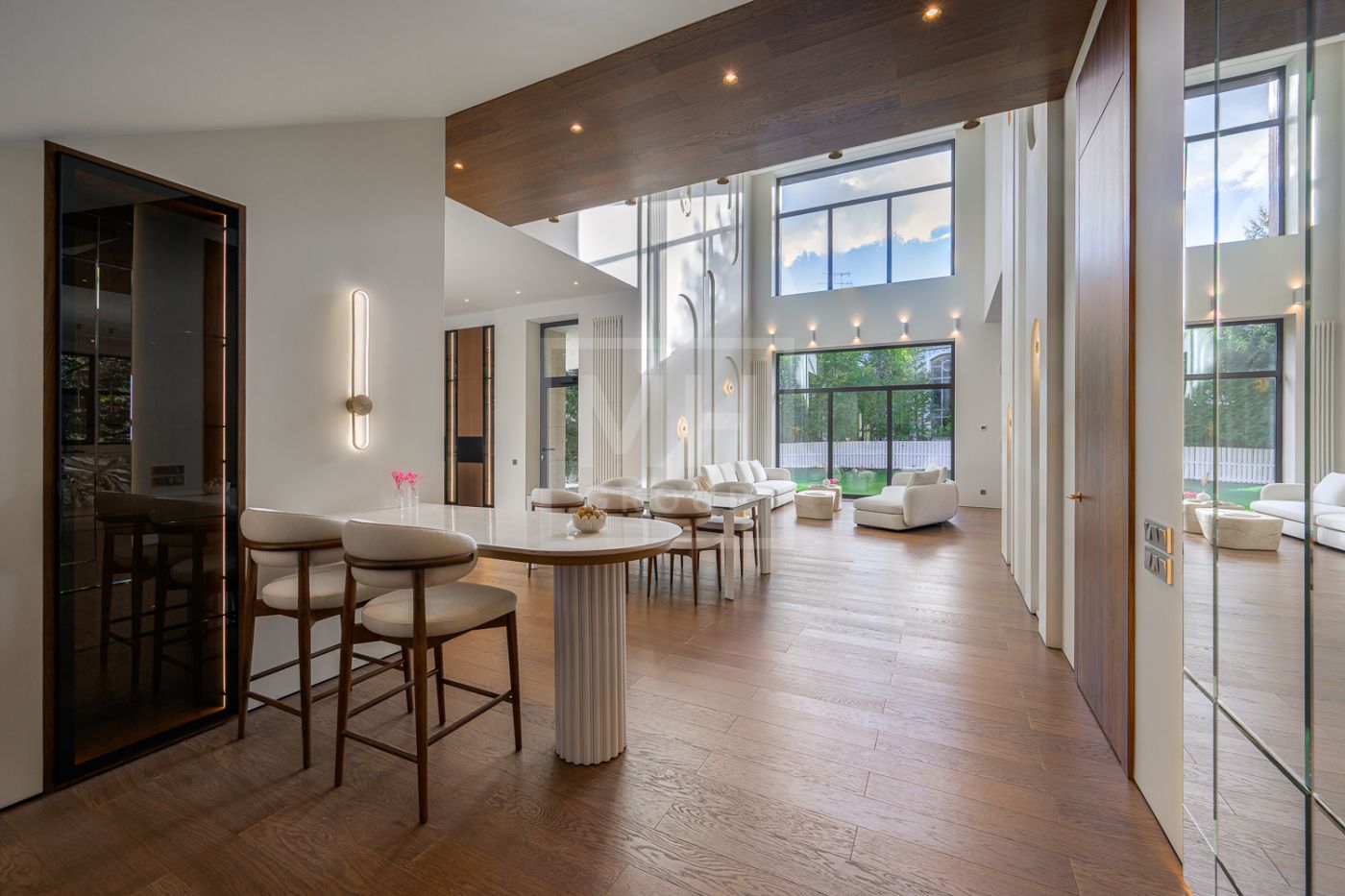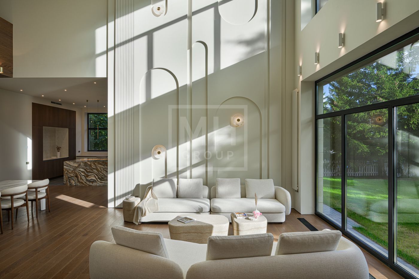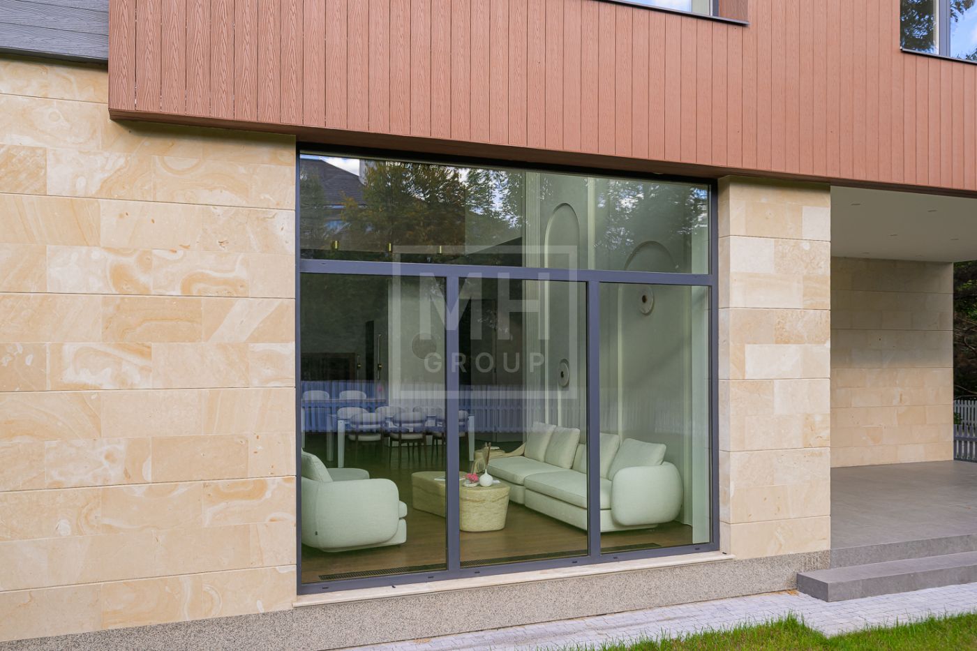 Дом под ключ, в КП «Резиденции Бенилюкс». Дом расположен на участке со взрослыми хвойными деревьями. Посадка дома учитывает соседние дома, до которых более 20м и обеспечивает ощущение приватности и отсутствие ситуации «окна в окна». Взрослые деревья на собственном и соседних участках создают полное ощущение светлого хвойного леса. Все соседние участки застроены. На участке построен гараж на 2 машиноместа с техническими помещениями и квартирой персонала, площадью 123м. Предусмотрена открытая парковка на 5 машиномест.