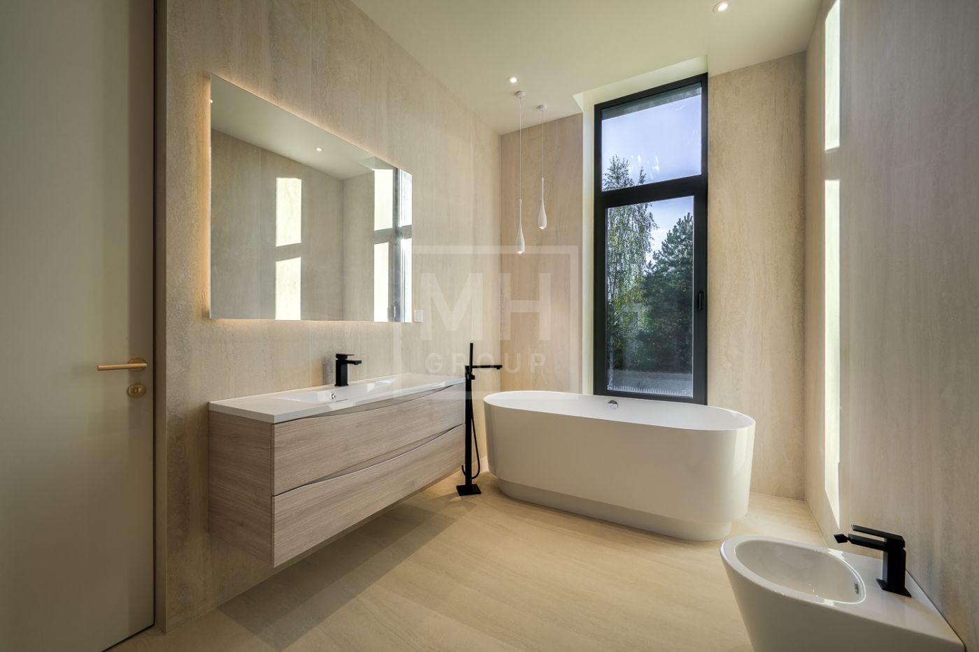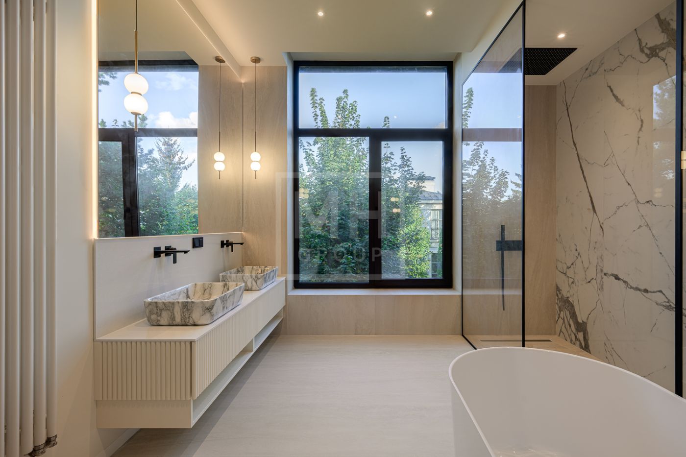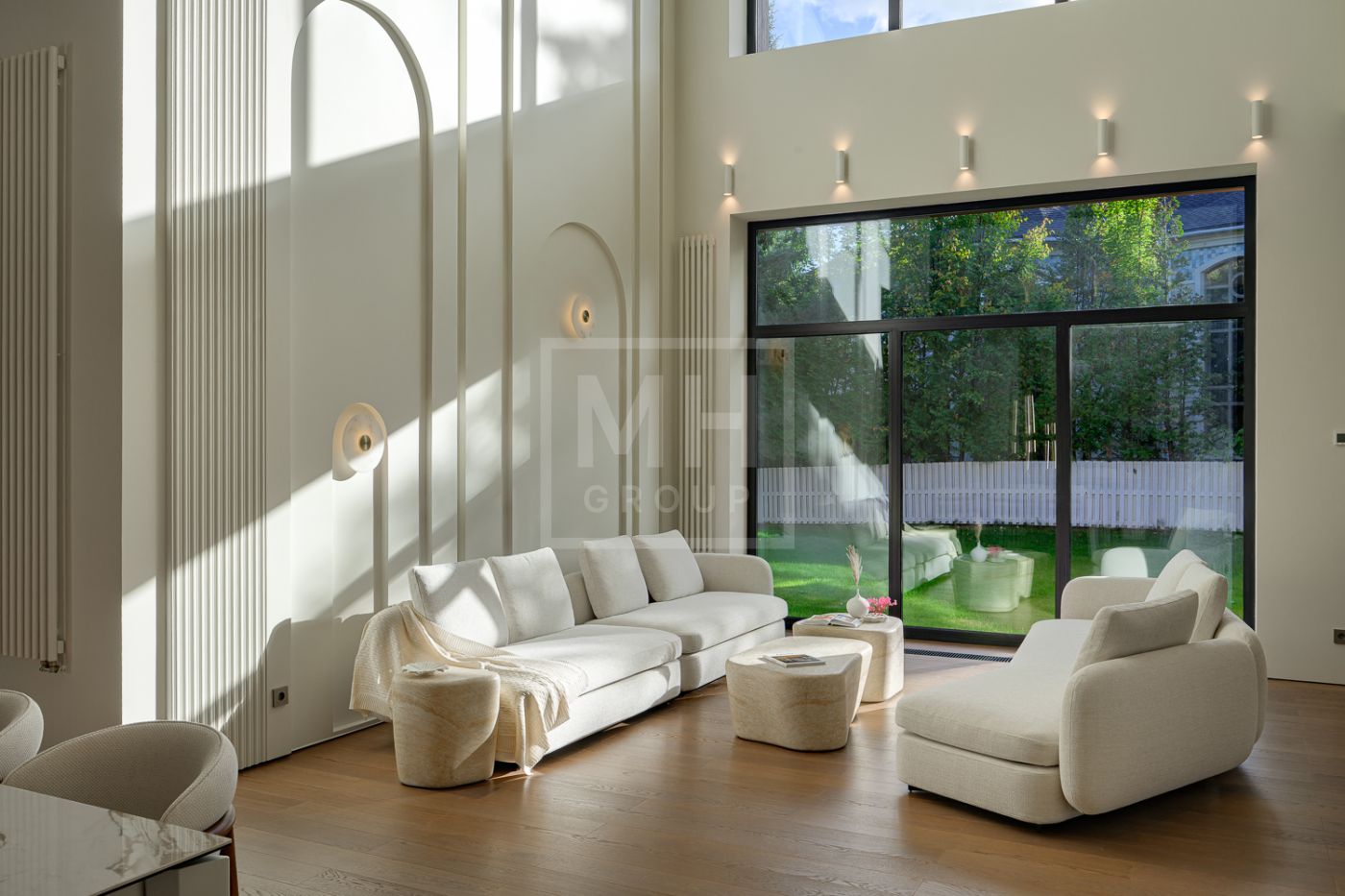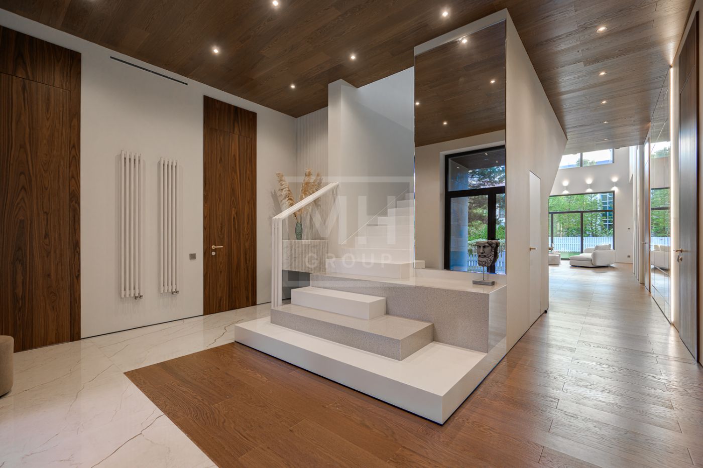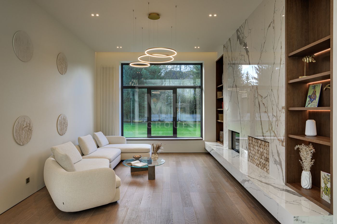 Дом под ключ, в КП «Резиденции Бенилюкс». Дом расположен на участке со взрослыми хвойными деревьями. Посадка дома учитывает соседние дома, до которых более 20м и обеспечивает ощущение приватности и отсутствие ситуации «окна в окна». Взрослые деревья на собственном и соседних участках создают полное ощущение светлого хвойного леса. Все соседние участки застроены. На участке построен гараж на 2 машиноместа с техническими помещениями и квартирой персонала, площадью 123м. Предусмотрена открытая парковка на 5 машиномест.