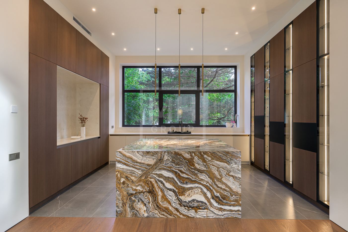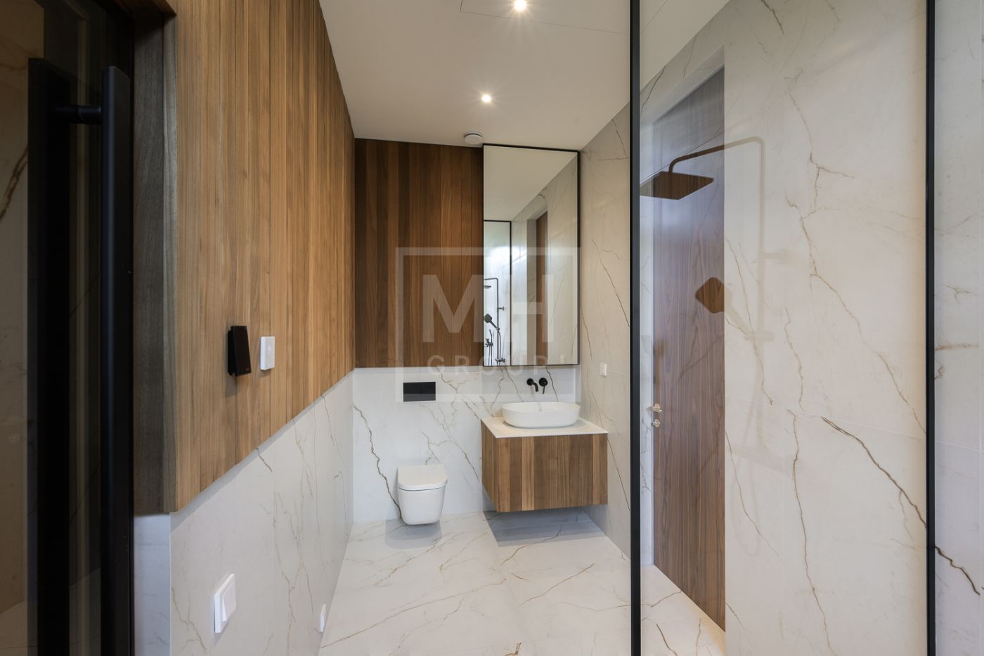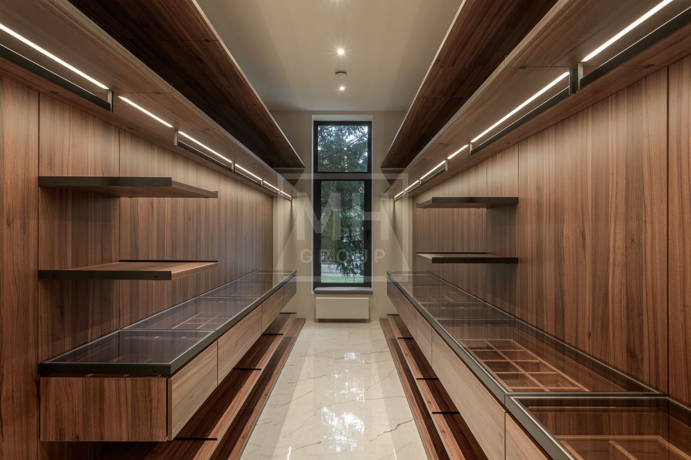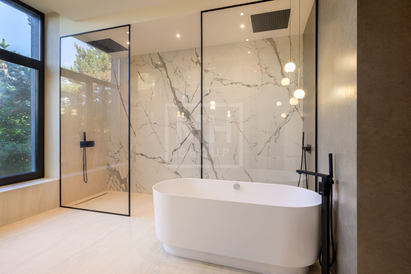 Дом под ключ, в КП «Резиденции Бенилюкс». Дом расположен на участке со взрослыми хвойными деревьями. Посадка дома учитывает соседние дома, до которых более 20м и обеспечивает ощущение приватности и отсутствие ситуации «окна в окна». Взрослые деревья на собственном и соседних участках создают полное ощущение светлого хвойного леса. Все соседние участки застроены. На участке построен гараж на 2 машиноместа с техническими помещениями и квартирой персонала, площадью 123м. Предусмотрена открытая парковка на 5 машиномест.