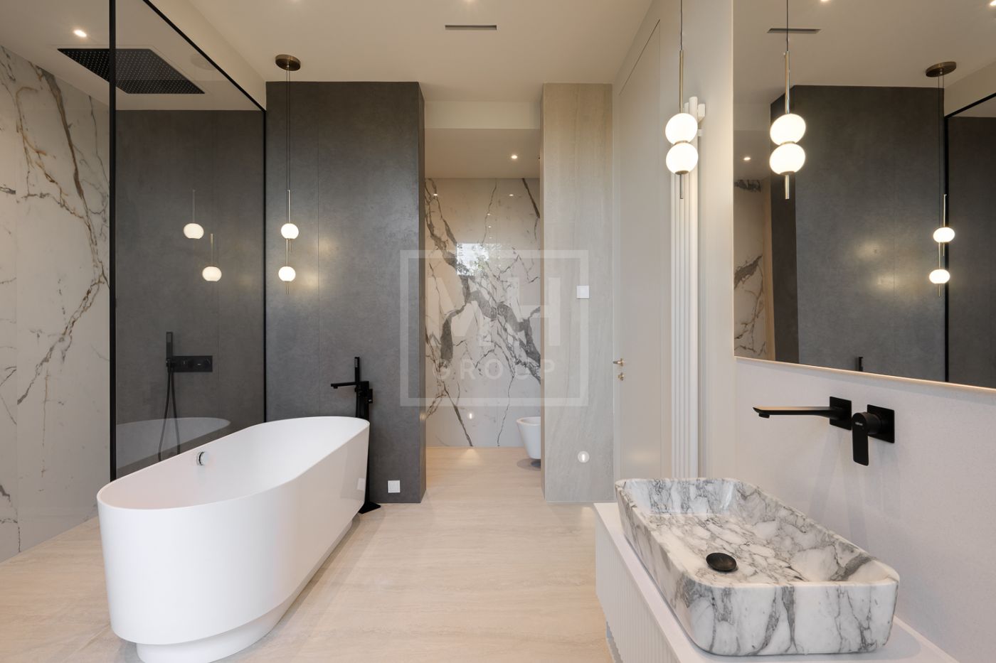Этаж 2: Мастер сьют: спальня, изолированная гардеробная с окном, санузел с окном. Три детских сьюта: четкое зонирование, выделяющее кабинет-игровую-гардеробную, детскую и санузел, полноценный санузел, с окном, ванной, душевой, умывальником, унитазом и биде, постирочная.