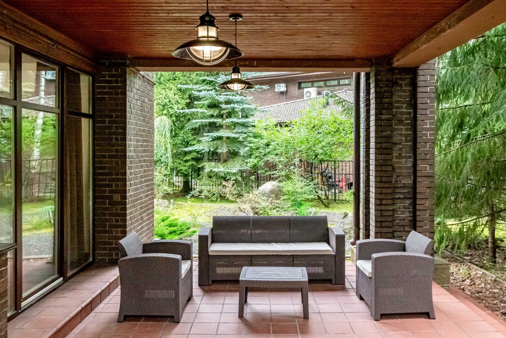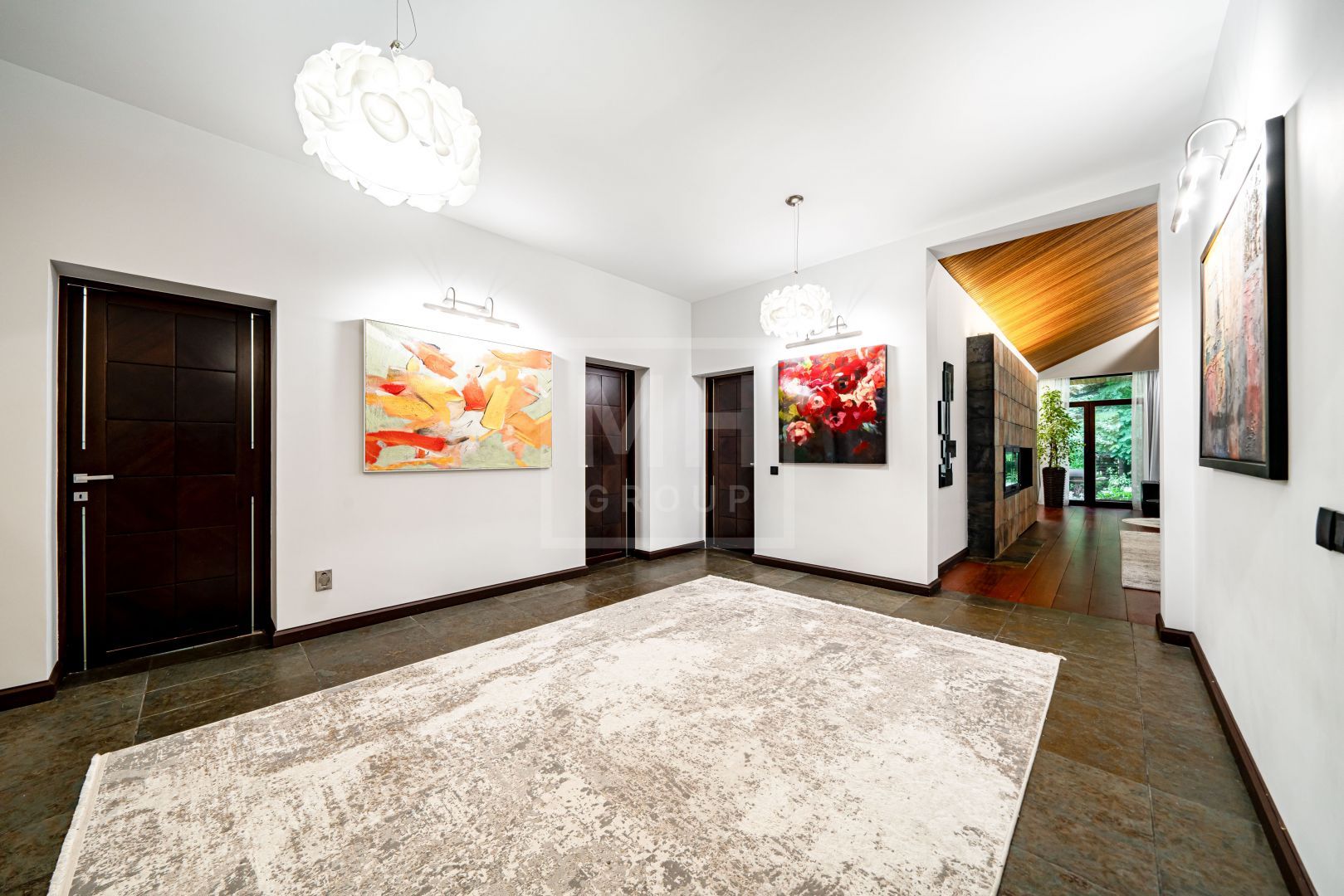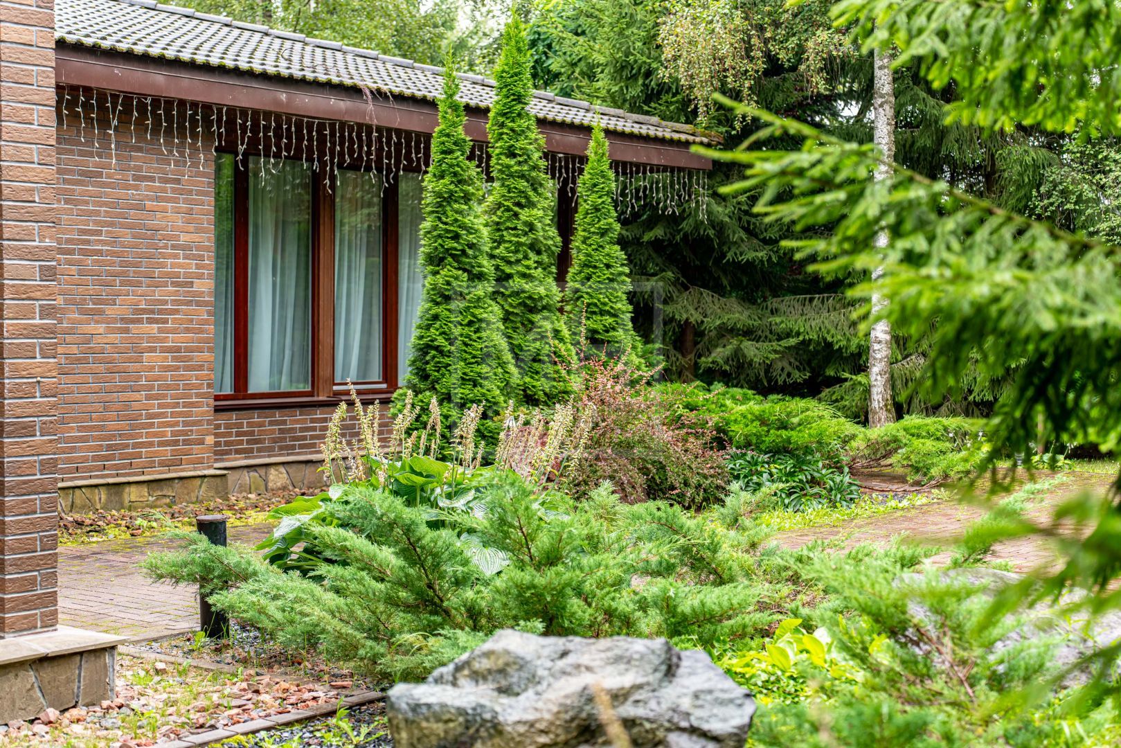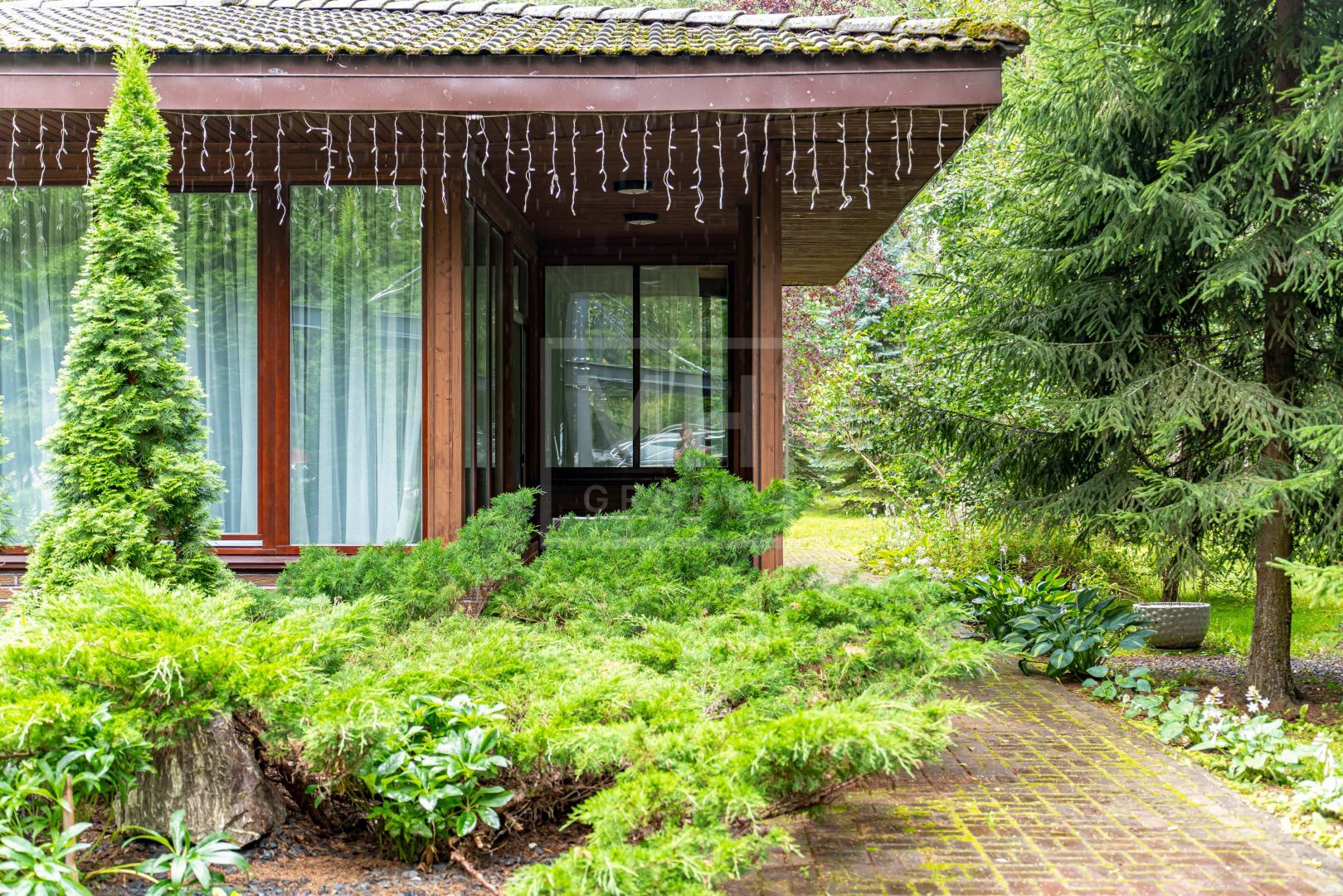 "Лесной Ручей -3" был спроектирован в едином стиле- "органической архитектуры", прообразом служила идеология Френка Ллойда Райта. Все дома гармонично вписаны в природный ландшафт. Для строительства использованы природные материалы: кирпич, клинкер, стекло, дерево, керамика, которые целесообразны для средней полосы России. Строительство вела компания " Глетчер"- опытный, надежный девелопер загородной недвижимости в сегменте "бизнес +" и "элит".Дом в темно-коричневых тонах от стен до кровли представляет из себя 2 соединенных объема прямоугольных форм. Идеальное размещение на участке, дает возможность, не только удобно парковать автомобили под отдельно стоящий навес ( заботясь об экологии дома), но и наслаждаться прекрасными видами из панорамных окон любой комнаты или балкона. Просторный холл первого этажа объединяет весь дом и одновременно направляет движение по нему, здесь расположена удобная двух маршевая лестница на второй этаж . Одноэтажная гостиная столовая имеет двускатную форму потолка, подшитую натуральным деревом, сразу определяя загородный формат. Зона кухни, столовой, гостиной с выходом на веранду объединены в единое пространство и имеют круговое движение. В гостиной центральное место занимает дровяной камин, интегрированный в стену, облицованную натуральным сланцем в природных оттенках от желтого до терракотового. Уединиться и поработать можно в кабинете, рядом с которым находится вторая гостиная, сочетающая в себе библиотеку и ТВ-зону, с выходом на большую веранду. Зона СПА в марокканском духе приглашает отдохнуть на лежаках у бассейна и расслабиться в хаммаме, предусмотрен выход на улицу. Второй этаж полностью отведен под спальни. На участке выполнено уличное освещение, оформлены декоративные миксбордеры, выложена тропиночная сеть, под окнами кухни вазоны для выращивания зелени к столу, в тенистой части располагается площадка для медитации, в дальней углу участка под кронами деревьев находится уединенная беседка.