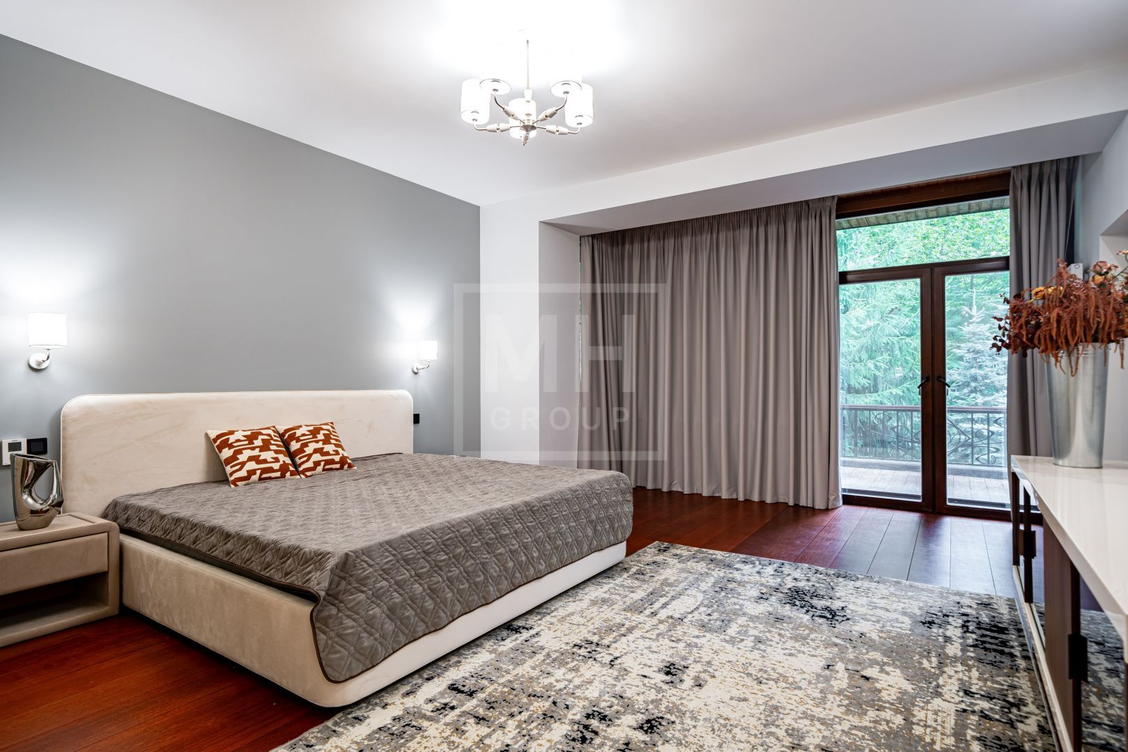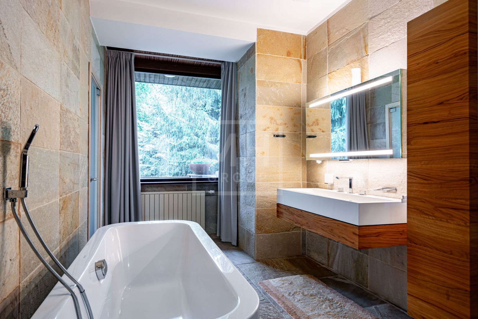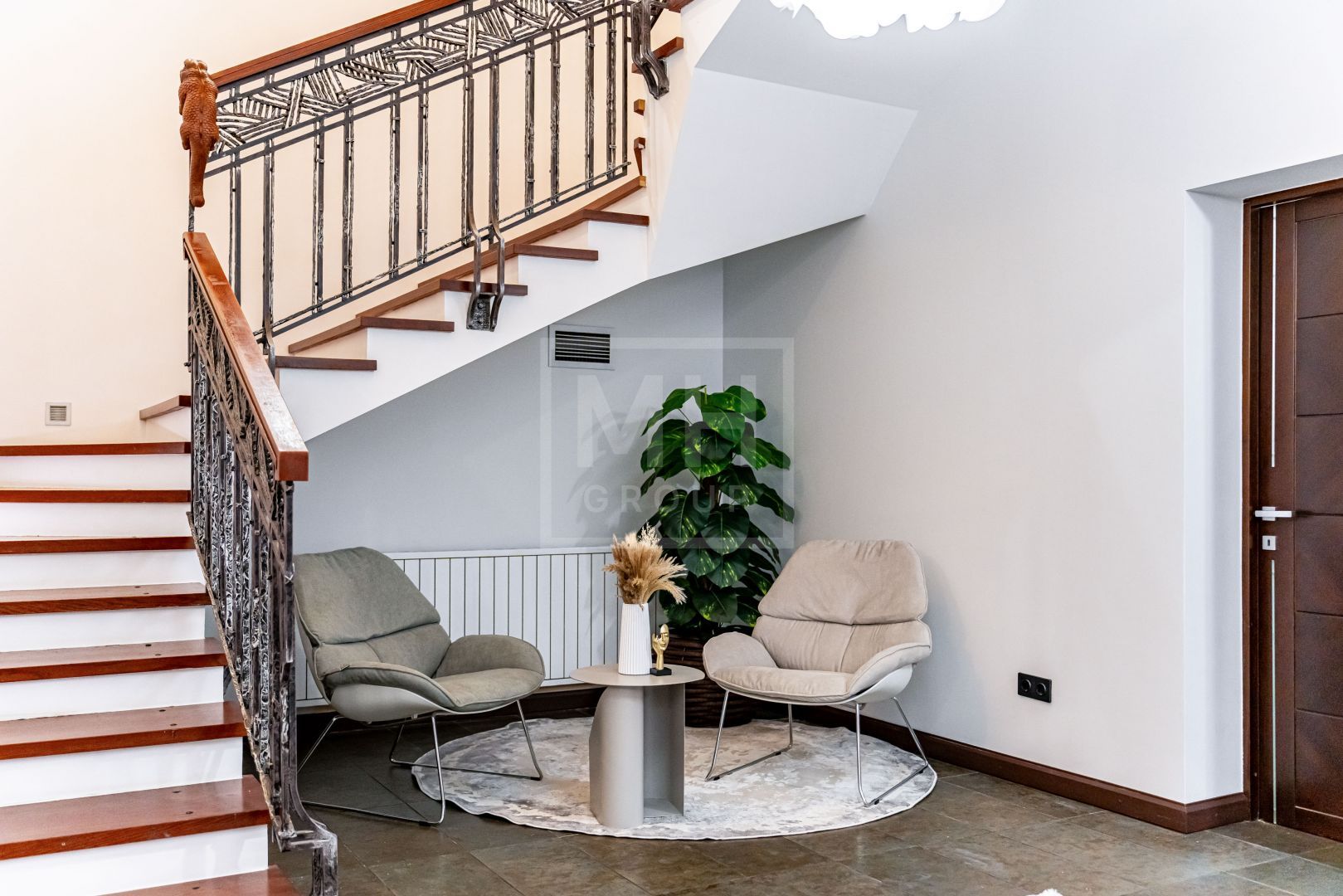 "Лесной Ручей -3" был спроектирован в едином стиле- "органической архитектуры", прообразом служила идеология Френка Ллойда Райта. Все дома гармонично вписаны в природный ландшафт. Для строительства использованы природные материалы: кирпич, клинкер, стекло, дерево, керамика, которые целесообразны для средней полосы России. Строительство вела компания " Глетчер"- опытный, надежный девелопер загородной недвижимости в сегменте "бизнес +" и "элит".Дом в темно-коричневых тонах от стен до кровли представляет из себя 2 соединенных объема прямоугольных форм. Идеальное размещение на участке, дает возможность, не только удобно парковать автомобили под отдельно стоящий навес ( заботясь об экологии дома), но и наслаждаться прекрасными видами из панорамных окон любой комнаты или балкона. Просторный холл первого этажа объединяет весь дом и одновременно направляет движение по нему, здесь расположена удобная двух маршевая лестница на второй этаж . Одноэтажная гостиная столовая имеет двускатную форму потолка, подшитую натуральным деревом, сразу определяя загородный формат. Зона кухни, столовой, гостиной с выходом на веранду объединены в единое пространство и имеют круговое движение. В гостиной центральное место занимает дровяной камин, интегрированный в стену, облицованную натуральным сланцем в природных оттенках от желтого до терракотового. Уединиться и поработать можно в кабинете, рядом с которым находится вторая гостиная, сочетающая в себе библиотеку и ТВ-зону, с выходом на большую веранду. Зона СПА в марокканском духе приглашает отдохнуть на лежаках у бассейна и расслабиться в хаммаме, предусмотрен выход на улицу. Второй этаж полностью отведен под спальни. На участке выполнено уличное освещение, оформлены декоративные миксбордеры, выложена тропиночная сеть, под окнами кухни вазоны для выращивания зелени к столу, в тенистой части располагается площадка для медитации, в дальней углу участка под кронами деревьев находится уединенная беседка.