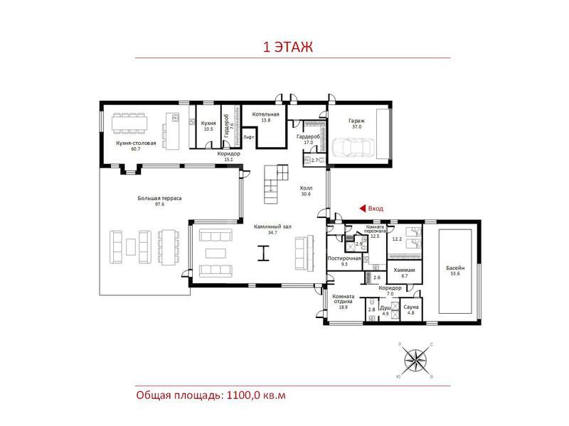 Этаж 1: Прихожая, гардеробная, с/у, кухня-столовая, кладовая при кухне, каминный зал-гостиная, спальня, с/у, зона персонала с отдельным выходом: постирочная, кухня, СПА зона: комната отдыха, душевые, с/у, хаммам, сауна, бассейн 9 м, с противотоком, гараж