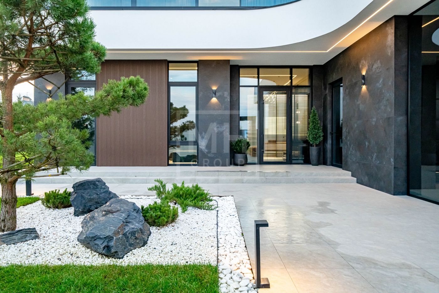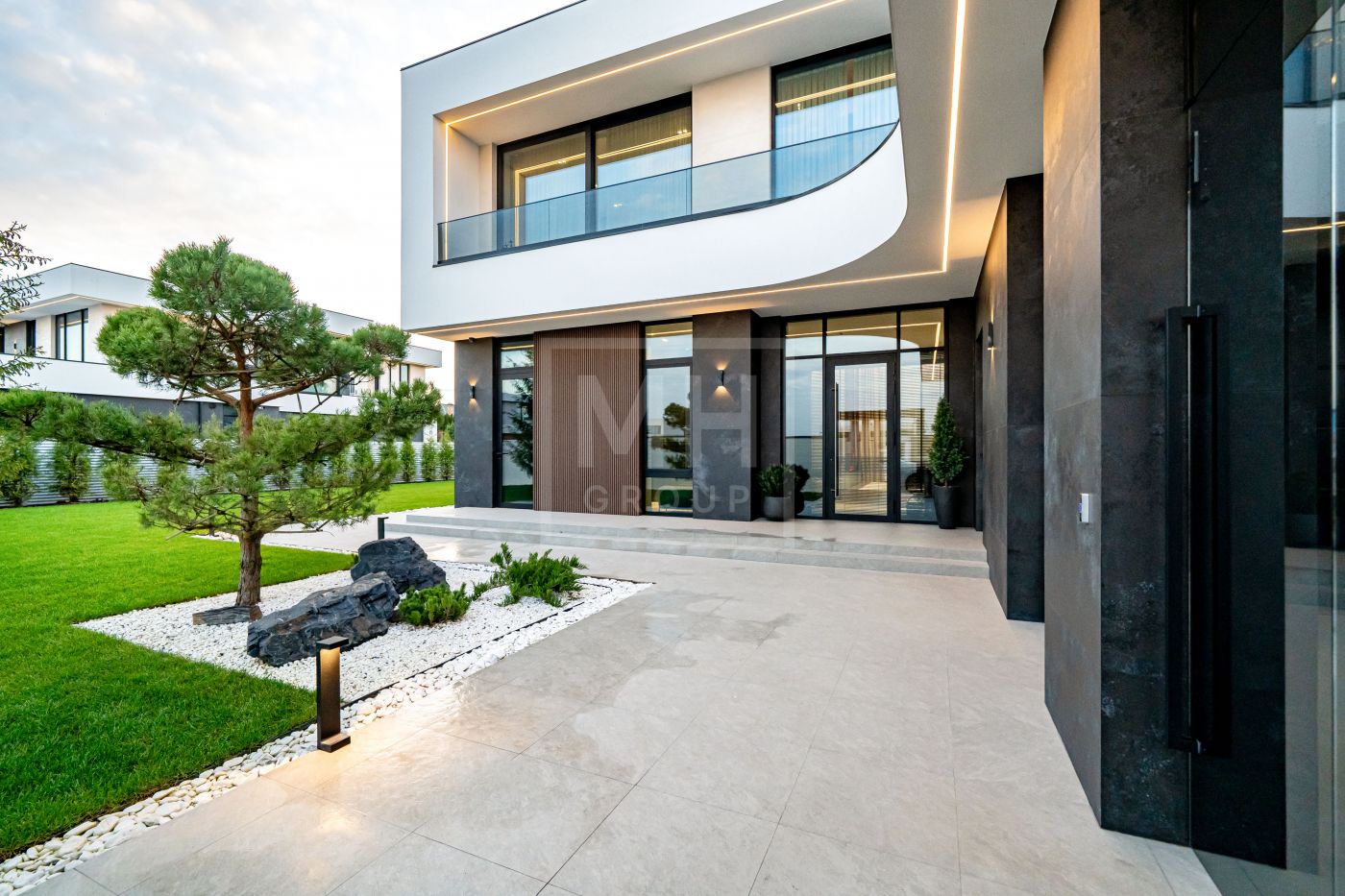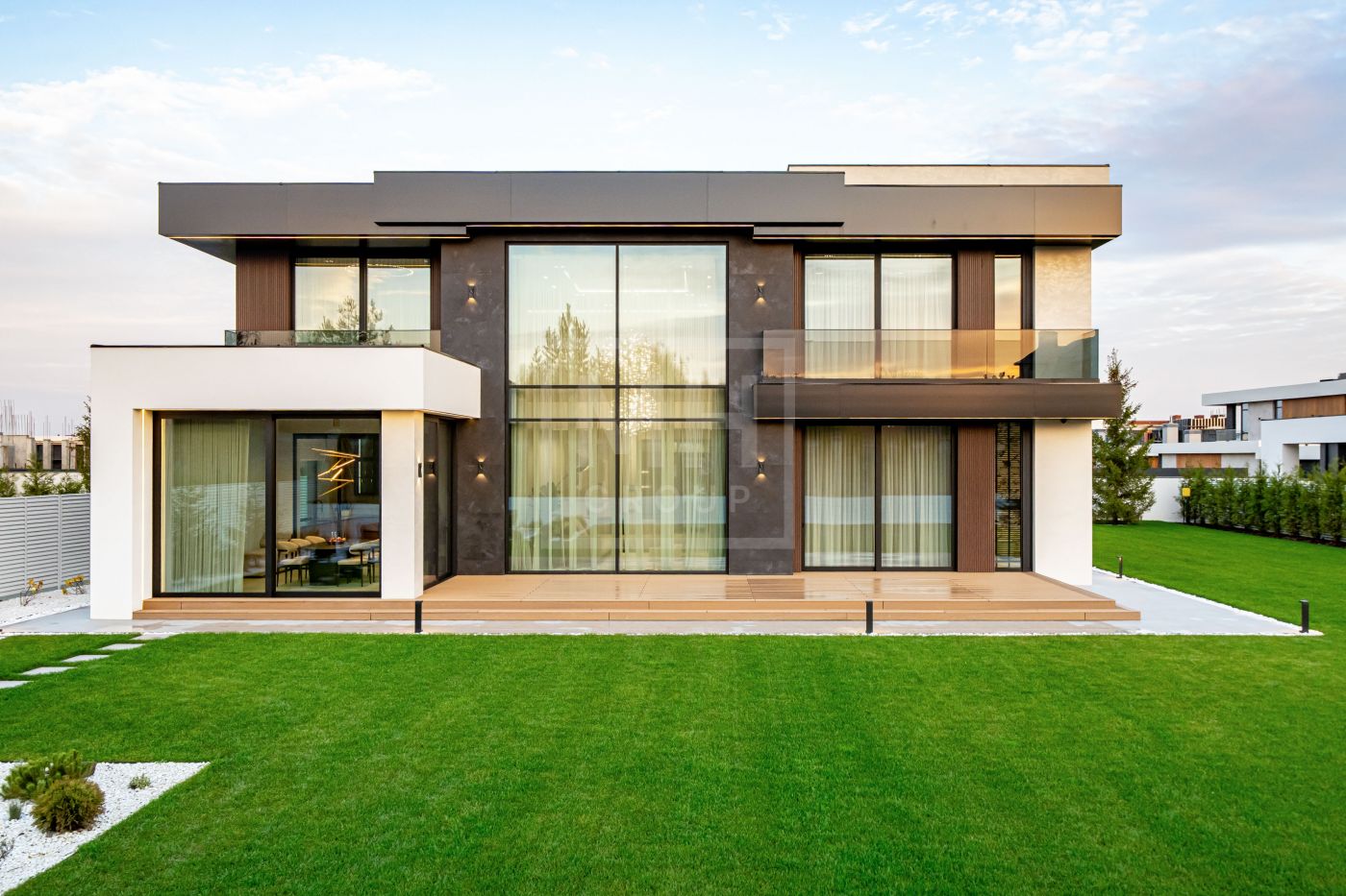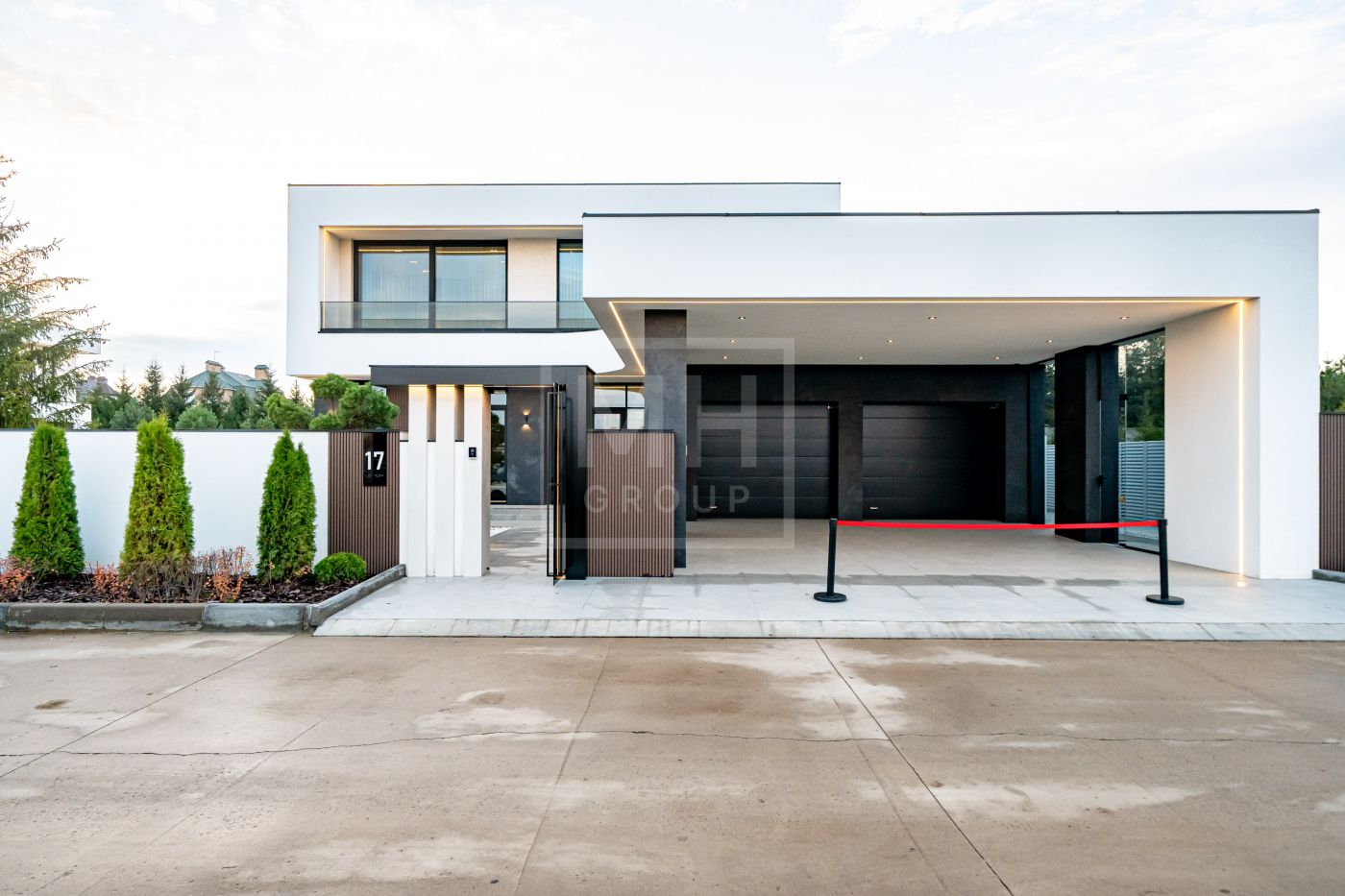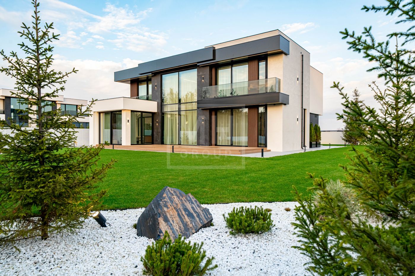 Все дома в поселке построены в едином стиле по мотивам архитектурных проектов Ф.Л. Райта. В строительстве и отделке использовались современные материалы. Для остекления были выбраны премиальные окна Schuco. На первом этаже располагается большая кухня-гостиная со вторым светом, мастер спальня с гардеробной и своим санузлом, большой гараж на два машиноместа и большой навес на две машины. На втором этаже мастер спальня с гардеробной и ванной комнатой, две спальни со своими гардеробными и большой ванной комнатой. Дом очень светлый, цветовая гамма подобрана с учетом всех современных тенденция включая отделку, мебель и предметы интерьера.