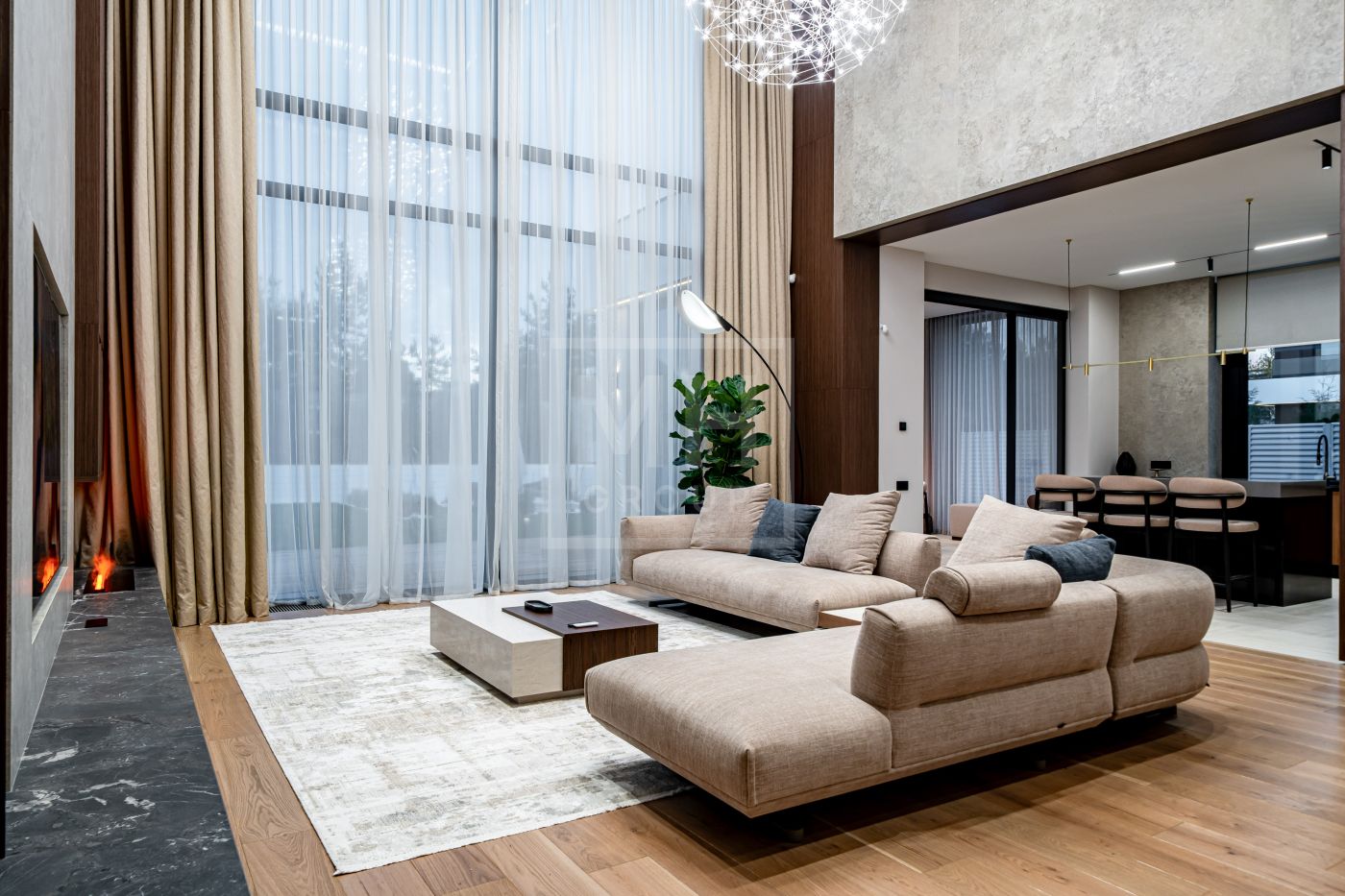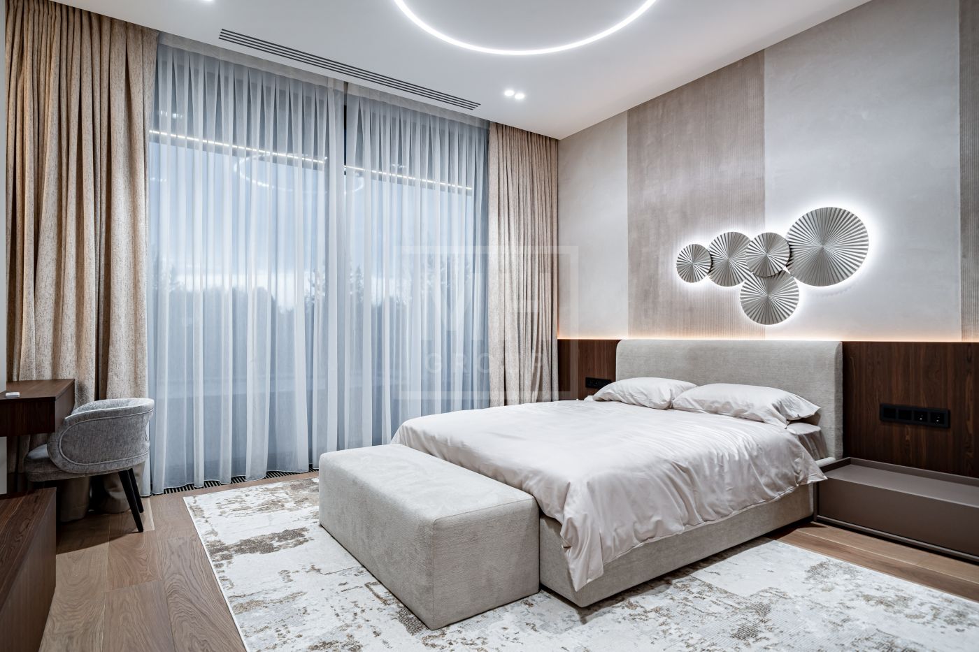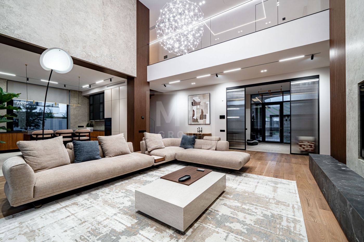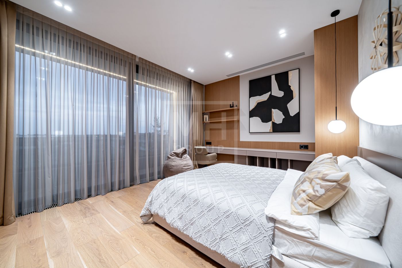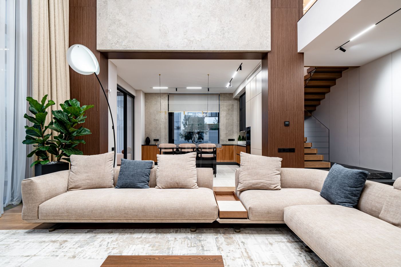 Все дома в поселке построены в едином стиле по мотивам архитектурных проектов Ф.Л. Райта. В строительстве и отделке использовались современные материалы. Для остекления были выбраны премиальные окна Schuco. На первом этаже располагается большая кухня-гостиная со вторым светом, мастер спальня с гардеробной и своим санузлом, большой гараж на два машиноместа и большой навес на две машины. На втором этаже мастер спальня с гардеробной и ванной комнатой, две спальни со своими гардеробными и большой ванной комнатой. Дом очень светлый, цветовая гамма подобрана с учетом всех современных тенденция включая отделку, мебель и предметы интерьера.
