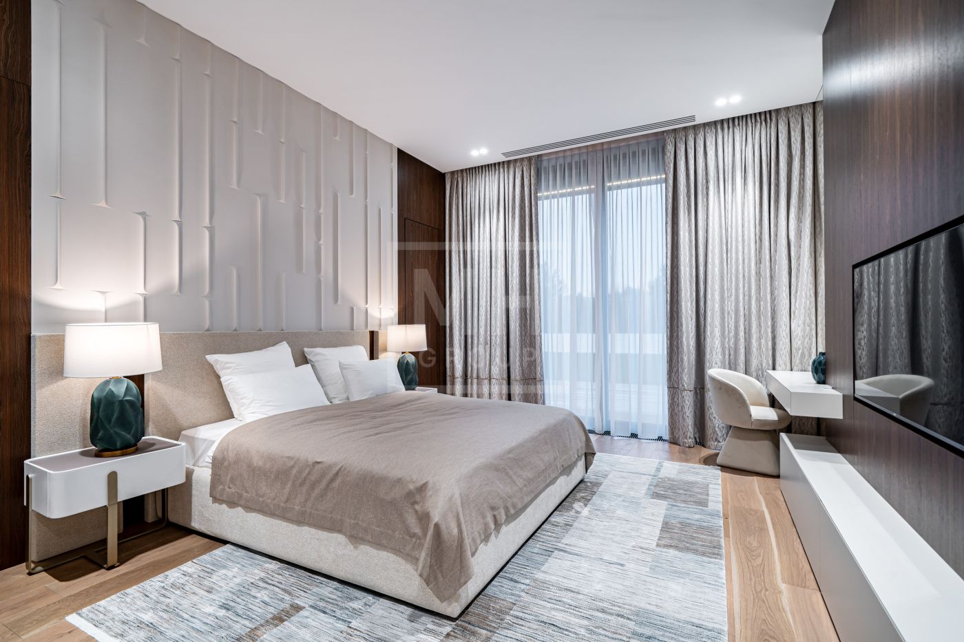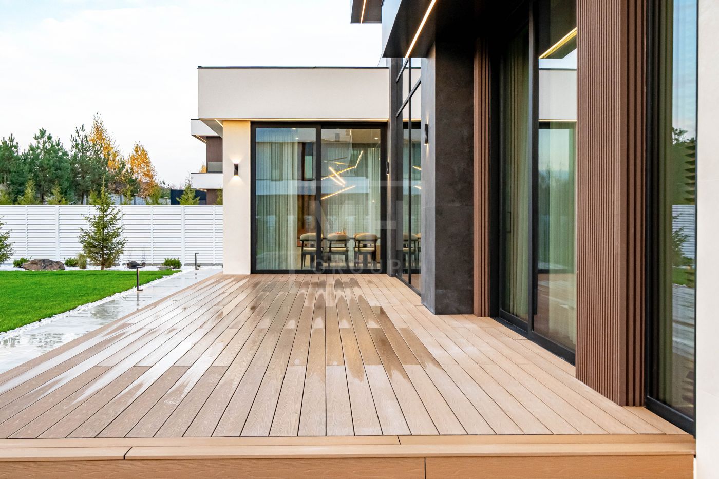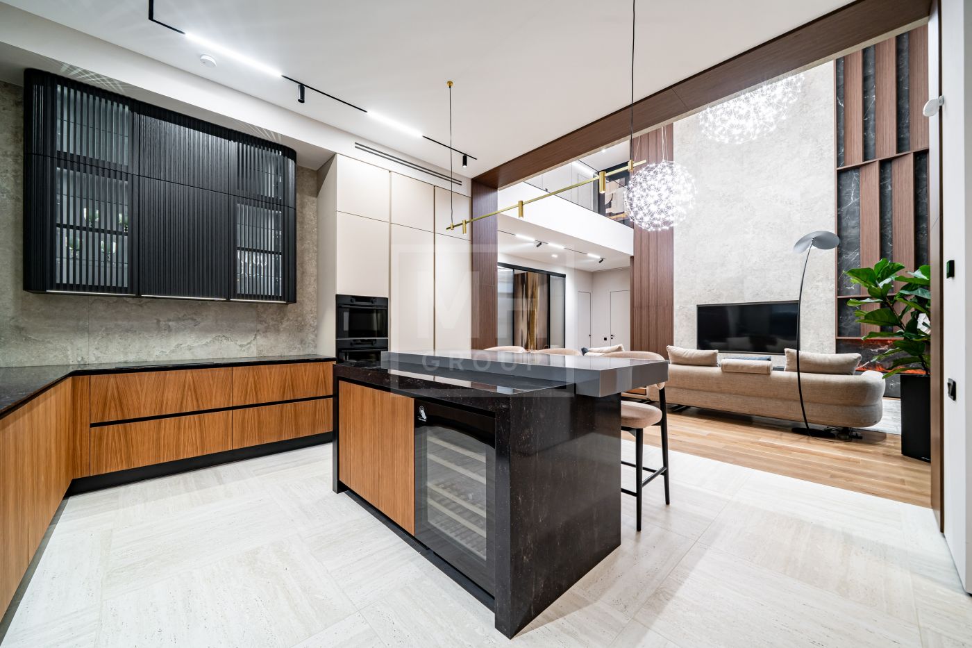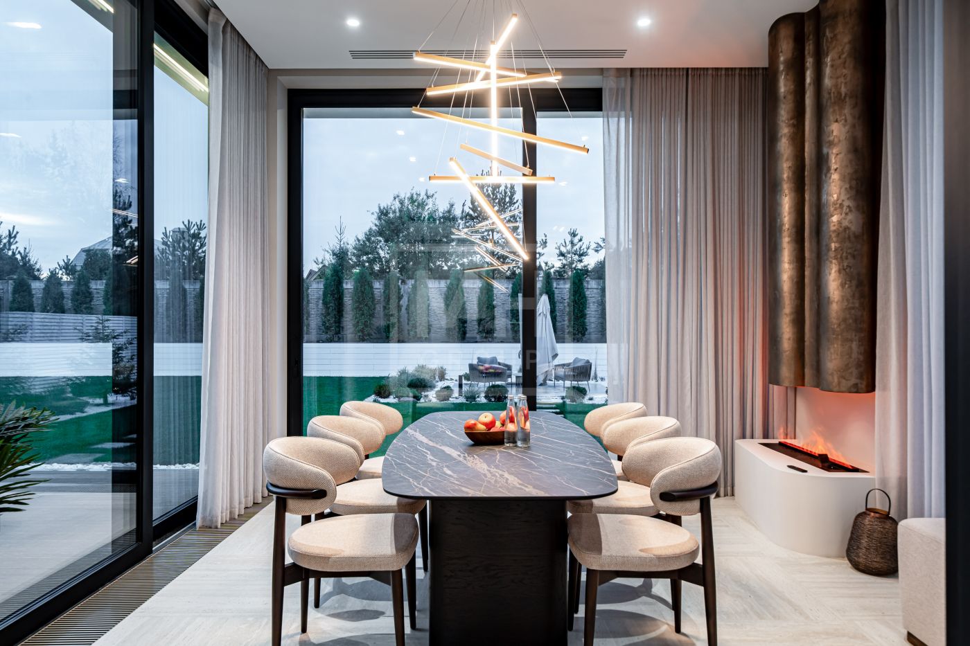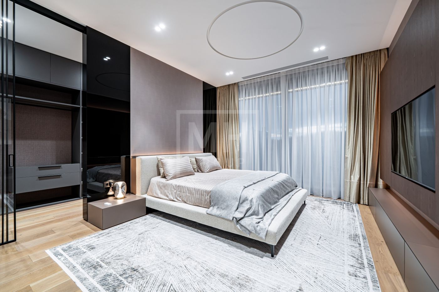 Все дома в поселке построены в едином стиле по мотивам архитектурных проектов Ф.Л. Райта. В строительстве и отделке использовались современные материалы. Для остекления были выбраны премиальные окна Schuco. На первом этаже располагается большая кухня-гостиная со вторым светом, мастер спальня с гардеробной и своим санузлом, большой гараж на два машиноместа и большой навес на две машины. На втором этаже мастер спальня с гардеробной и ванной комнатой, две спальни со своими гардеробными и большой ванной комнатой. Дом очень светлый, цветовая гамма подобрана с учетом всех современных тенденция включая отделку, мебель и предметы интерьера.