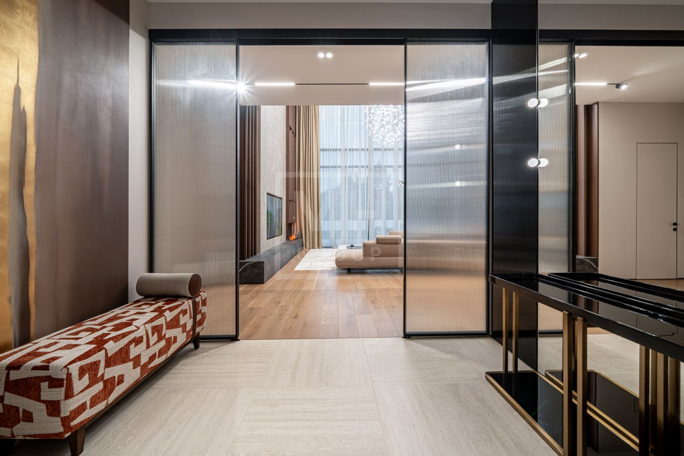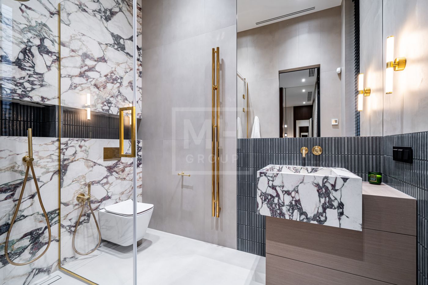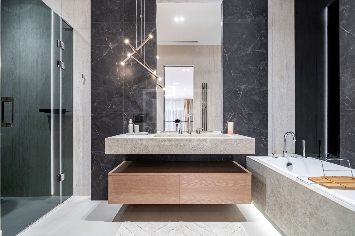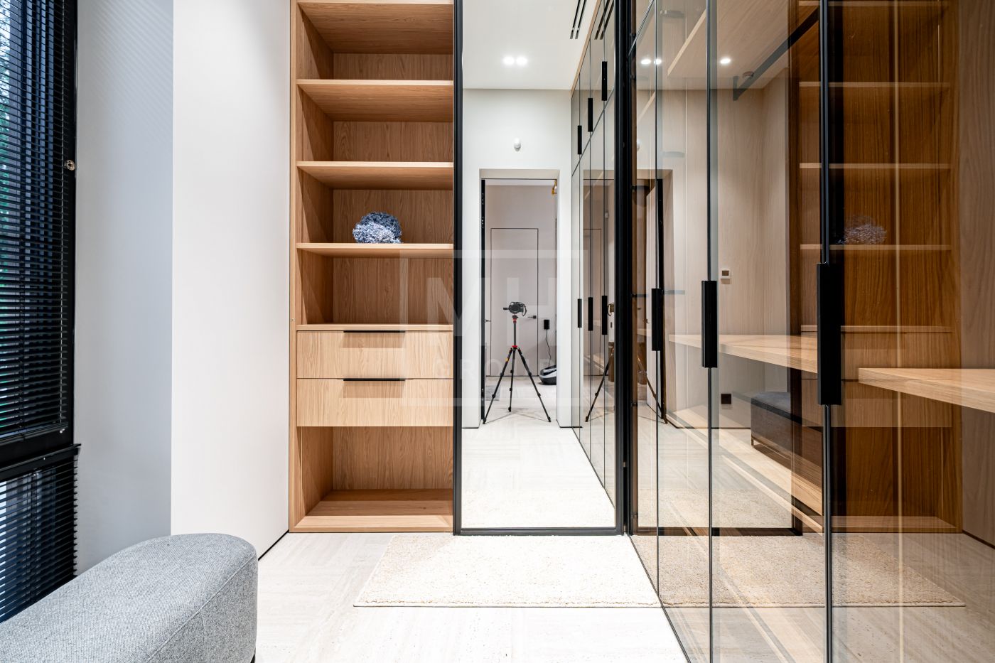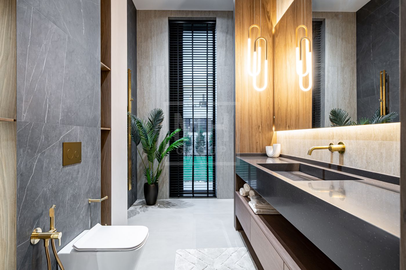 Все дома в поселке построены в едином стиле по мотивам архитектурных проектов Ф.Л. Райта. В строительстве и отделке использовались современные материалы. Для остекления были выбраны премиальные окна Schuco. На первом этаже располагается большая кухня-гостиная со вторым светом, мастер спальня с гардеробной и своим санузлом, большой гараж на два машиноместа и большой навес на две машины. На втором этаже мастер спальня с гардеробной и ванной комнатой, две спальни со своими гардеробными и большой ванной комнатой. Дом очень светлый, цветовая гамма подобрана с учетом всех современных тенденция включая отделку, мебель и предметы интерьера.