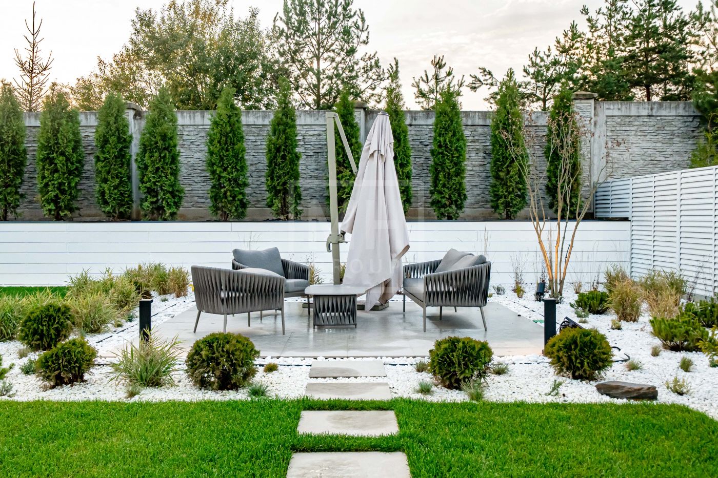 Этаж 1: Холл, гардеробная, гостевой санузел, кухня-столовая, гостиная со вторым светом и с выходом на террасу, зимний сад, мастер спальня с гардеробной и санузлом, постирочная, котельная, гараж на два машиноместа, навес на два машиноместа.