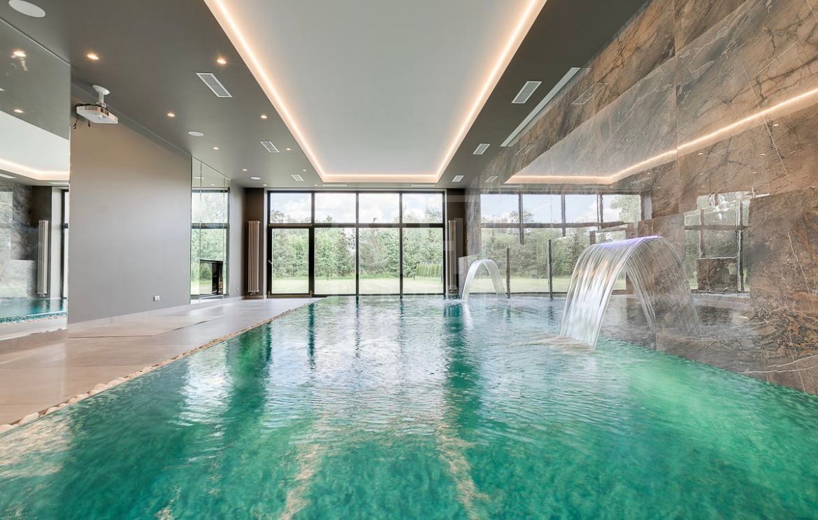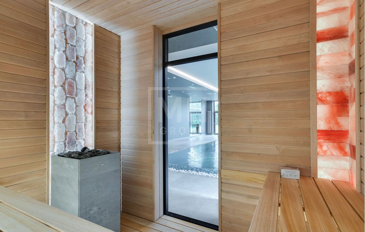 Этаж 1: Прихожая, гардеробная, гостиная-кухня-столовая с выходом на террасу, спальня с с/у и гардеробной, с/у, СПА-зона с бассейном, сауной, хамамом, душевой с с/у; постирочная, котельная, гараж,