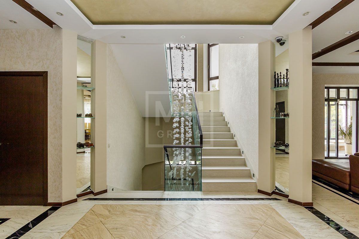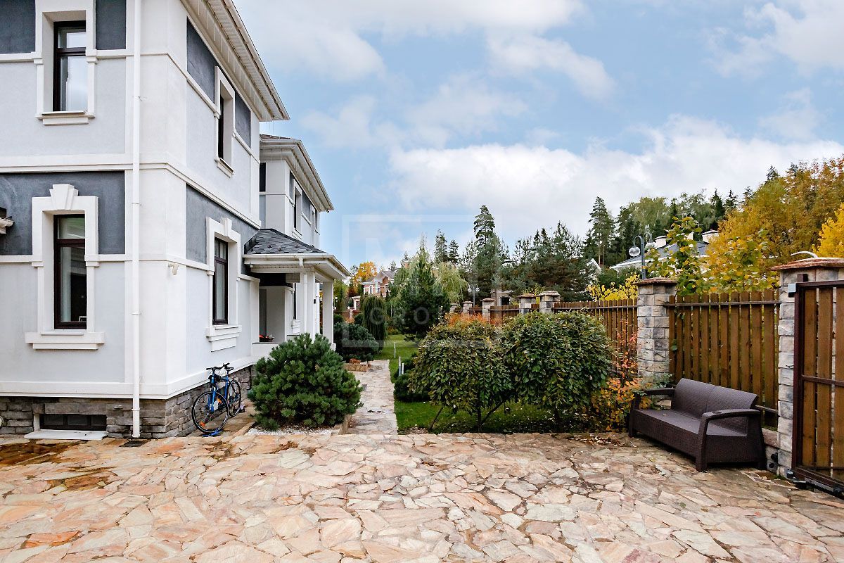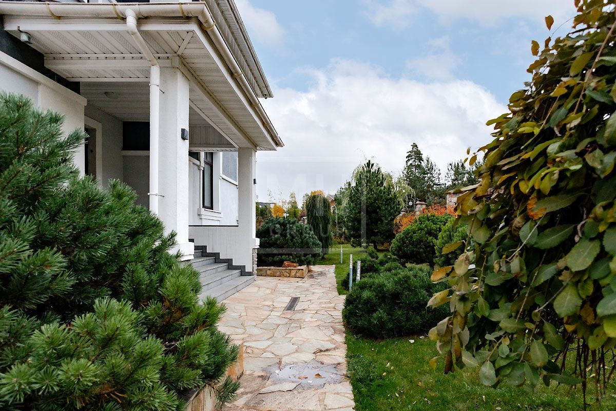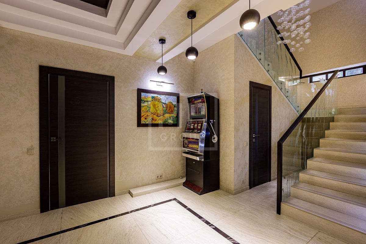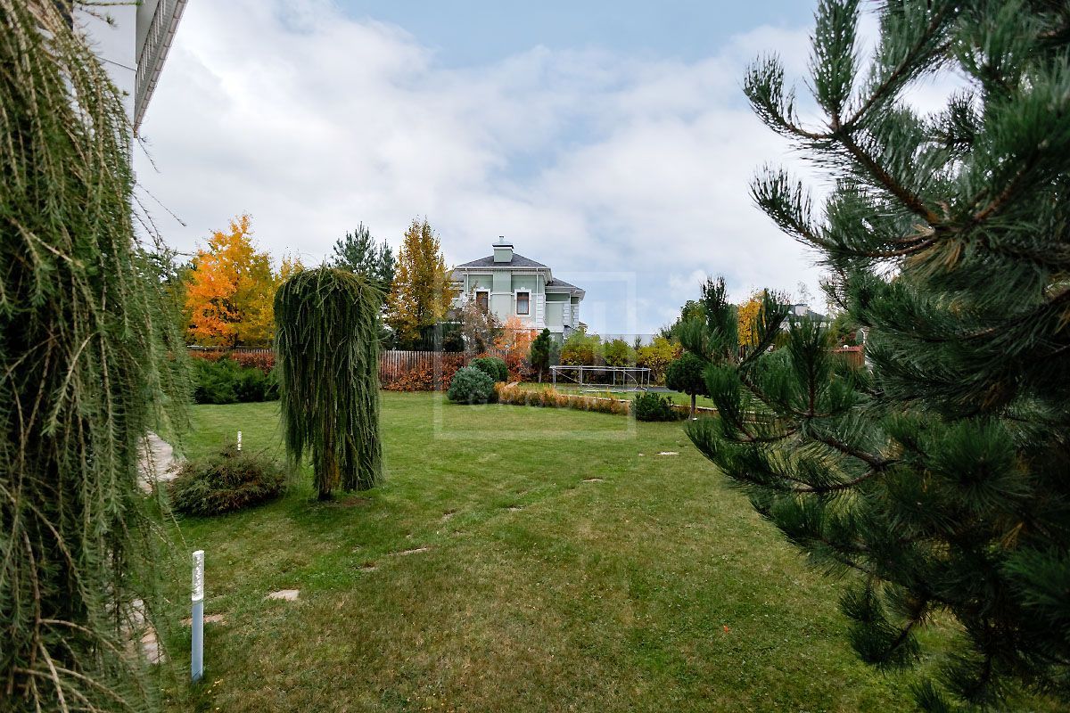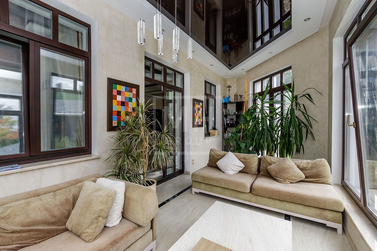 Большой современный дом в закрытом охраняемом посёлке с хорошей инфраструктурой. Расположен на тупиковой улице, примыкающей к лесу. Полностью меблирован и готов к проживанию. Высокие потолки. Из гостиной выход в зимний сад. Бар и тренажерный зал. Современный ремонт с использованием натуральных материалов: мрамор, дерево. Есть помещение для персонала. Охранная сигнализация, система видеонаблюдения. В котельной оборудование Buderus с обвязкой медью.Прилесной ухоженный участок с ландшафтным дизайном. На участке взрослые деревья. Летняя терраса 60 м2. Теплица 25 м2 с системой вентиляции, автополива, водой и электричеством. Система полива участка и деревьев. Подсветка участка и деревьев. Гараж на два автомобиля. Ливневая канализация. Все дорожки выложены из брусчатки. Есть площадка на два автомобиля.
