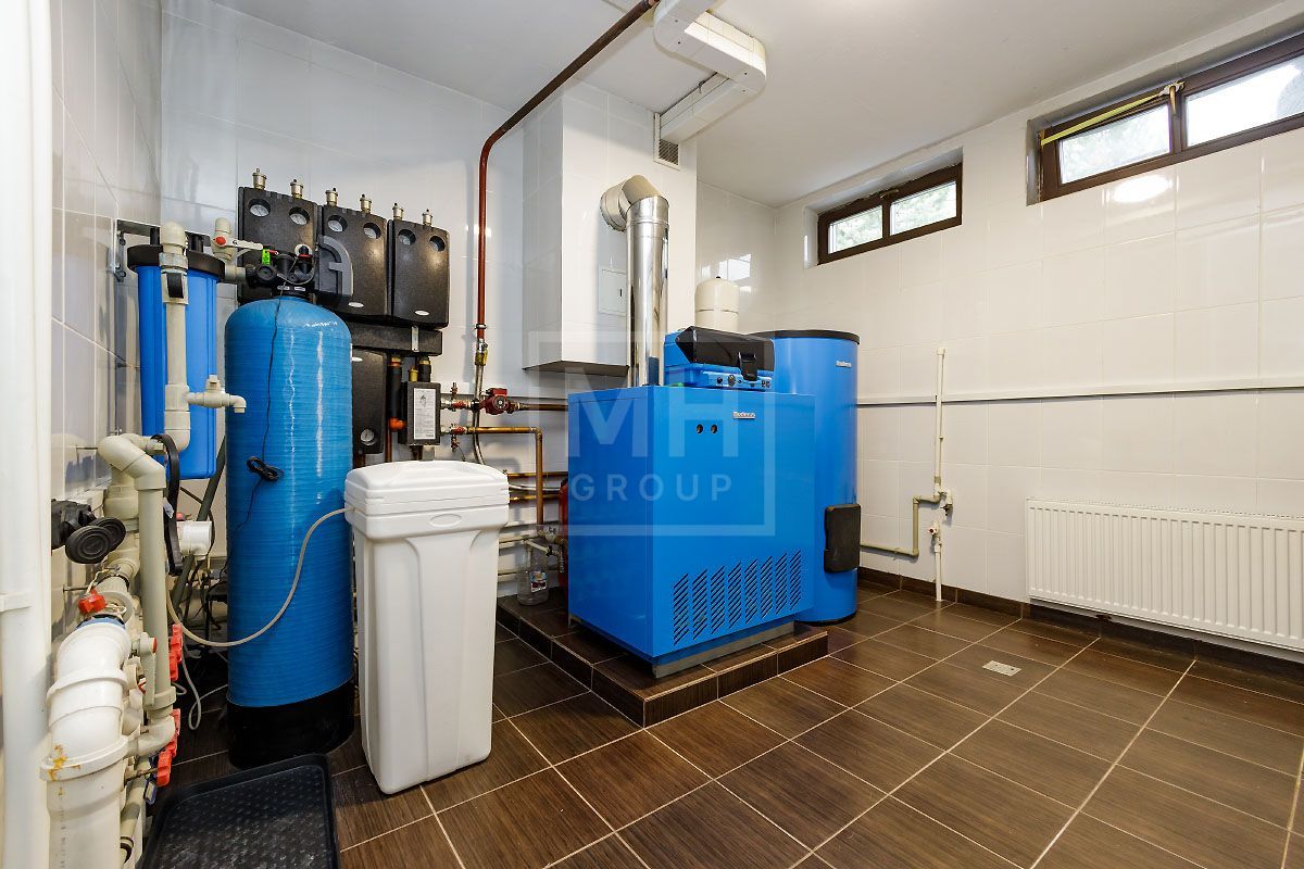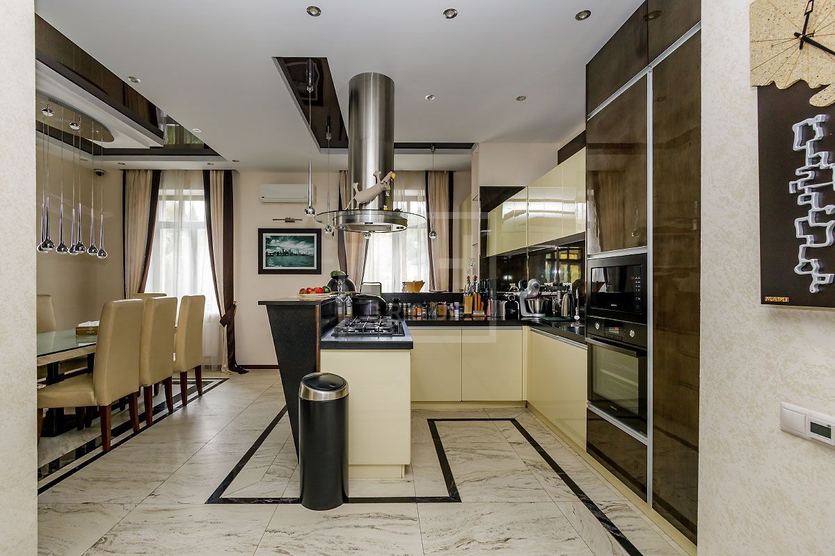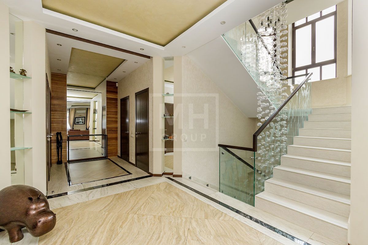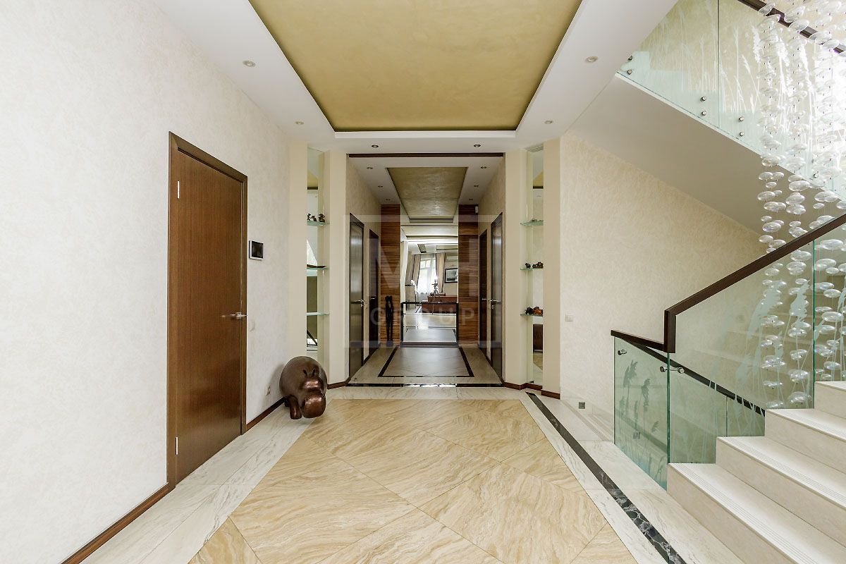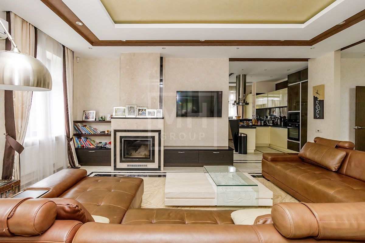 Большой современный дом в закрытом охраняемом посёлке с хорошей инфраструктурой. Расположен на тупиковой улице, примыкающей к лесу. Полностью меблирован и готов к проживанию. Высокие потолки. Из гостиной выход в зимний сад. Бар и тренажерный зал. Современный ремонт с использованием натуральных материалов: мрамор, дерево. Есть помещение для персонала. Охранная сигнализация, система видеонаблюдения. В котельной оборудование Buderus с обвязкой медью.Прилесной ухоженный участок с ландшафтным дизайном. На участке взрослые деревья. Летняя терраса 60 м2. Теплица 25 м2 с системой вентиляции, автополива, водой и электричеством. Система полива участка и деревьев. Подсветка участка и деревьев. Гараж на два автомобиля. Ливневая канализация. Все дорожки выложены из брусчатки. Есть площадка на два автомобиля.