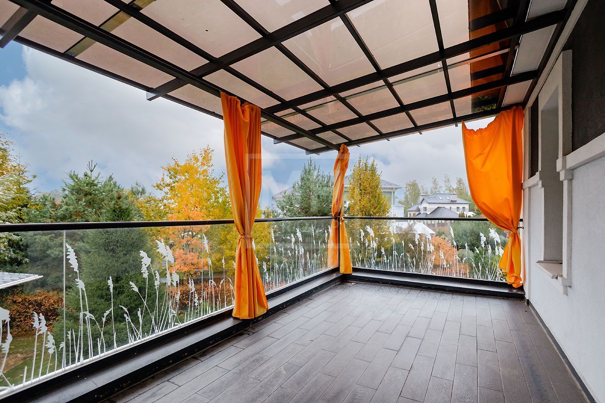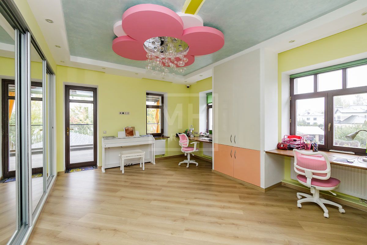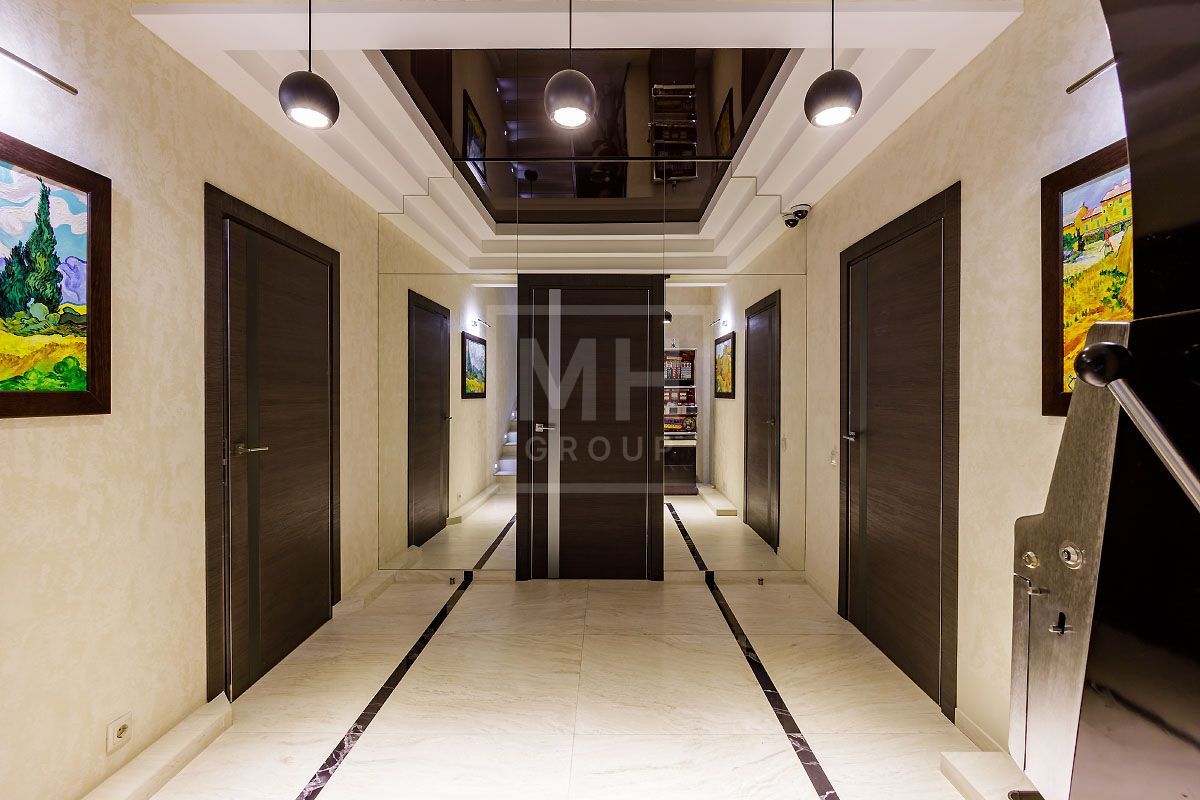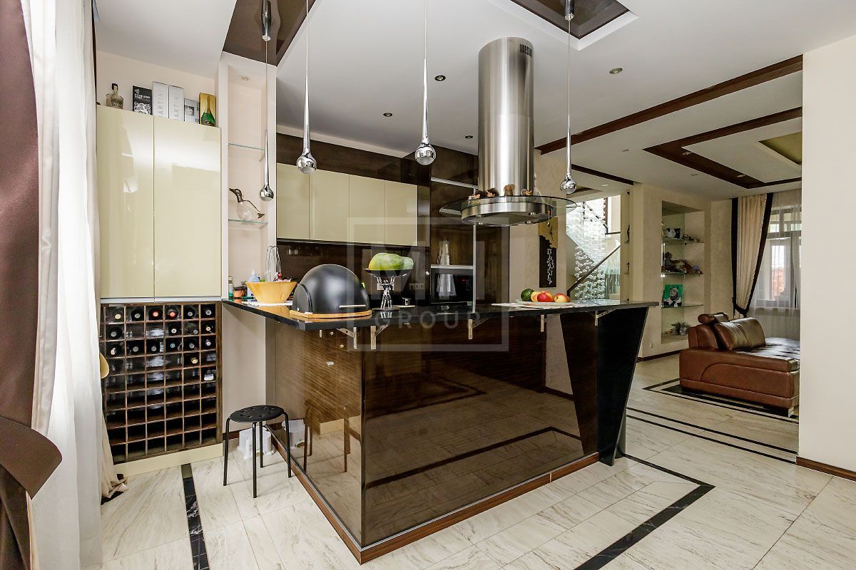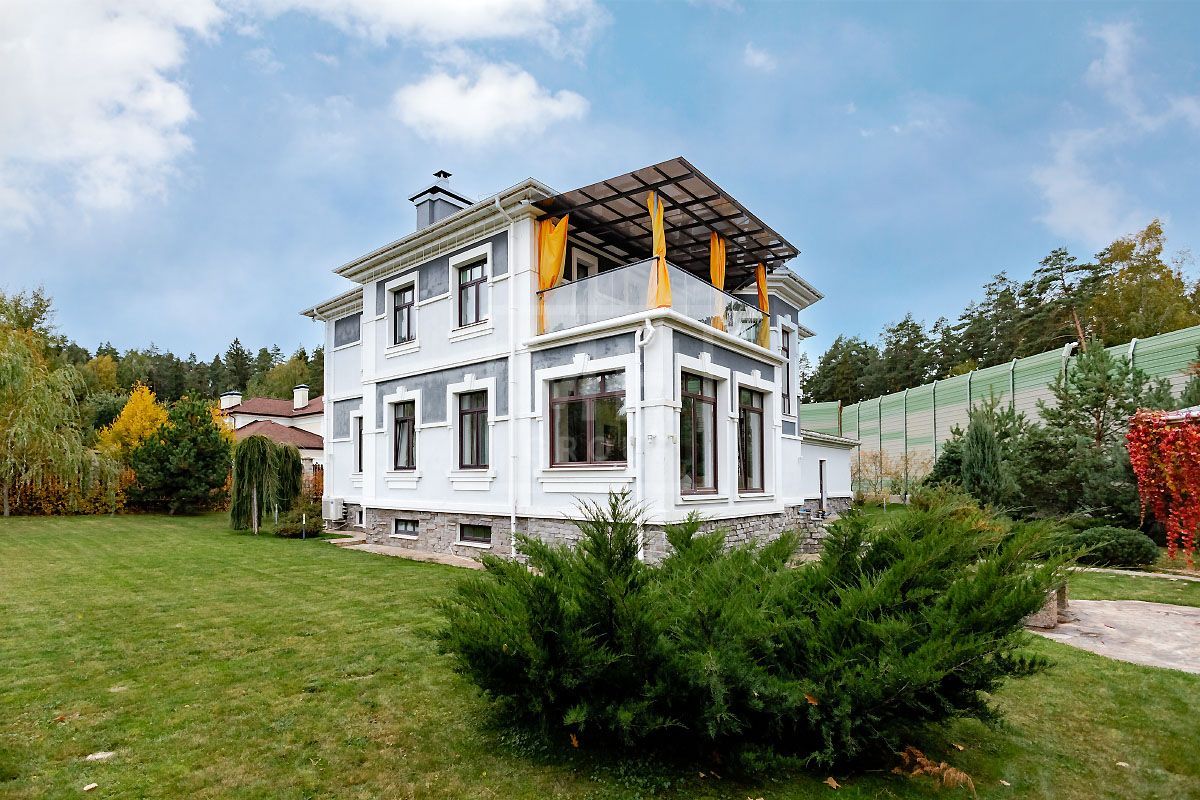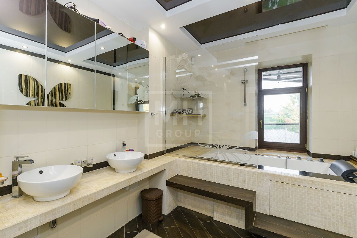 Большой современный дом в закрытом охраняемом посёлке с хорошей инфраструктурой. Расположен на тупиковой улице, примыкающей к лесу. Полностью меблирован и готов к проживанию. Высокие потолки. Из гостиной выход в зимний сад. Бар и тренажерный зал. Современный ремонт с использованием натуральных материалов: мрамор, дерево. Есть помещение для персонала. Охранная сигнализация, система видеонаблюдения. В котельной оборудование Buderus с обвязкой медью.Прилесной ухоженный участок с ландшафтным дизайном. На участке взрослые деревья. Летняя терраса 60 м2. Теплица 25 м2 с системой вентиляции, автополива, водой и электричеством. Система полива участка и деревьев. Подсветка участка и деревьев. Гараж на два автомобиля. Ливневая канализация. Все дорожки выложены из брусчатки. Есть площадка на два автомобиля.