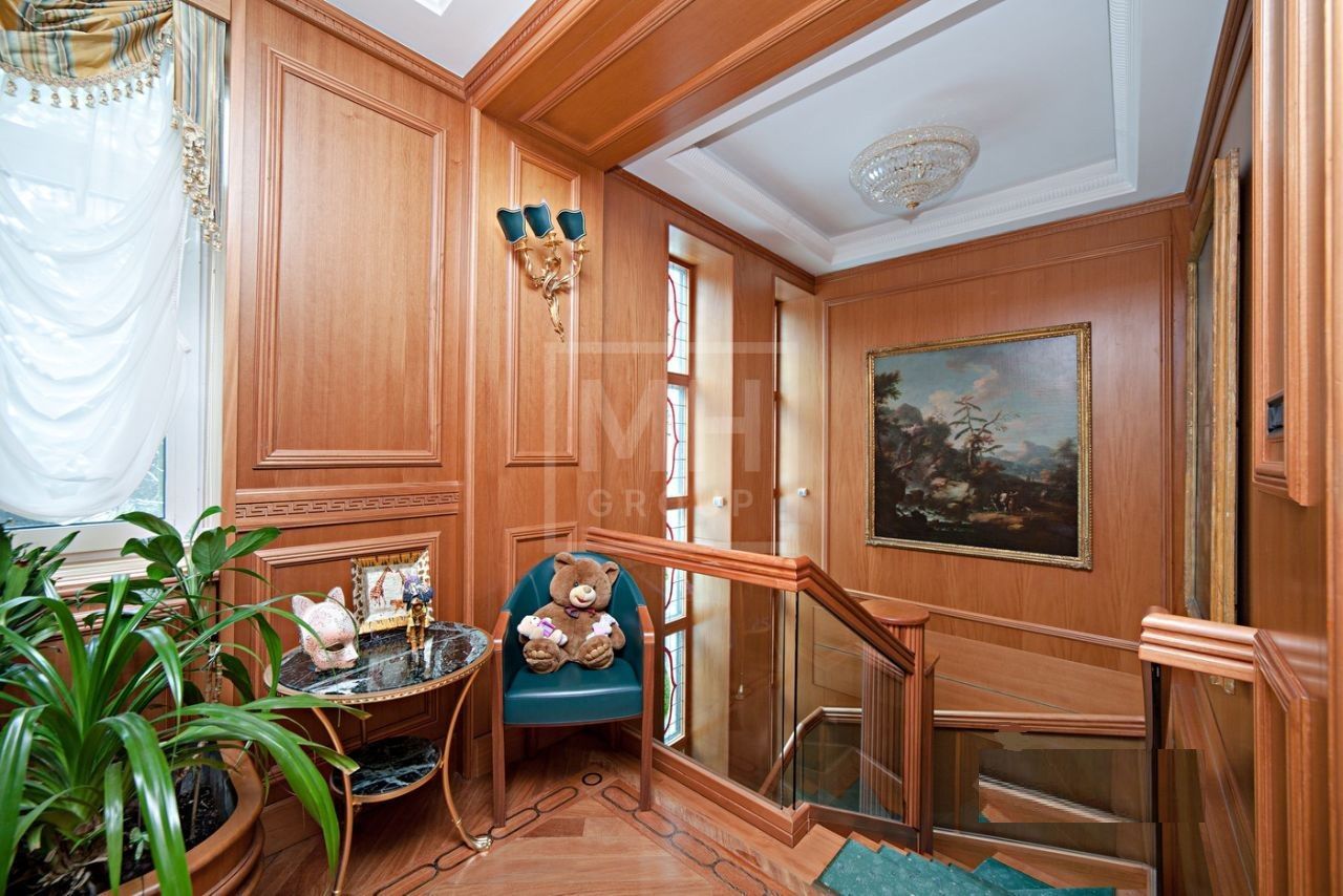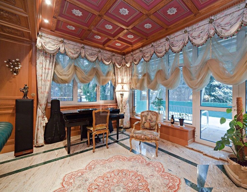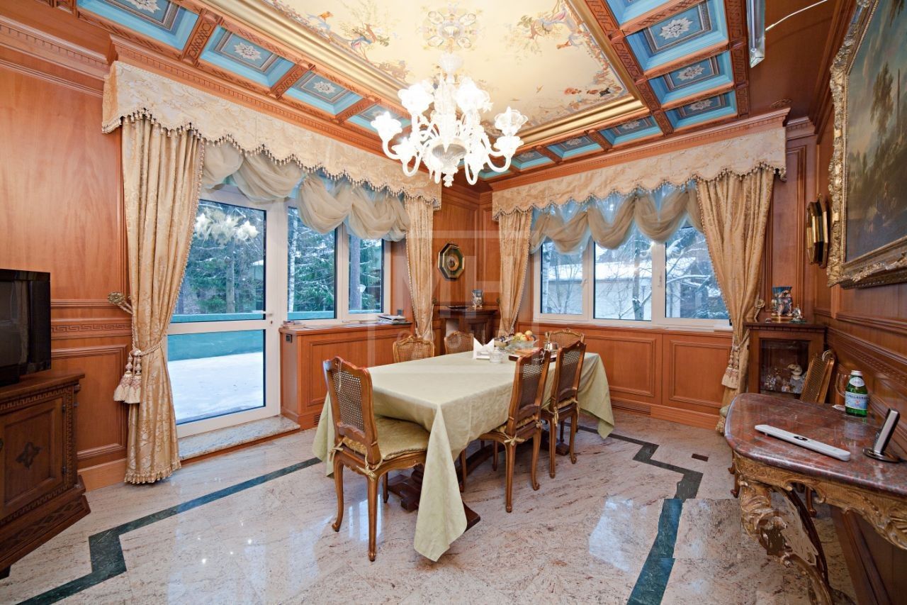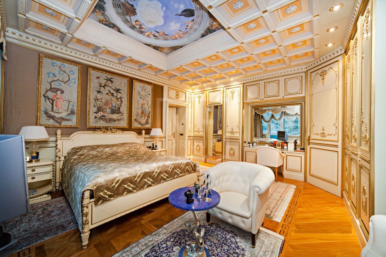 Прекрасный архитектурный ансамбль в старой доброй Академической Жуковке, вдали от шумных дорог, состоящий из основного дома, дома охраны и гостевого дома, а также спортивного комплекса с теннисным кортом. В отделке основного дома использованы дорогие сорта мрамора и дерева, витражи ручной работы, фрески на стенах и потолке, уникальные виды паркета и мебели, привезенные из Европы. Гостевой дом состоит из 2-х этажей: 1 этаж - холл, кухня , гостиная, с/у; 2 этаж - холл, 3 спальни, 2 с/у, Дом для охраны включает гараж и квартиру для персонала с 2-мя спальнями на втором этаже над гаражом.На участке расположен спортивный комплекс с теннисным кортом, бассейном, баром, с/у сауна, хамам, спортзал, профессиональная кухня.