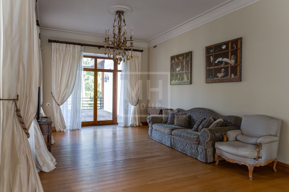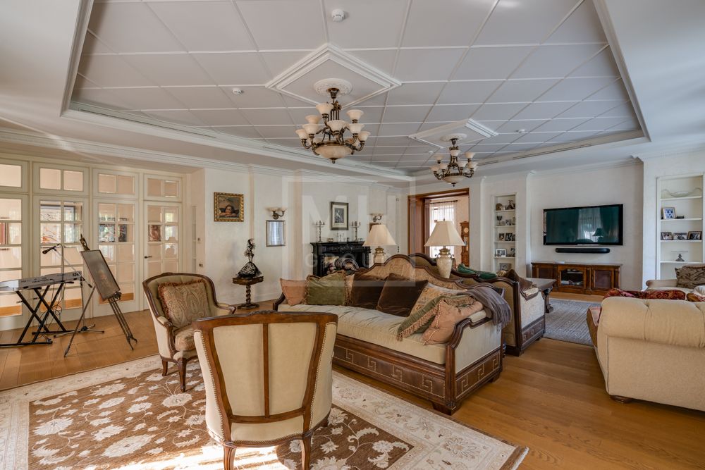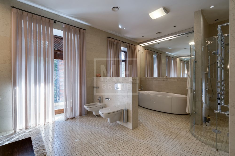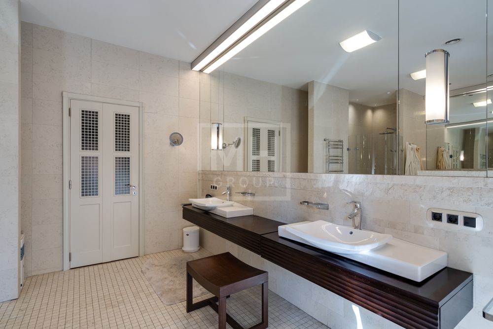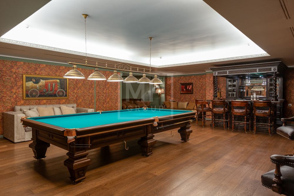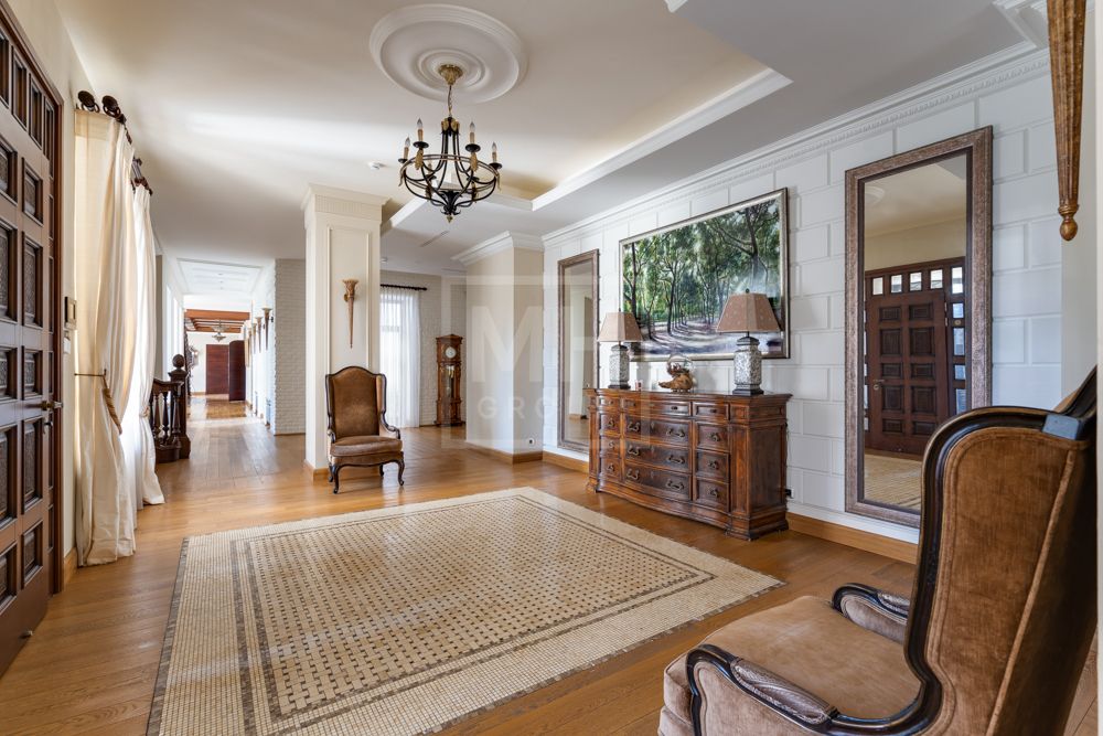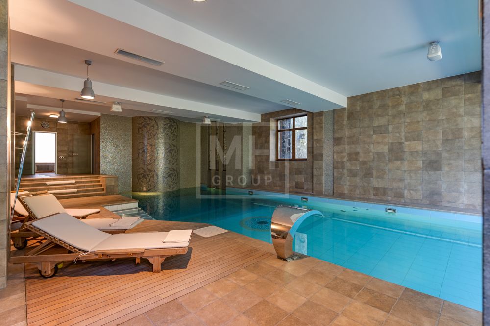 Предлагается великолепная под ключ с мебелью трехуровневая загородная резиденция, построенная на огромном живописном лесном участке с дорогим ландшафтным дизайном, в охраняемом коттеджном поселке "Мозжинка".Усадьба состоит из трех строений: основной дом, соединенный подземным проходом со служебным флигелем, в котором расположен гараж на шесть машин, также при въезде на территорию есть дом для охраны.