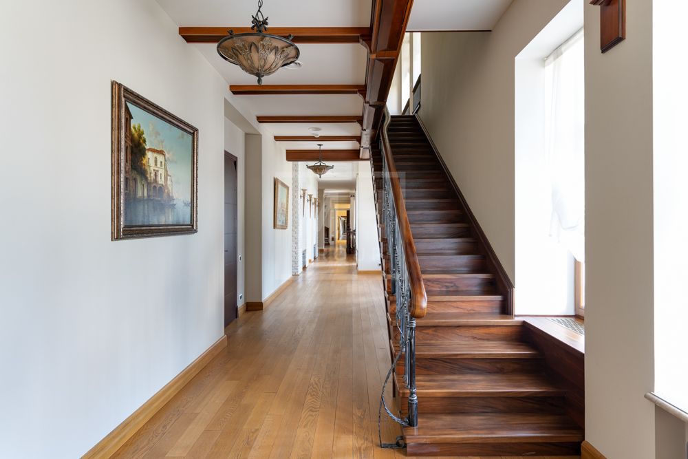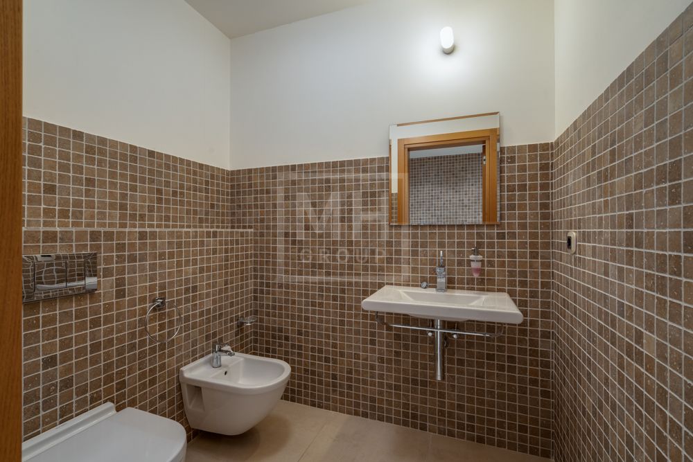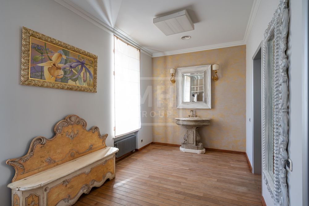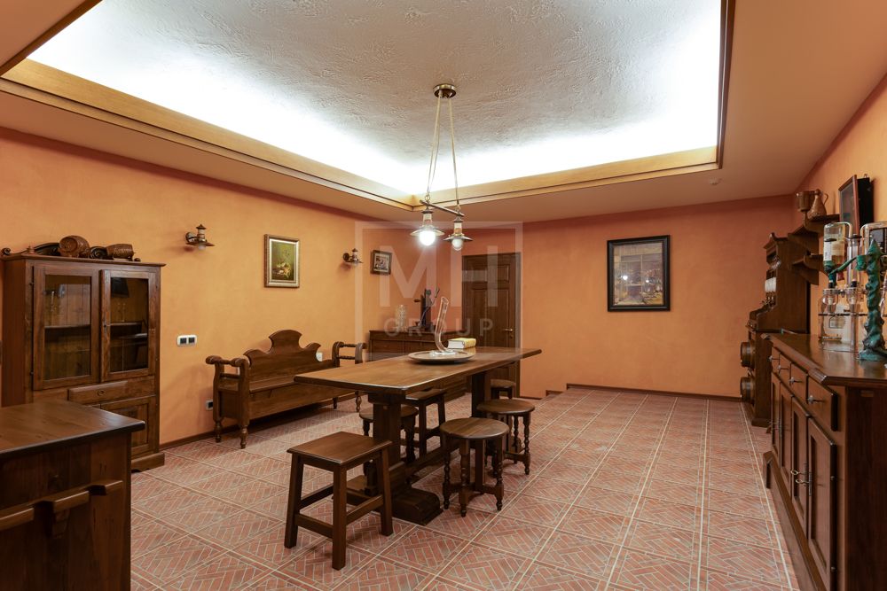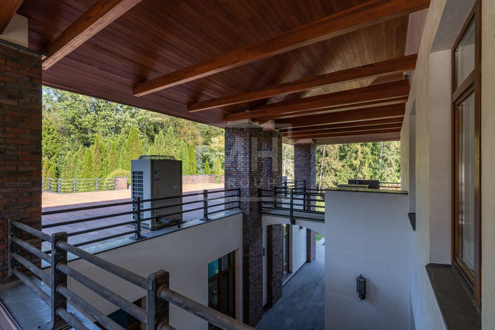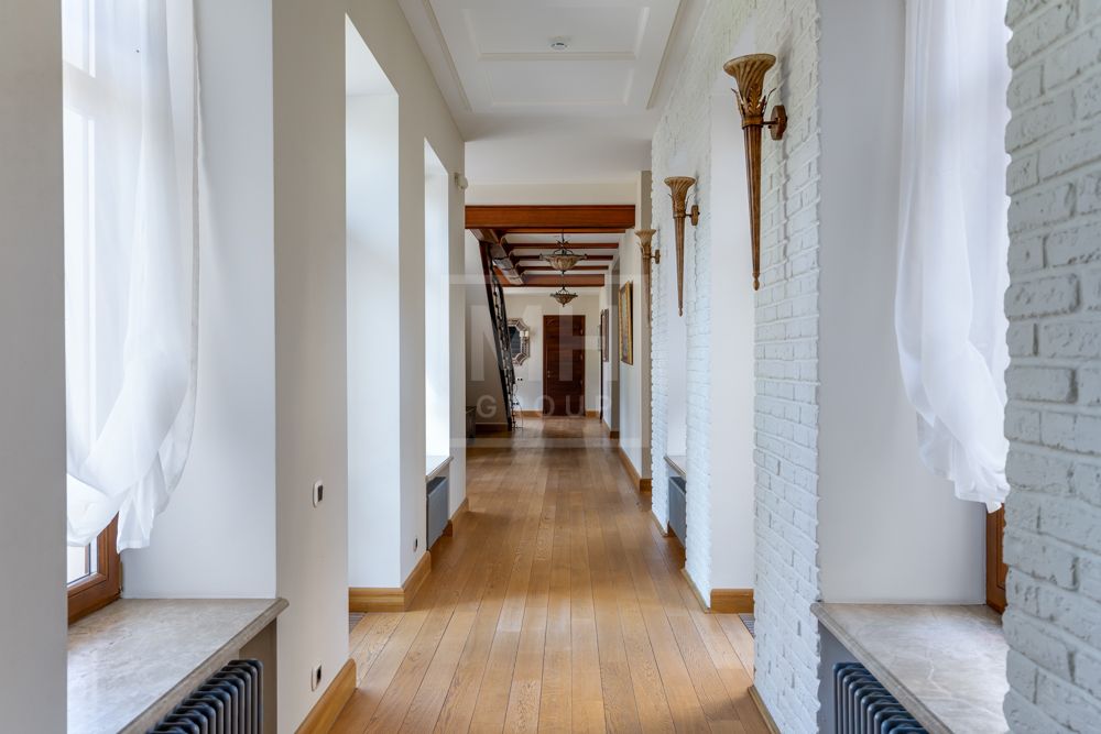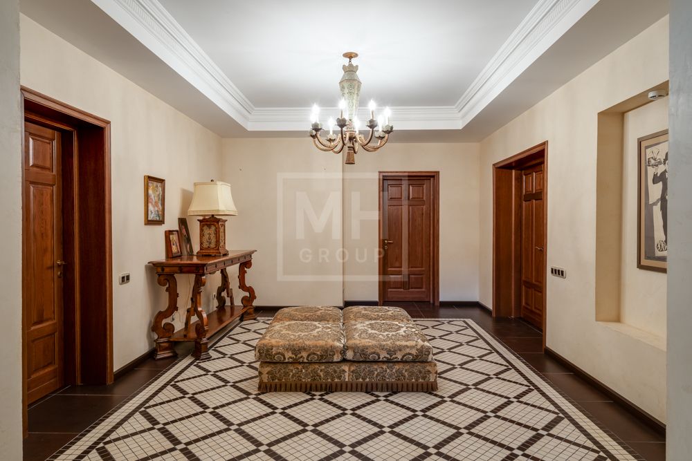 Основной дом (общая площадь 1763,70 кв. м) соединяется подземным проходом со служебным флигелем, в котором расположен гараж на 6 машин, и при въезде на территорию есть дом для охраны.