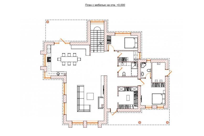 Этаж 1: холл, гардеробная, кухня- столовая , гостиная с камином, гостевая спальня с су, спальня, гардеробная, котельная.