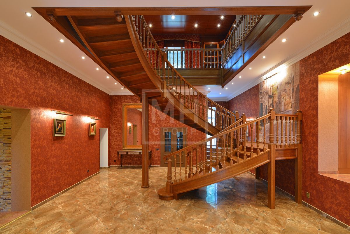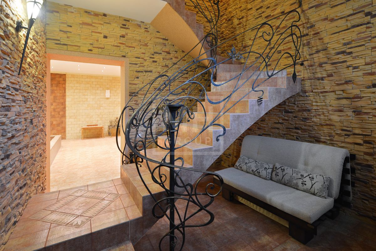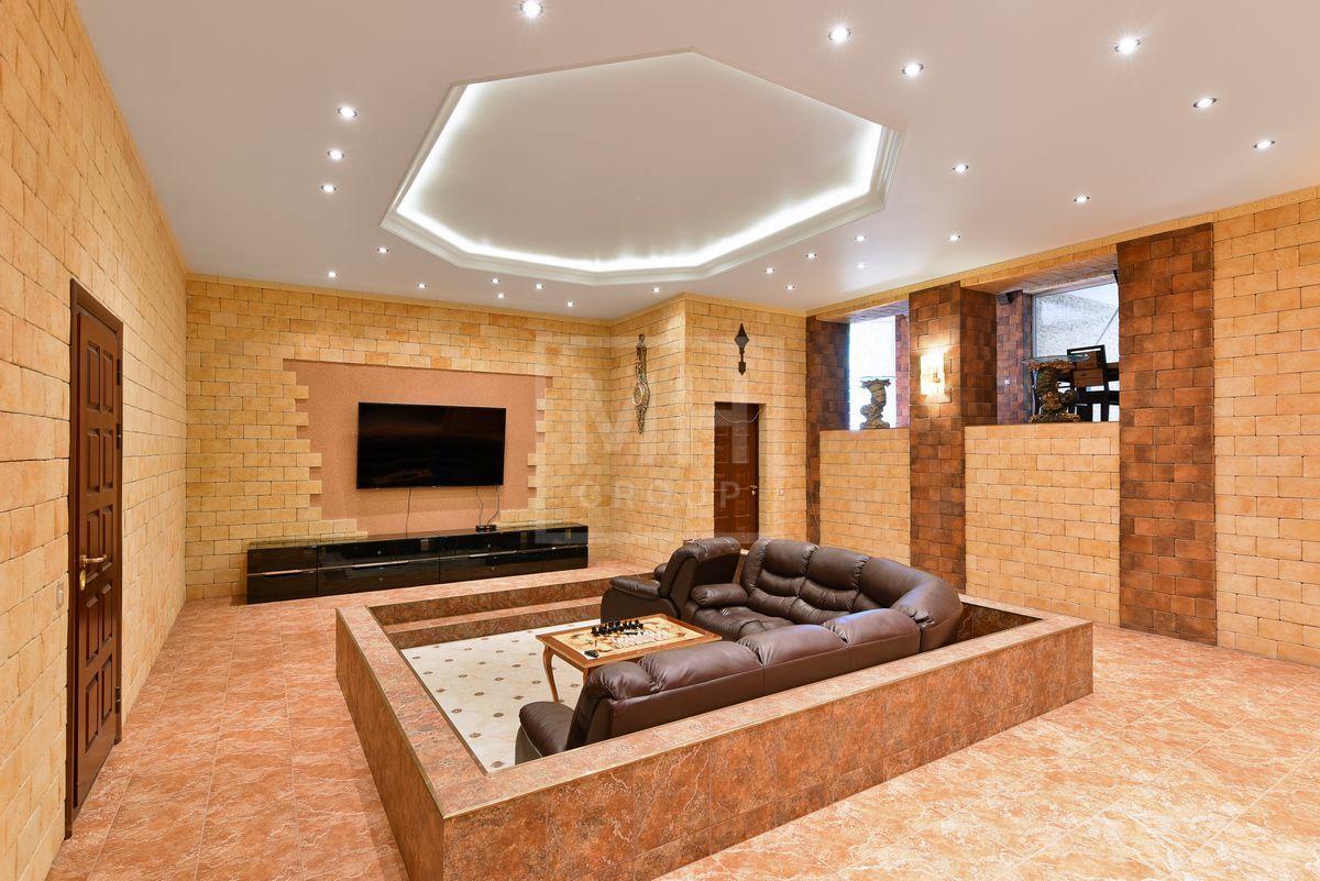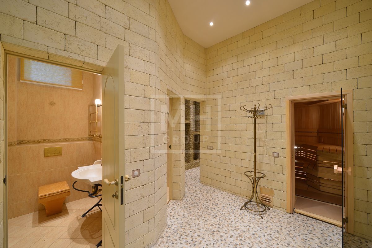 Цоколь: Каминный зал, домашний кинотеатр, летняя столовая с зоной BBQ и выходом на террасу, тренажерный зал, СПА зона: бассейн 8*4м с противотоком, сауна, 2 душевые, с/у; винный погреб, котельная, постирочная