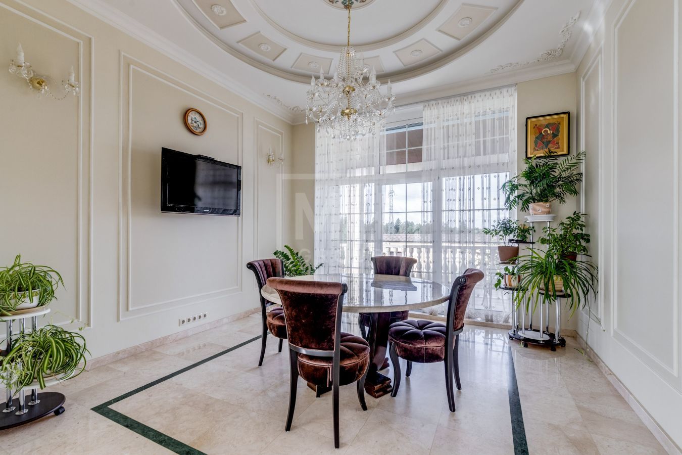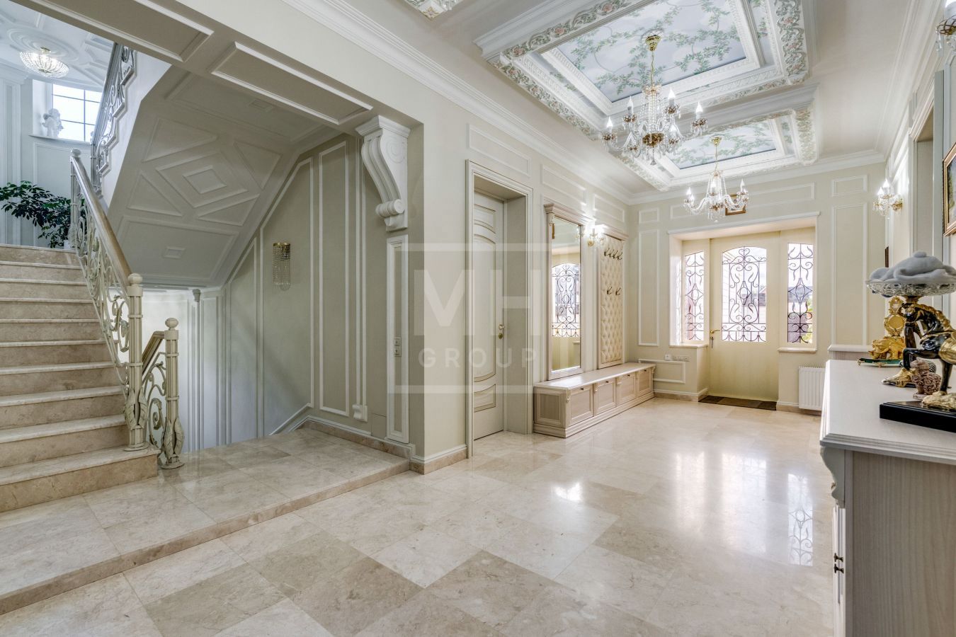Рублево-Успенское шоссе, 13 км.от МКАД. Село Лайково. Удобный выезд на платное шоссе.Коттедж 950 кв.м. с фонтаном из розового мрамора, участок 20 соток. Фундамент и перекрытия-монолит. Дом-кирпич. Отделка фасада песчаник. Балясины на фасаде-травертин. Красивые видовые характеристики