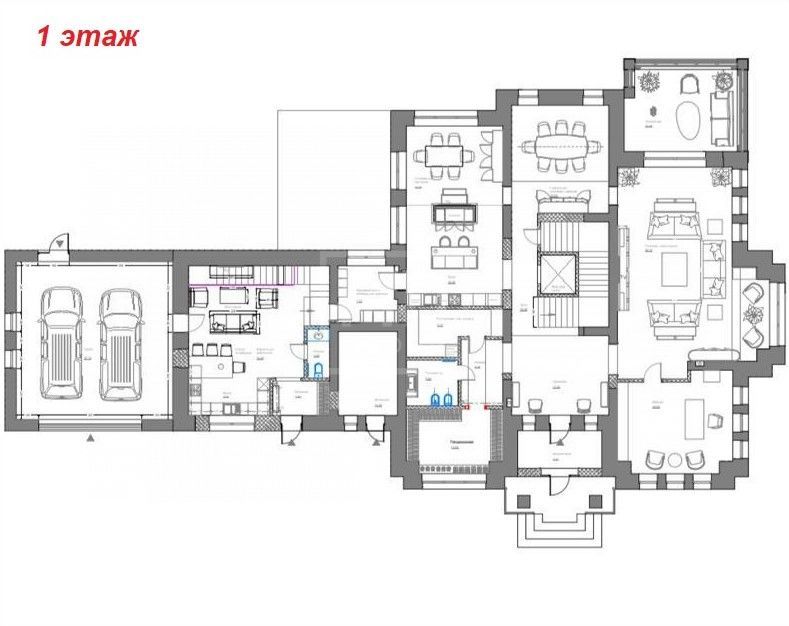 Этаж 1: холл со вторым светом, с/у, кухня со столовой зоной, столовая для приема гостей, гостиная, кабинет, патио, тех. помещения, гараж с переходом в блок для персонала с 2 спальнями, 2 с/у и технической кухней