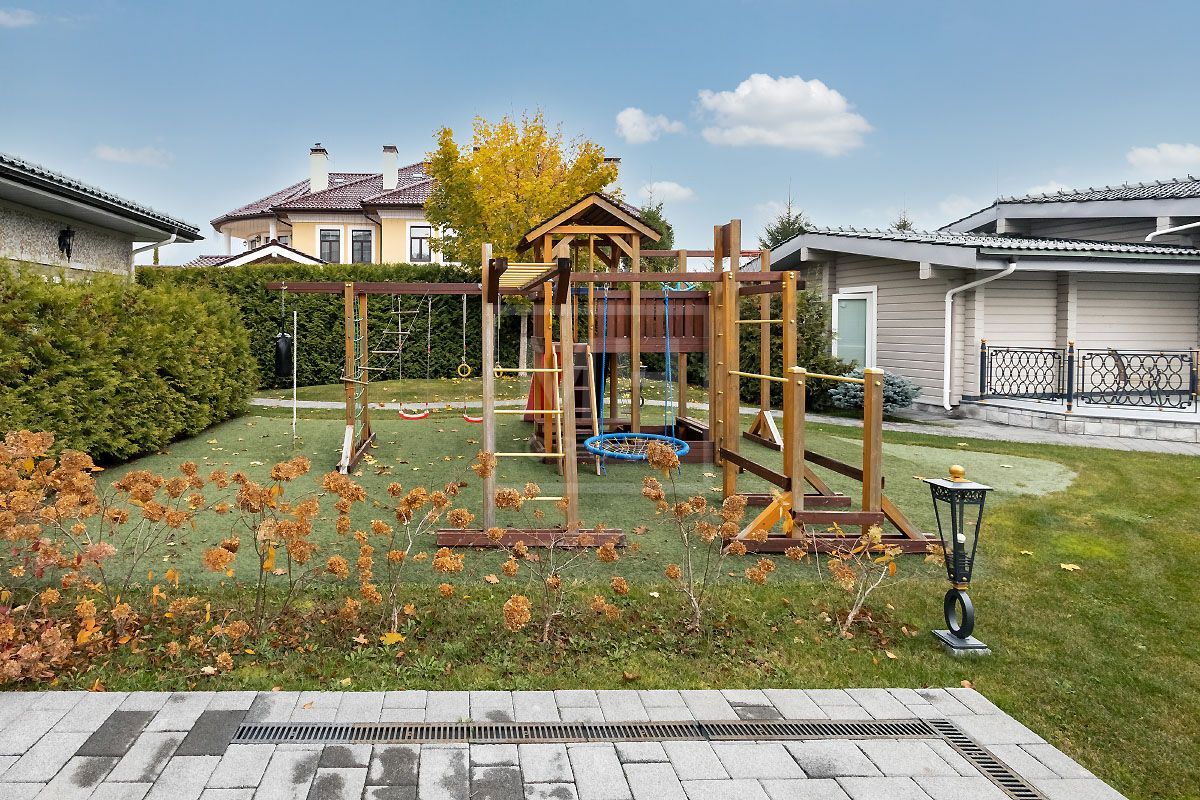 На территории участка есть также гостевой дом с баней, просторной зоной отдыха, двумя спальнями и санузлом и установлена детская игровая площадка.