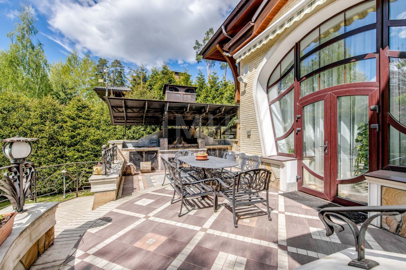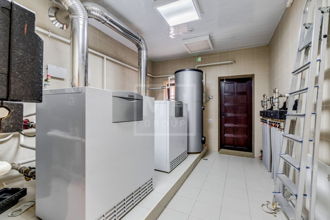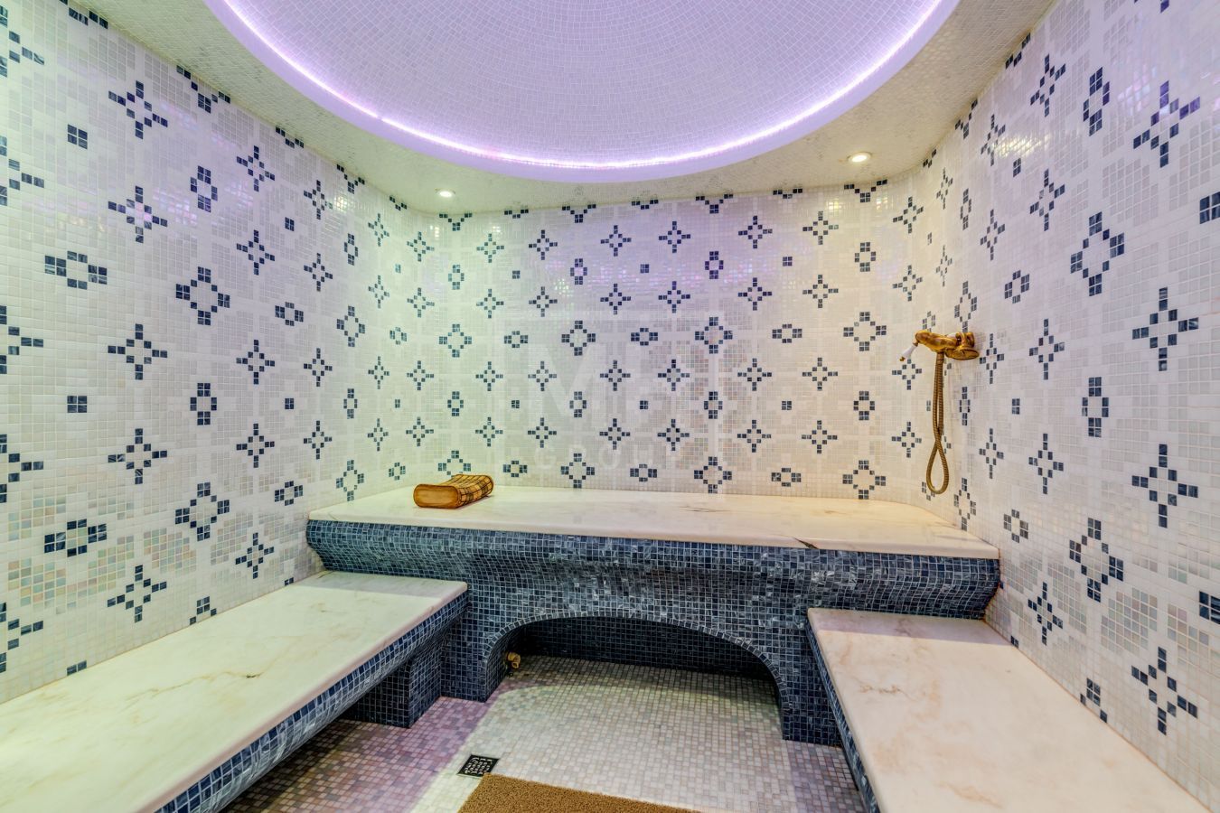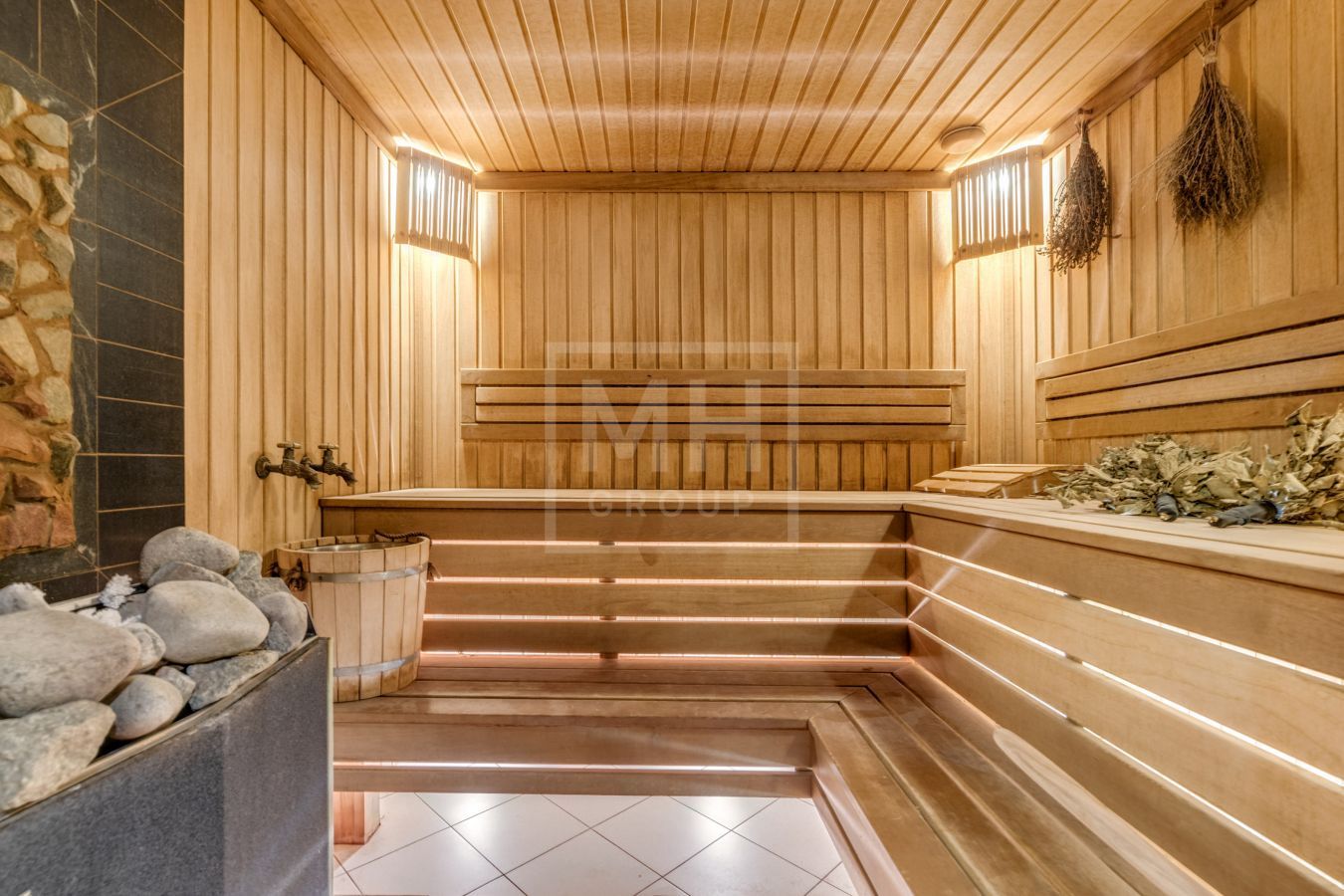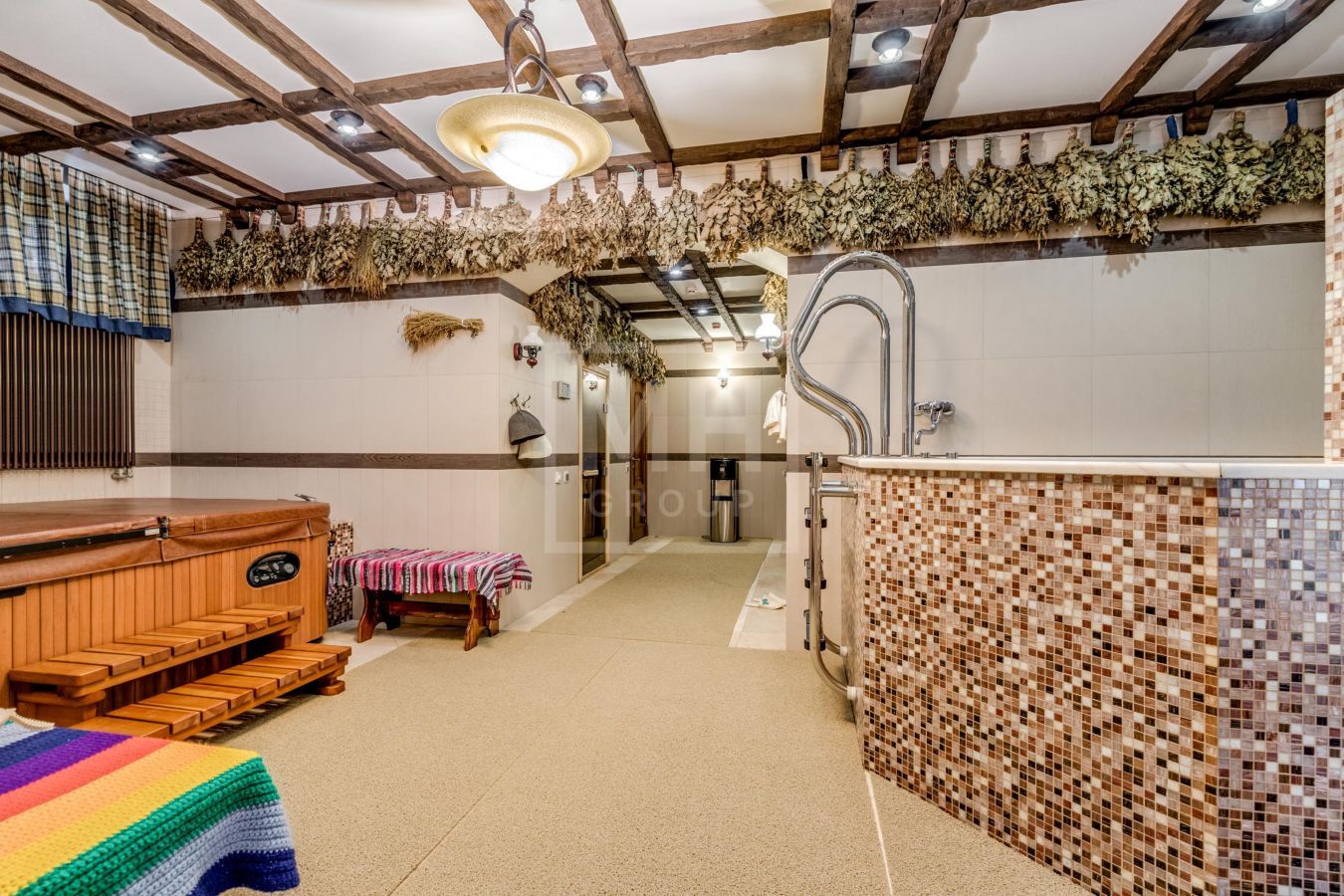 В доме организован банный комплекс с сауной, купелью, хаммамом, джакузи и комнатой отдыха со своей кухней, каминным залом и массажным кабинетом.