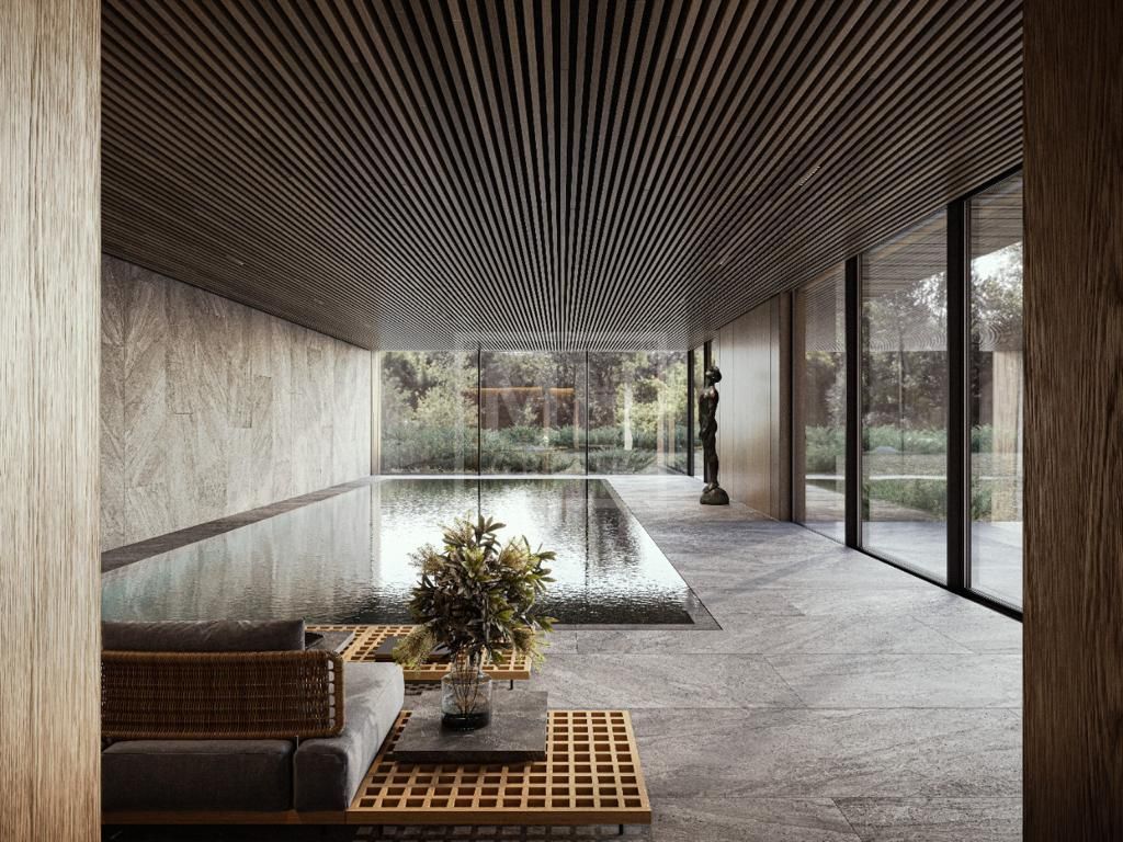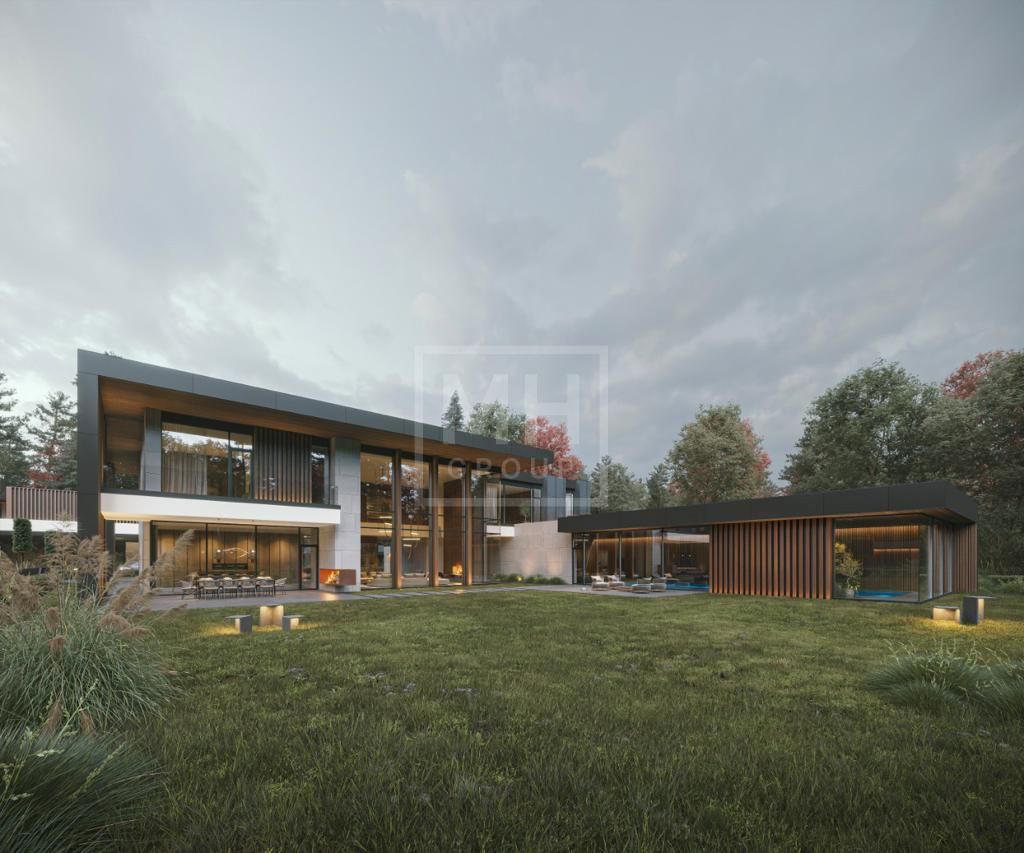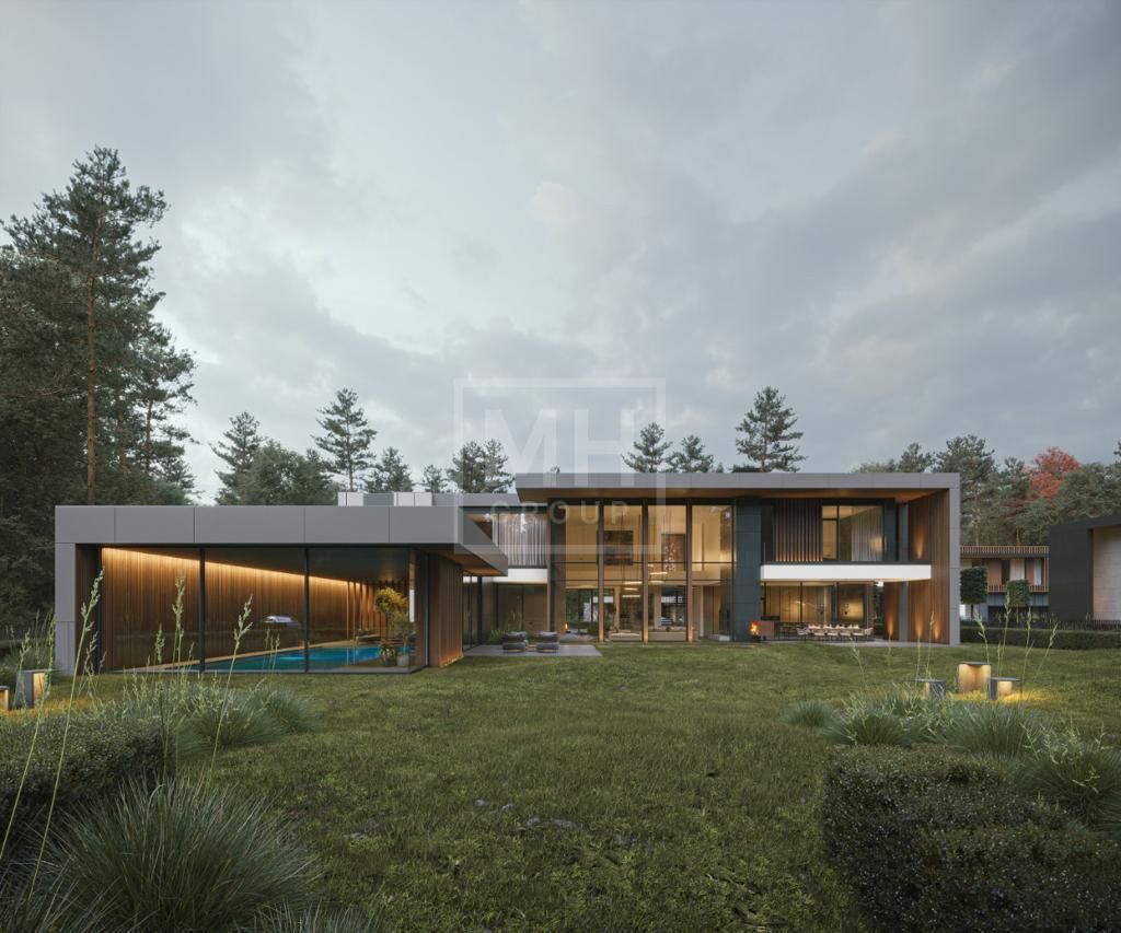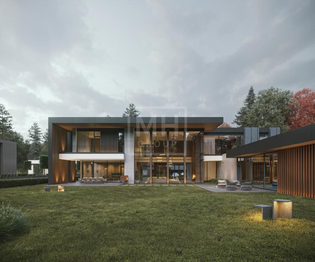 Этаж 1: Холл, гардеробная, с/у, гостинная, кухня-столовая, рабочая кухня, спальня с гардеробной и с/у, холл, СПА-зона, (бассейн, сауна, раздевалка, массажная, с/у), гараж на 2 м/м с кладовой, квартира для персонала с 2-мя спальнями, кухней и с/у, котельная.