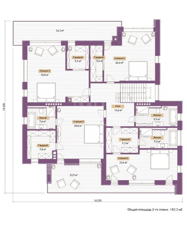 Этаж 2: мастер спальня с с/у и гардеробной, спальня с с/у и гардеробной, 2 спальни с гардеробными, с/у