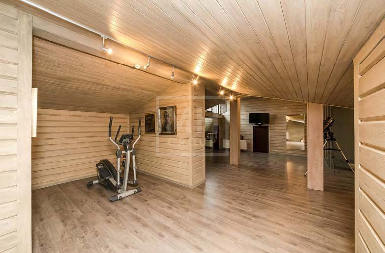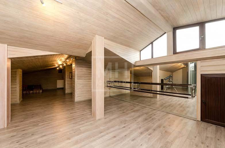 Мансарда: оборудована под игровую зону и спортзал, имеются тренажеры, вдоль стены установлен балетный станок. На полу натуральная деревянная доска.