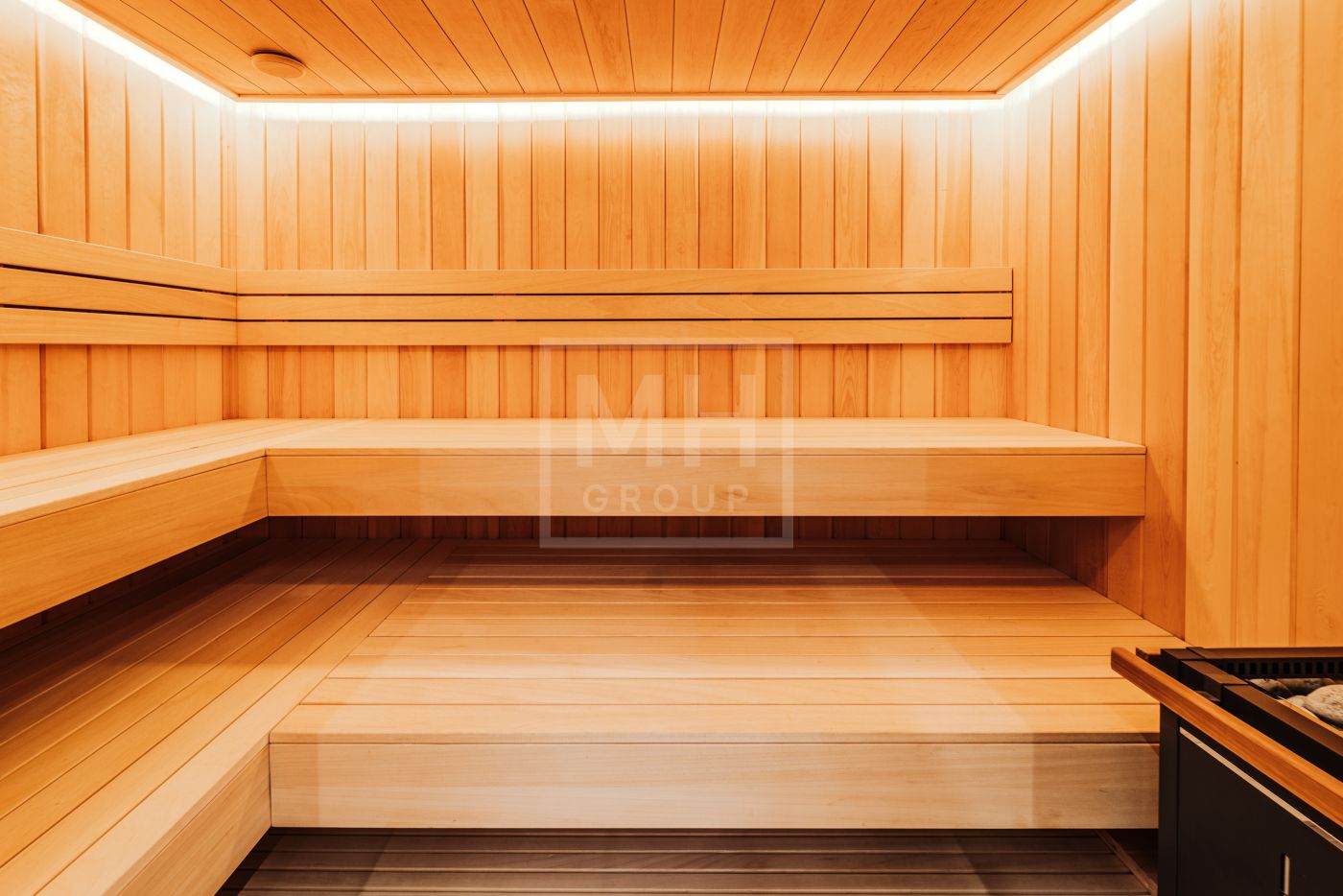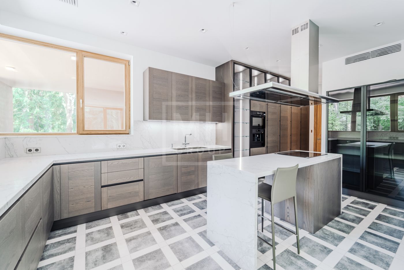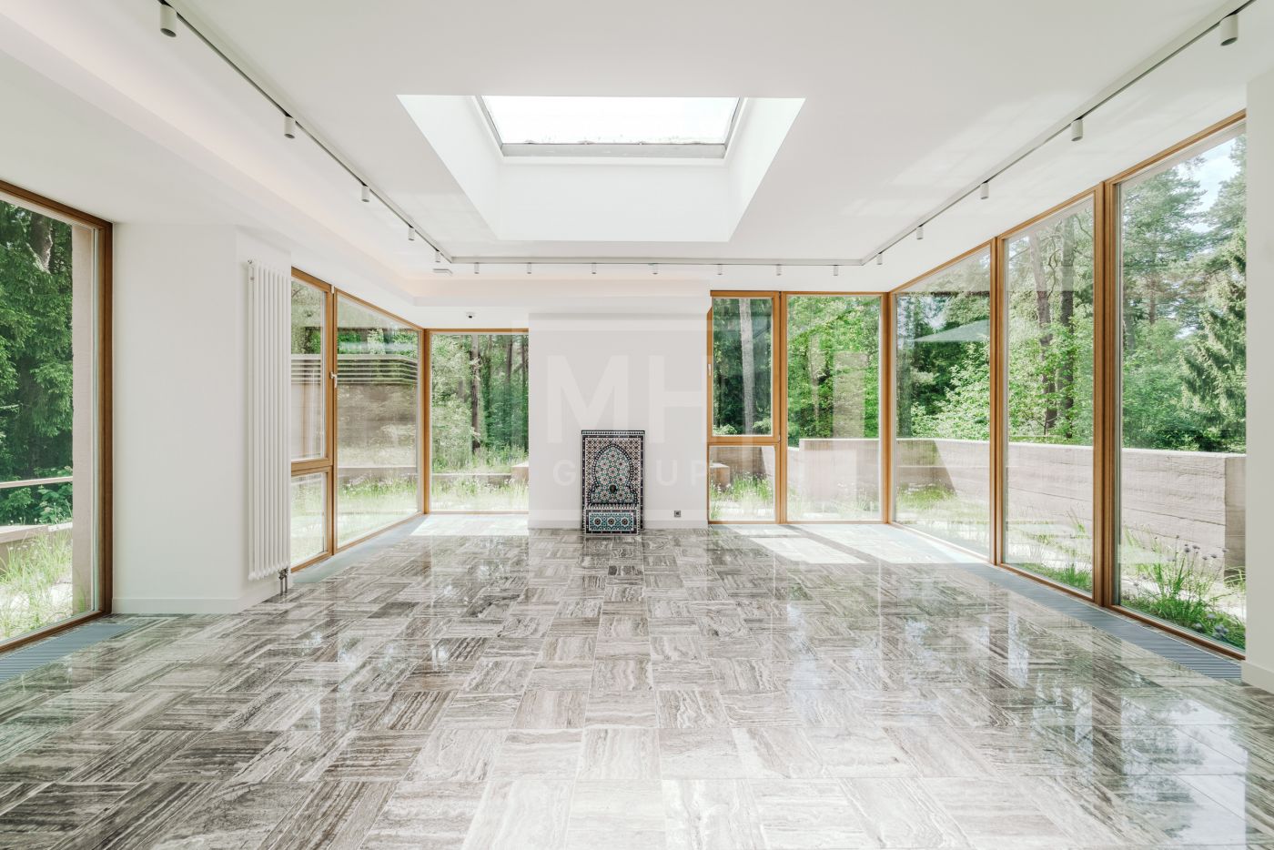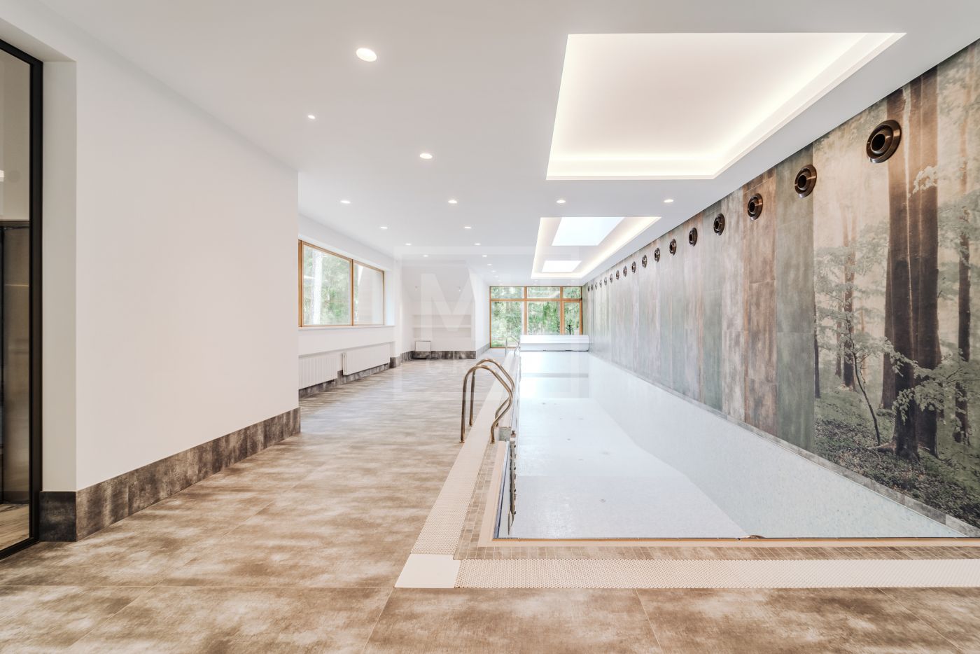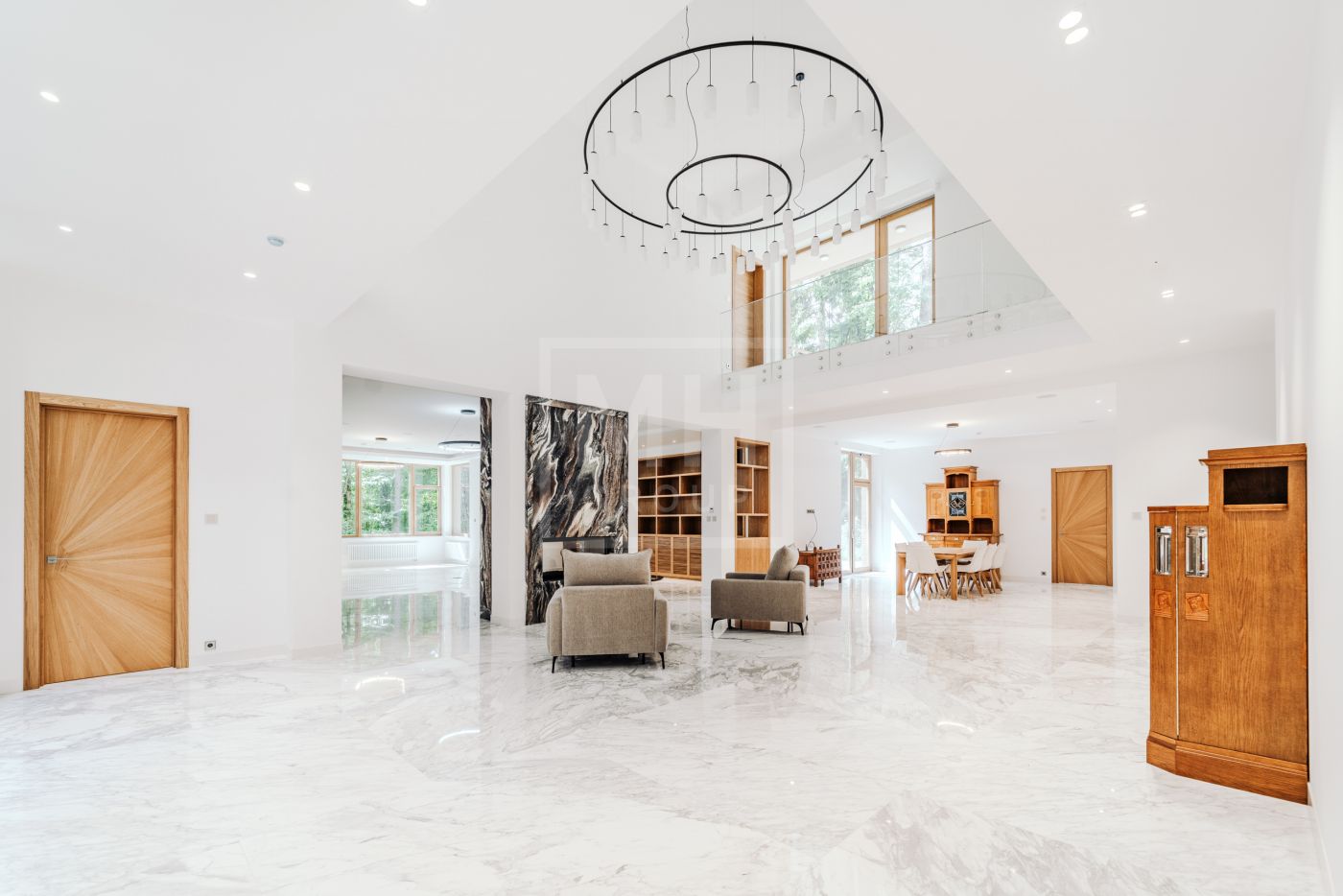 Этаж 1: прихожая, холл, гардеробная, гостевой с/у, гостиная с камином, кухня-столовая с выходом на летнее патио, гостевая спальня, спа-зона с сауной и бассейном (20 м) и душевой