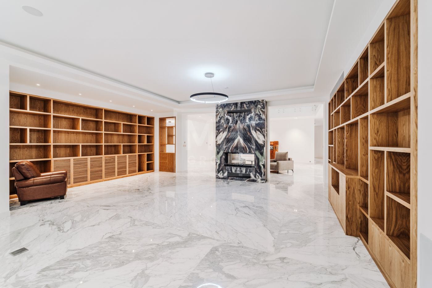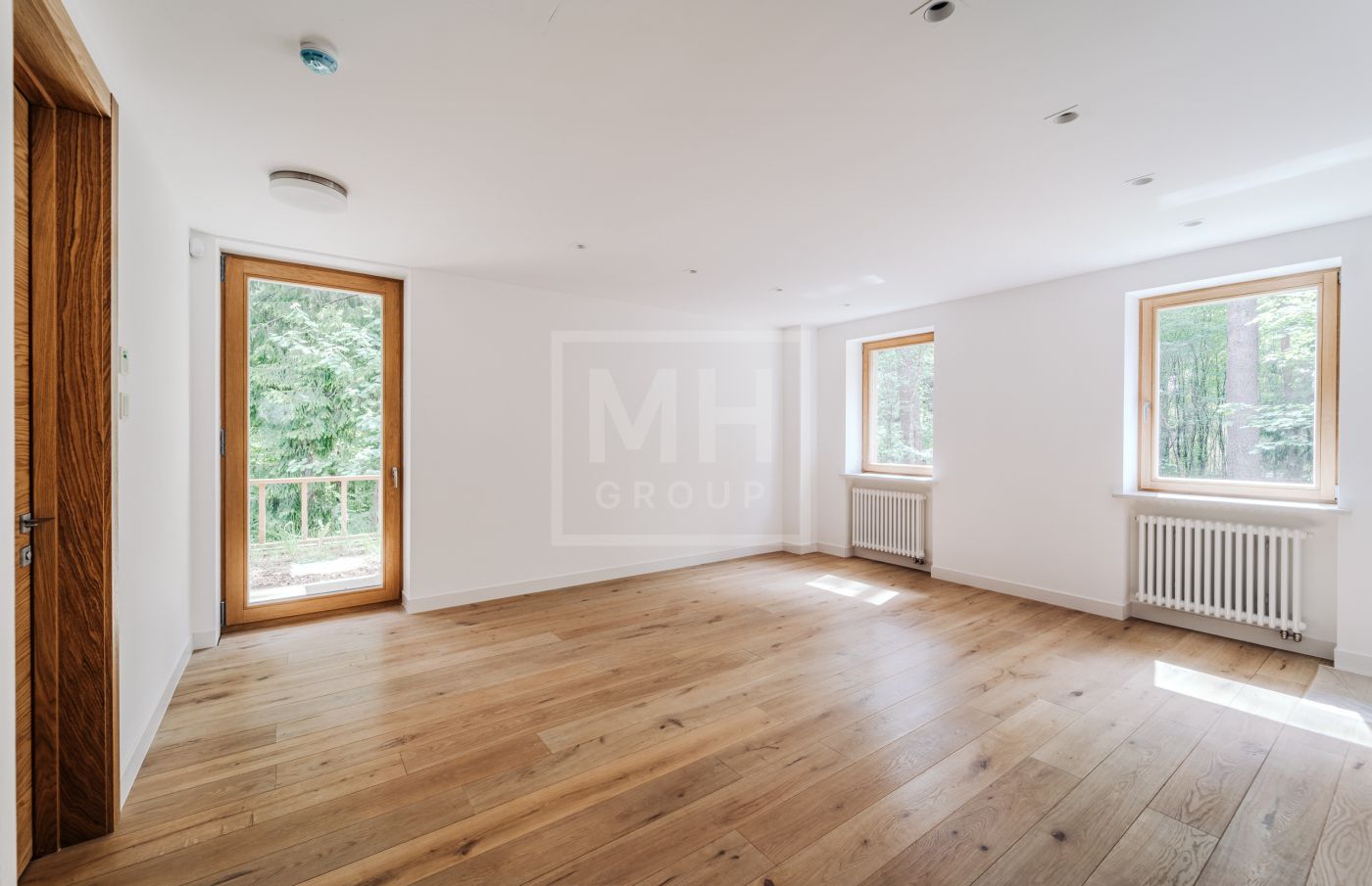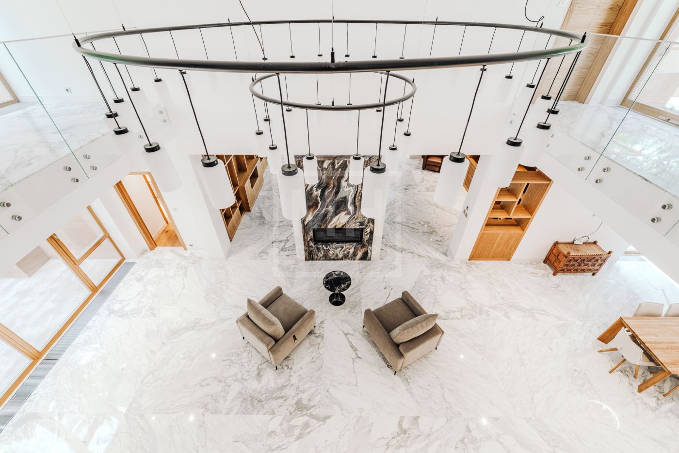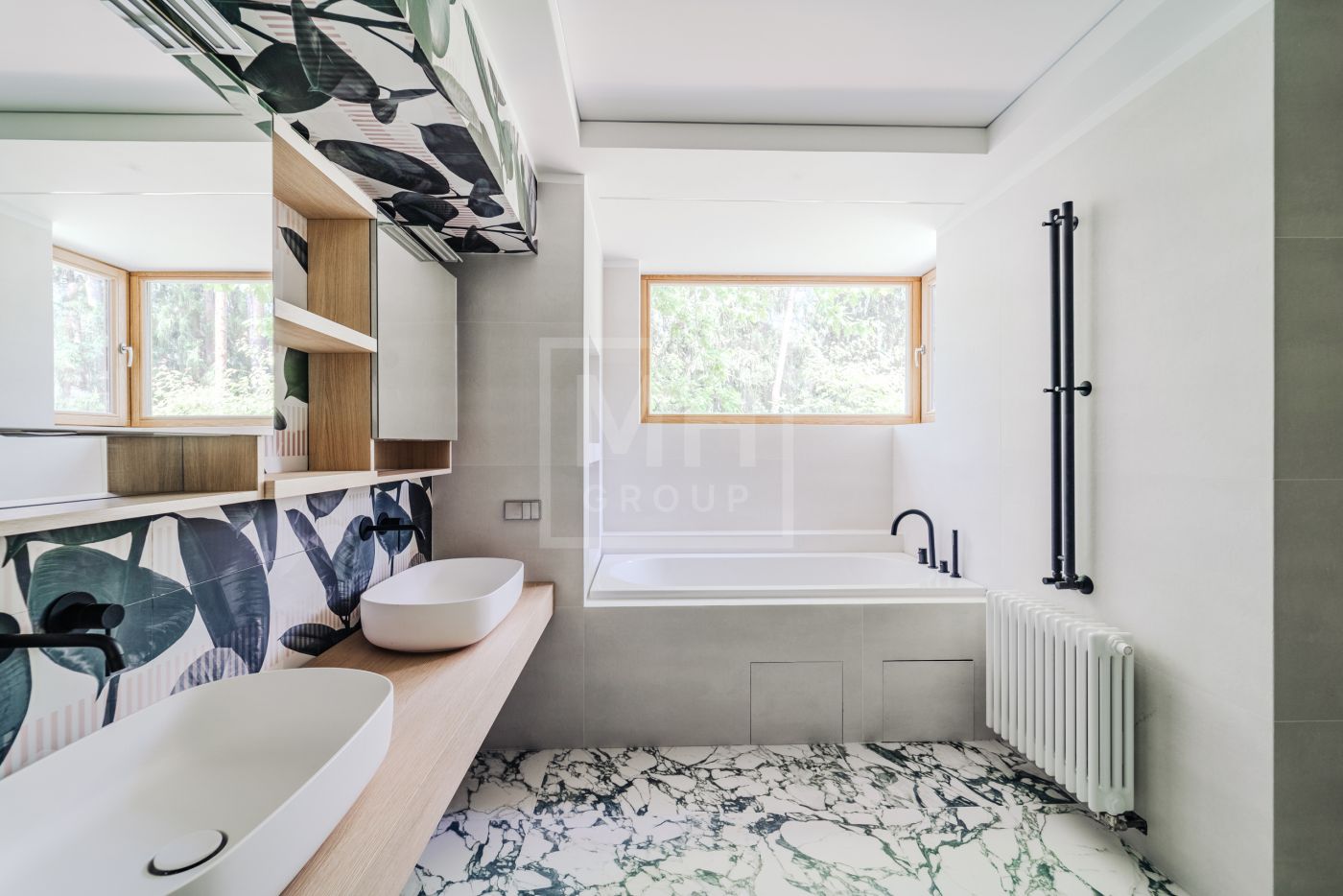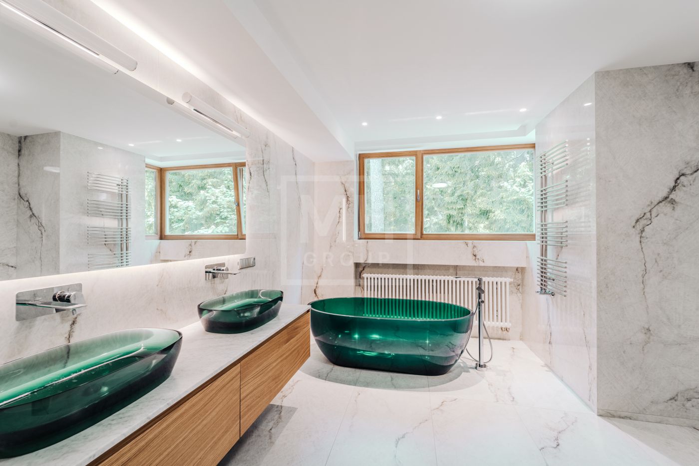 Этаж 1: прихожая, холл, гардеробная, гостевой с/у, гостиная с камином, кухня-столовая с выходом на летнее патио, гостевая спальня, спа-зона с сауной и бассейном (20 м) и душевой