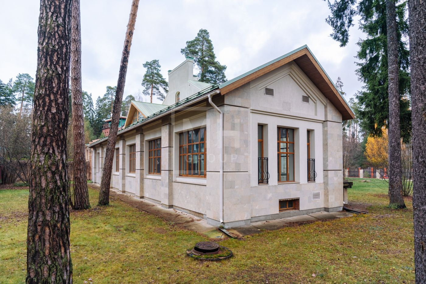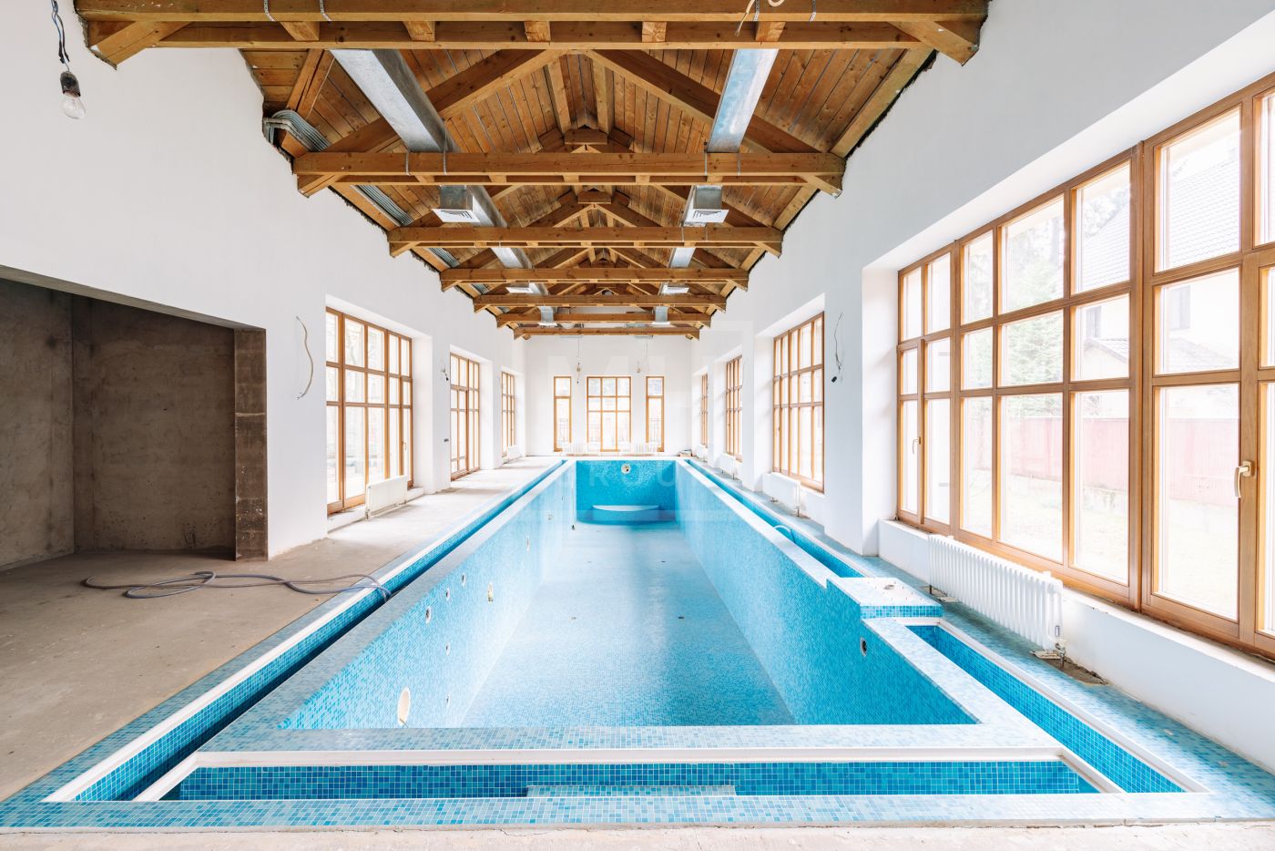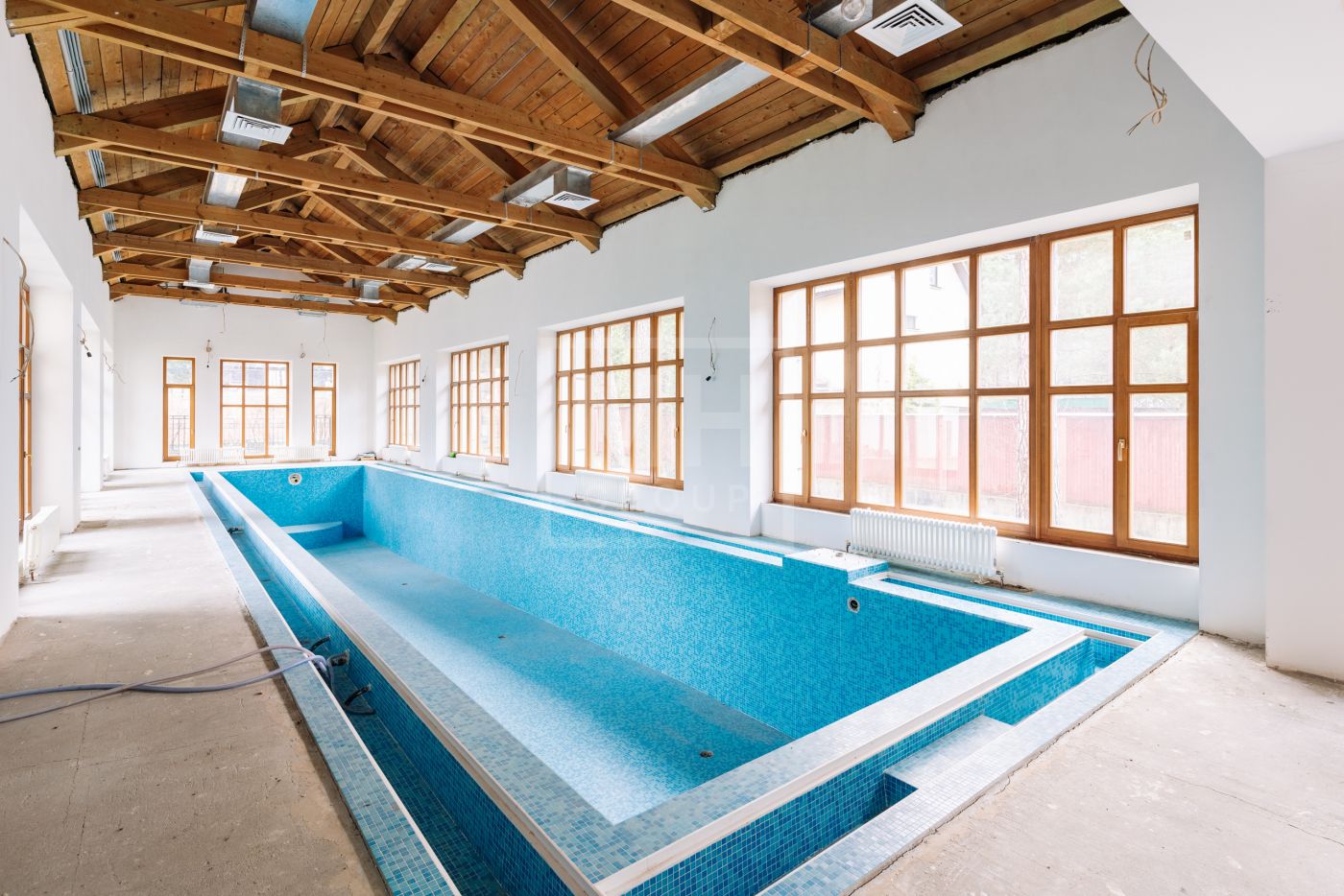Красивый просторный дом с чистовой отделкой: стены выровнены, стяжки сделаны, выполнен монтаж электрики и сантехники, бассейн отделан полностью.