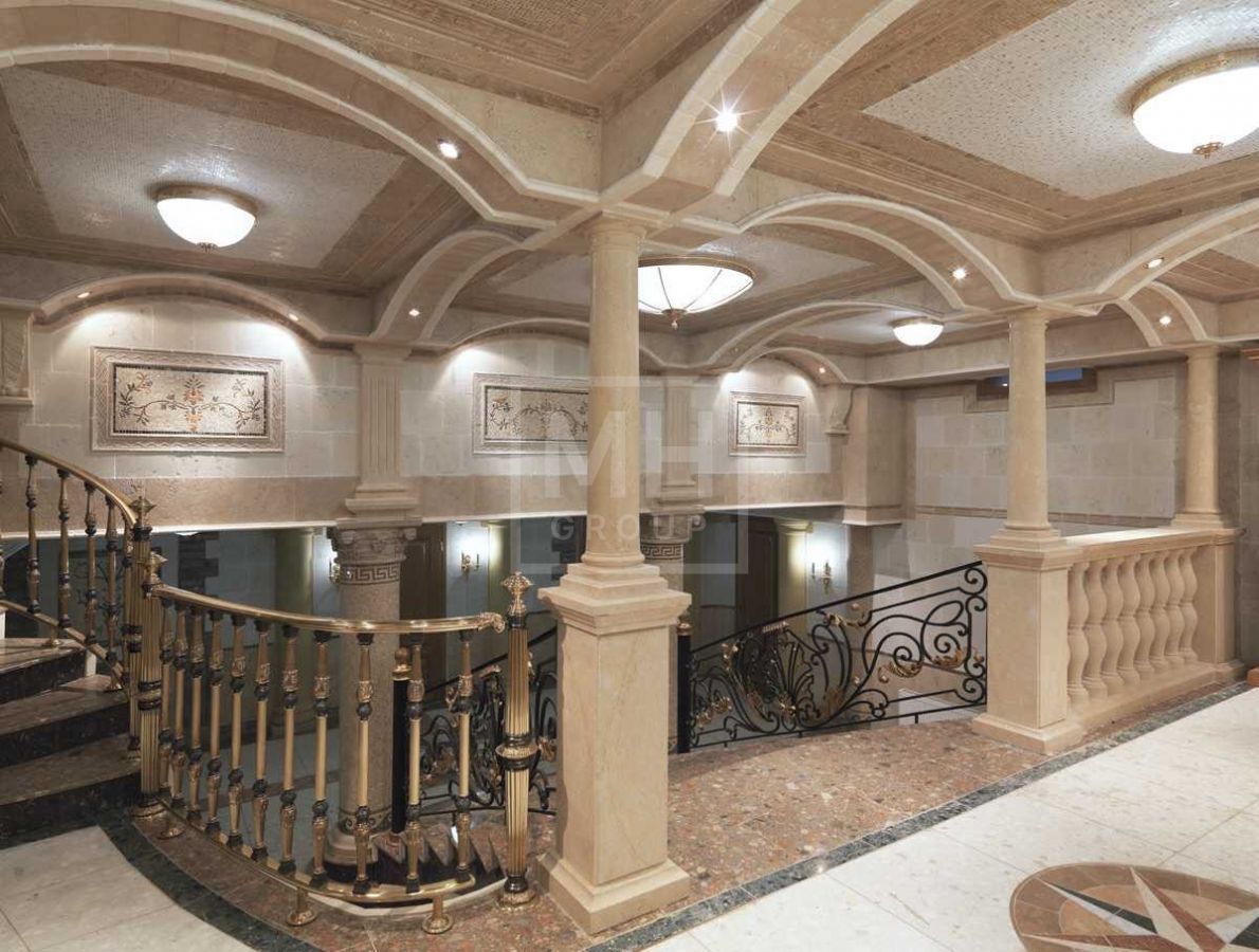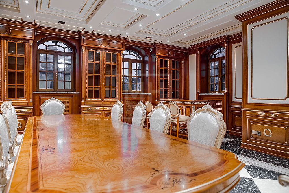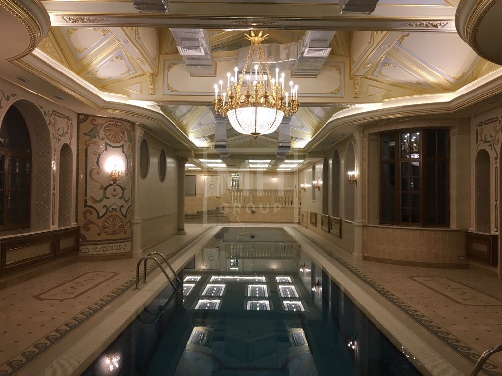 Этаж 1: Прихожая, гостиная с камином, кабинет также с камином, столовая, кухня, банкетный зал, бассейн, с/у, душевая, гардеробная.
