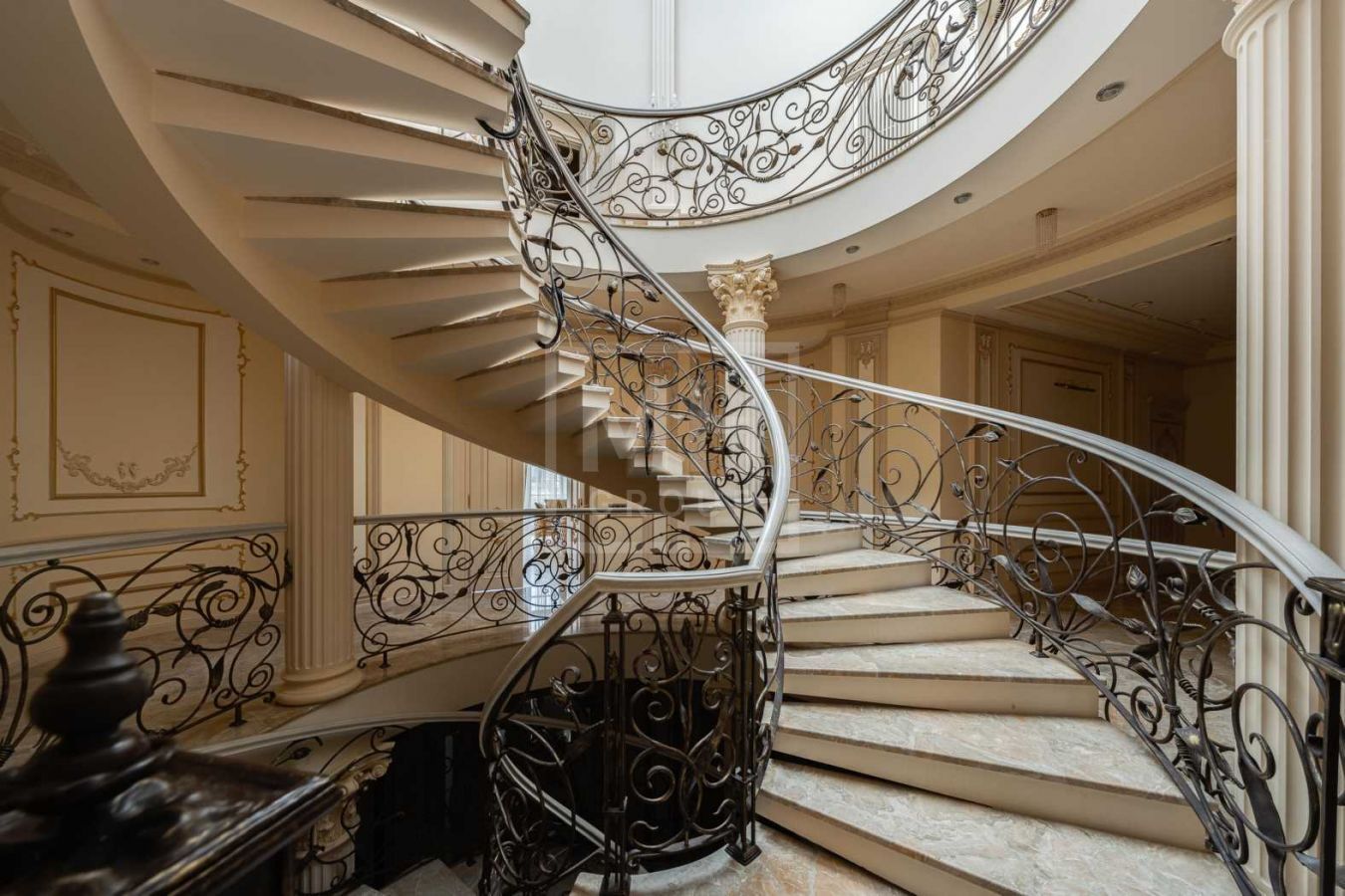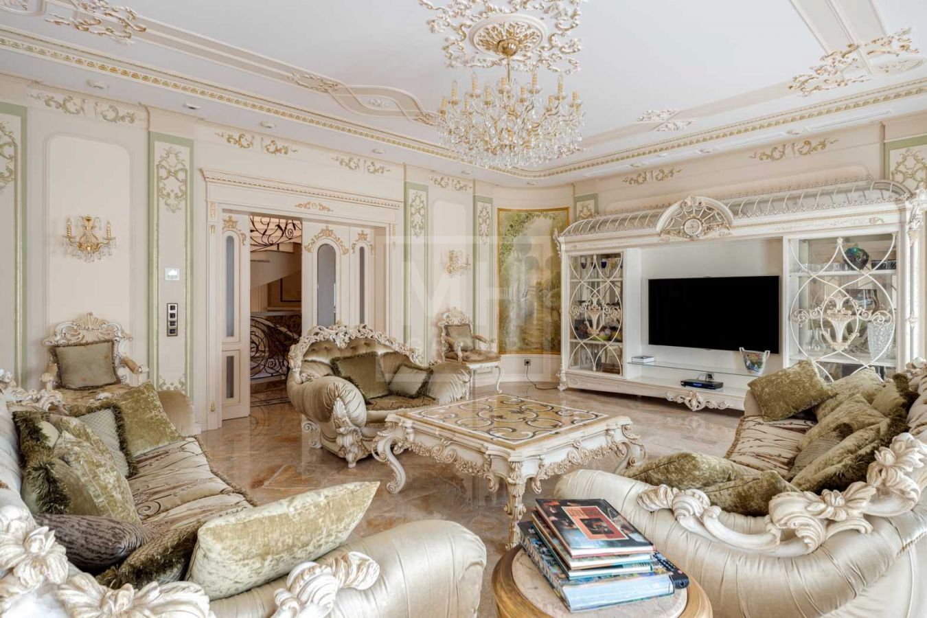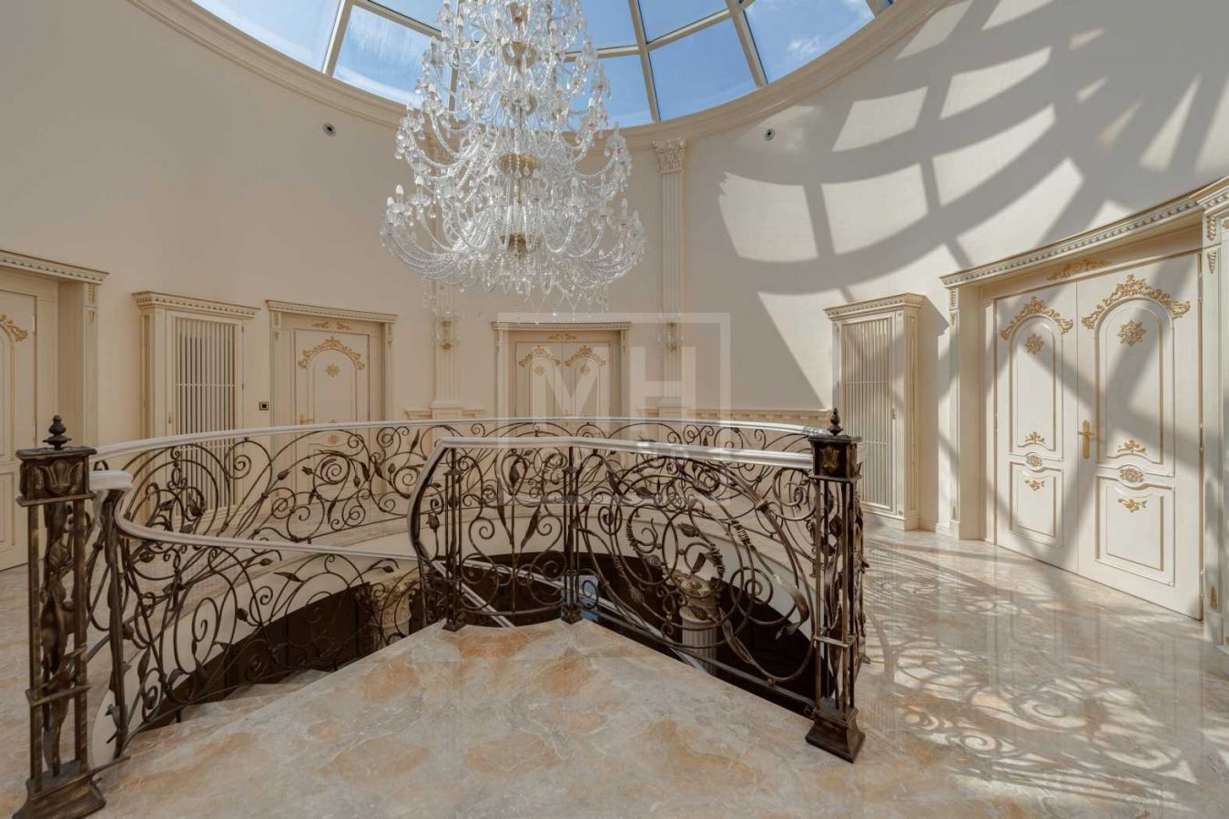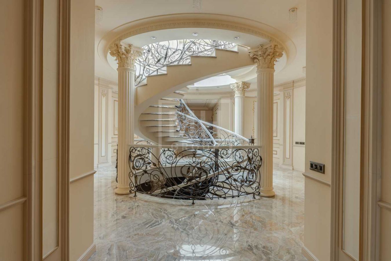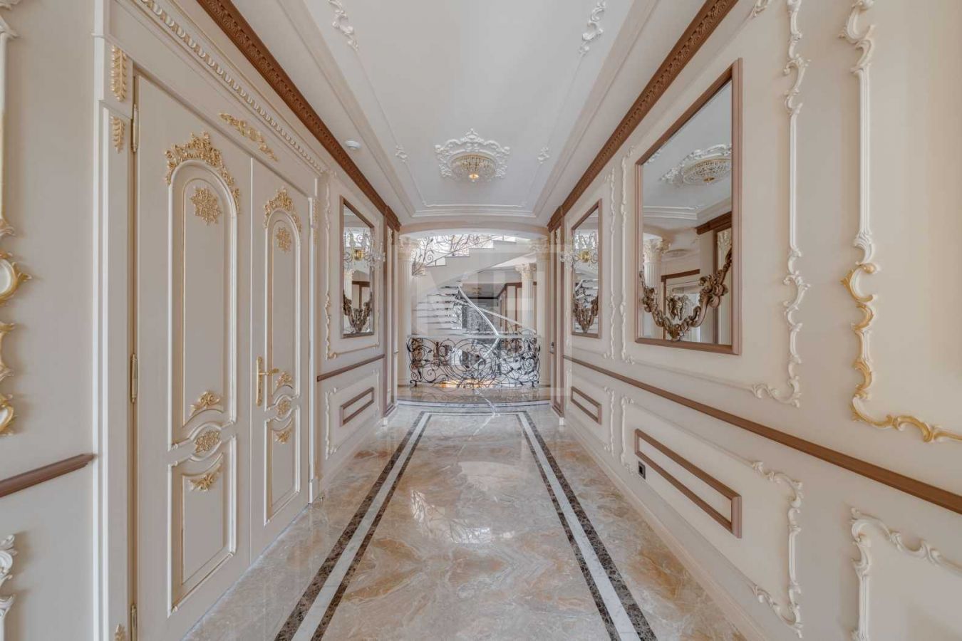 Дом с отделкой и мебелью в классическом стиле площадью 1 500 м2 на участке 53 сотки.В отделке много натуральных материалов: мрамор различных видов, натуральная мозаика, ковка, дерево. Фасад выполнен из облицовочного кирпича.