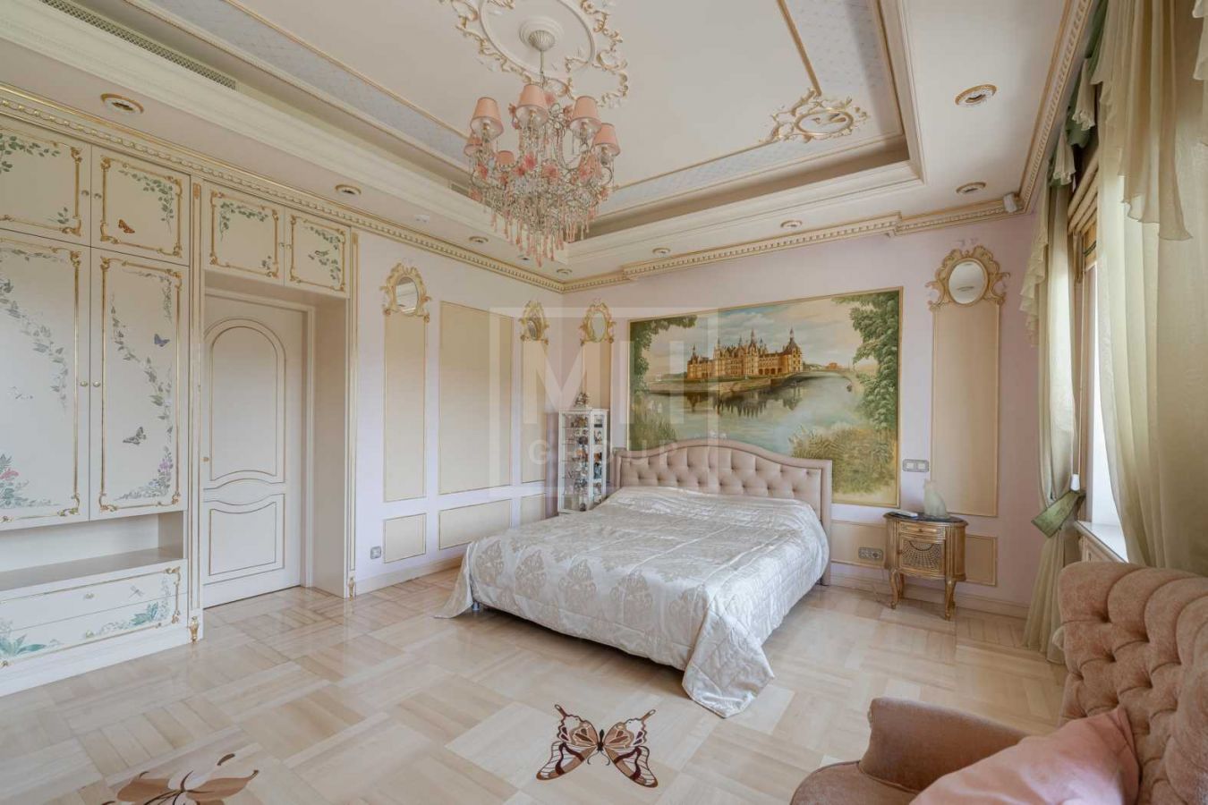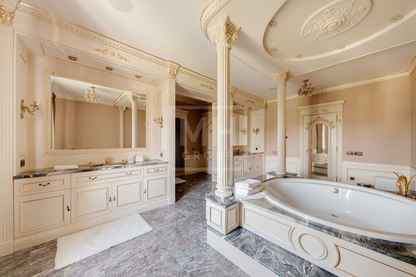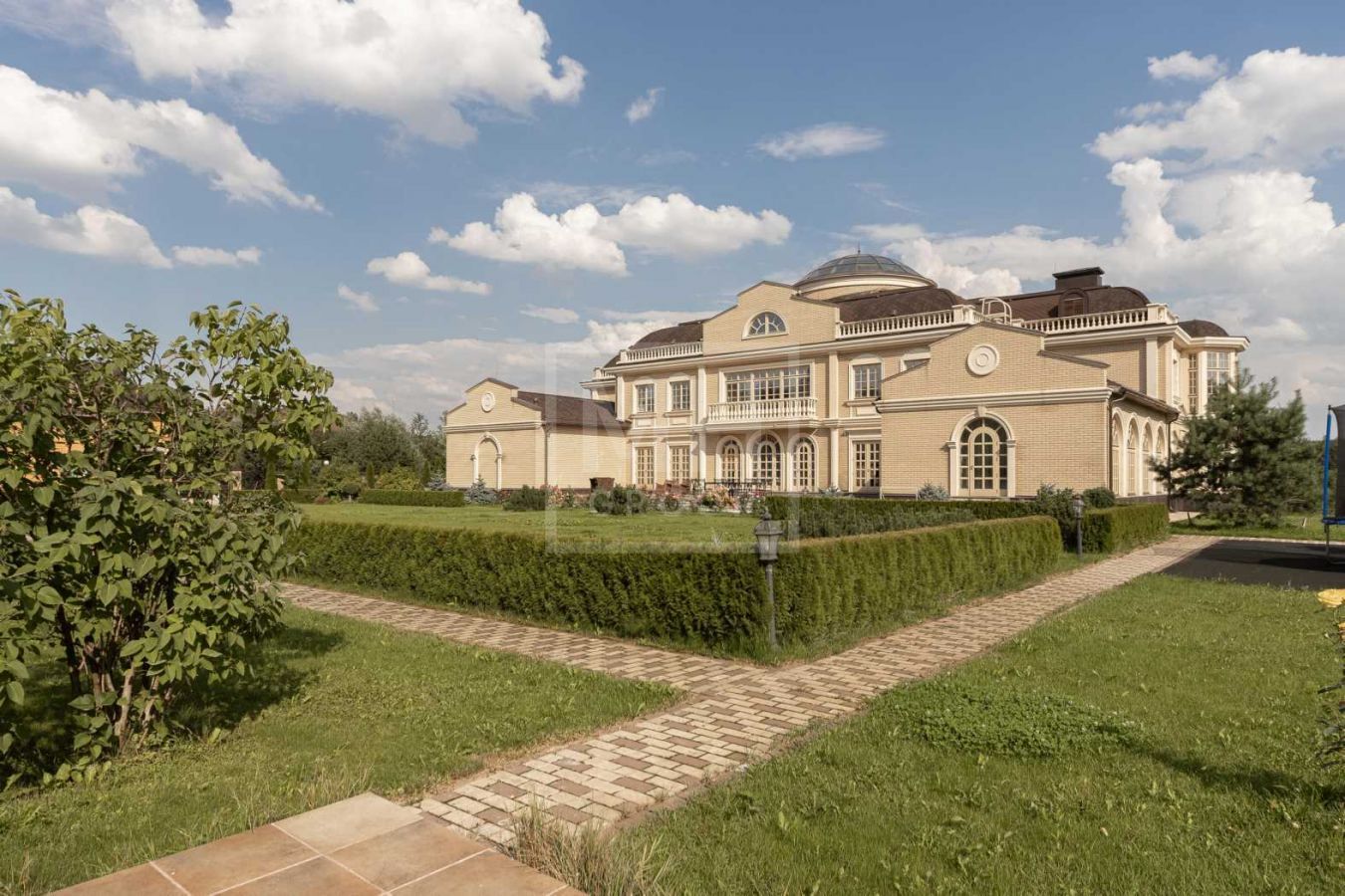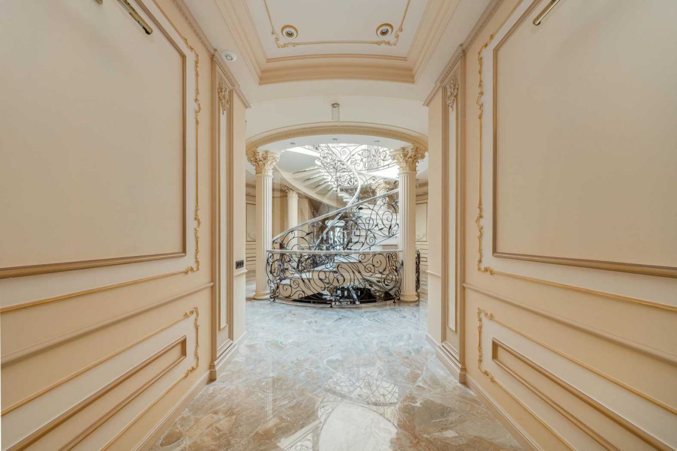 Дом с отделкой и мебелью в классическом стиле площадью 1 500 м2 на участке 53 сотки.В отделке много натуральных материалов: мрамор различных видов, натуральная мозаика, ковка, дерево. Фасад выполнен из облицовочного кирпича.