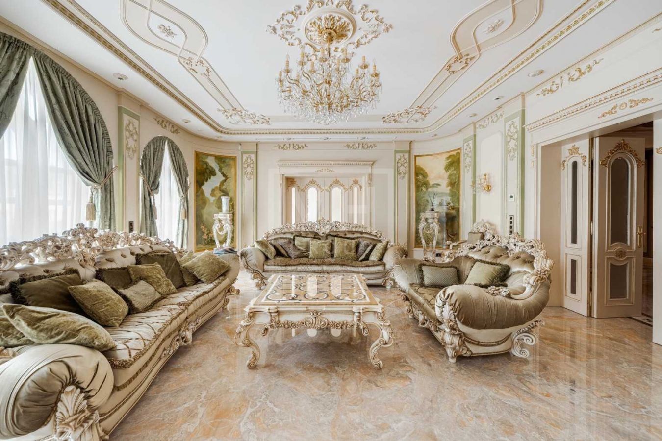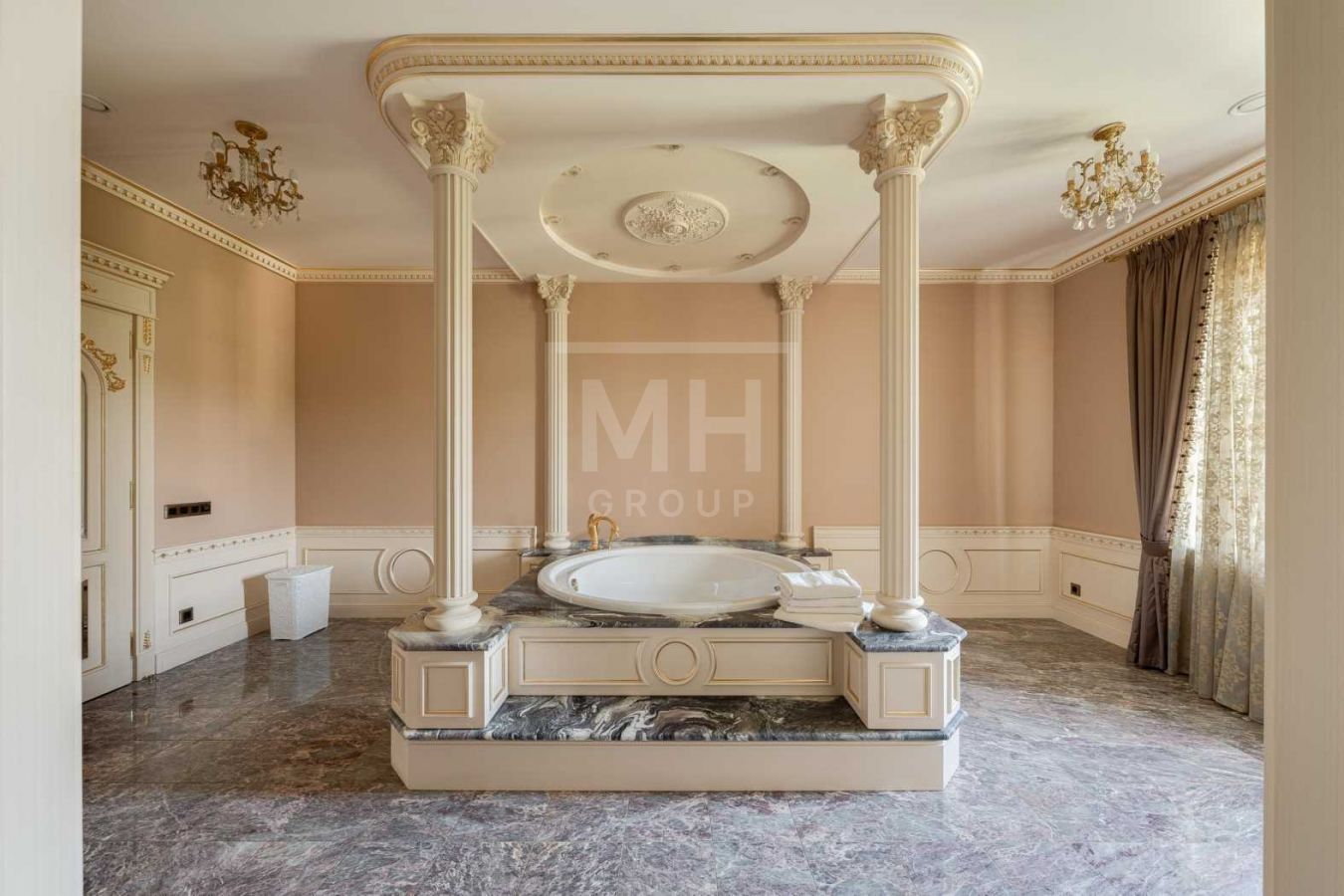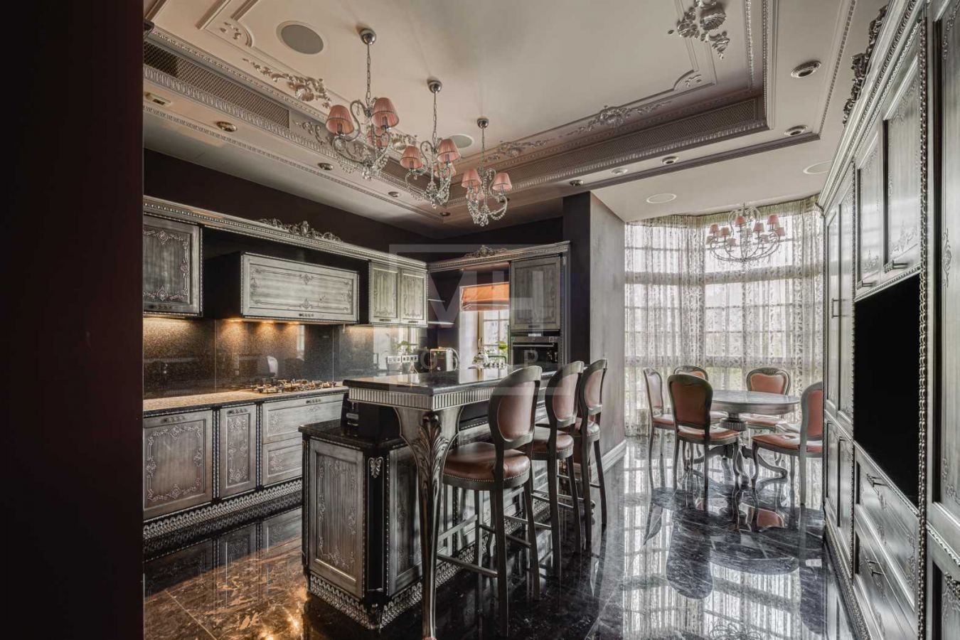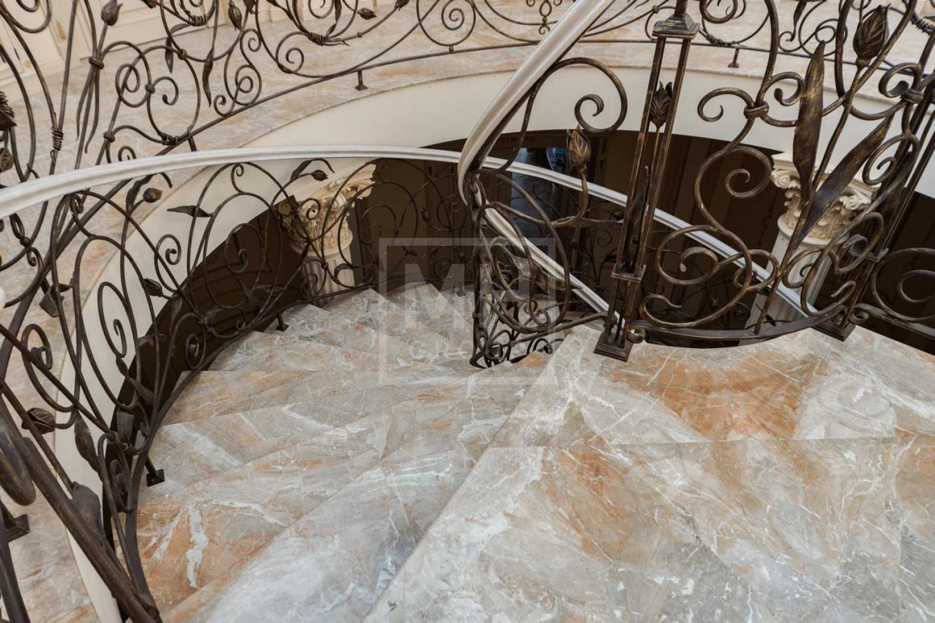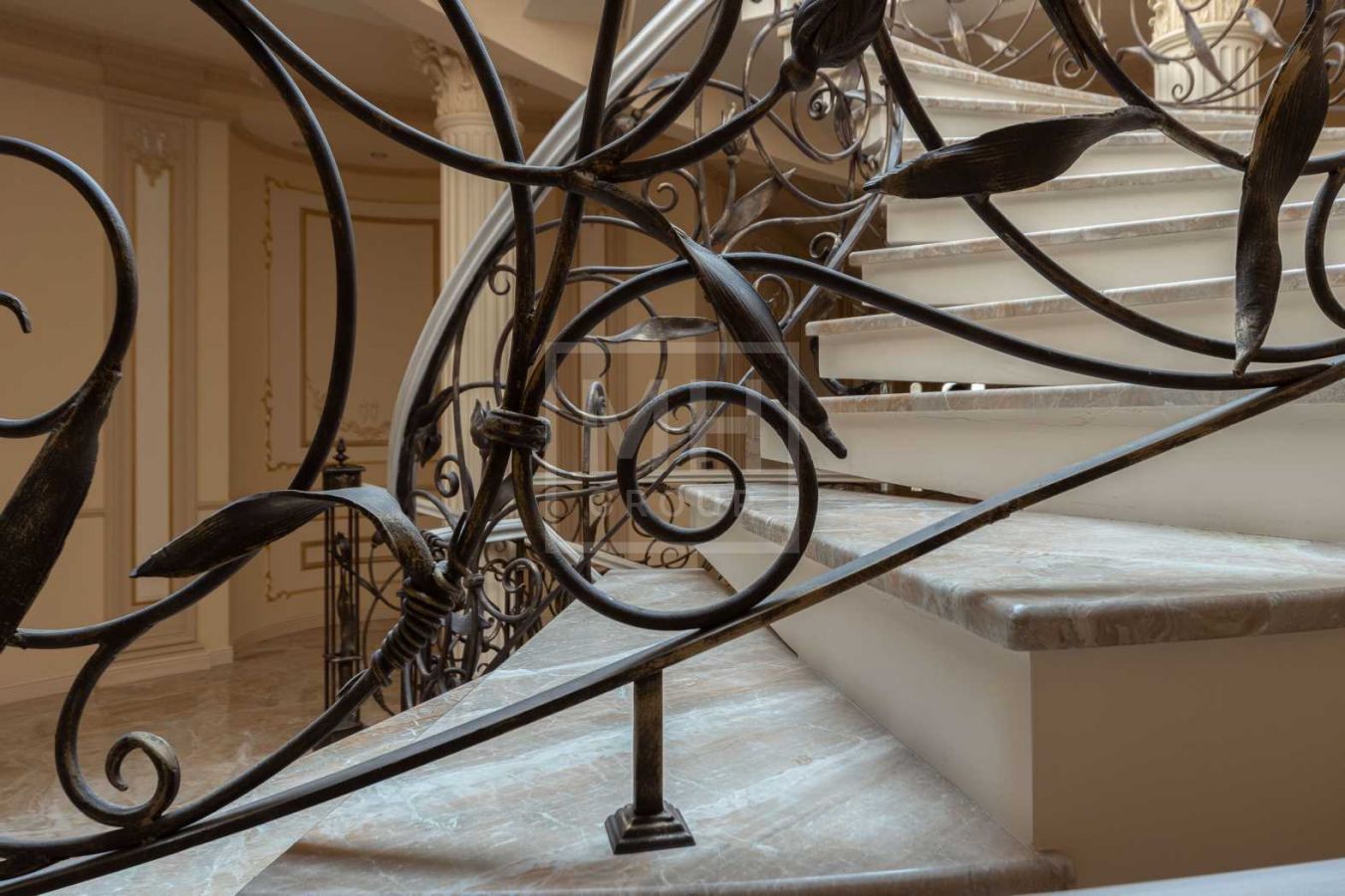 Дом с отделкой и мебелью в классическом стиле площадью 1 500 м2 на участке 53 сотки.В отделке много натуральных материалов: мрамор различных видов, натуральная мозаика, ковка, дерево. Фасад выполнен из облицовочного кирпича.