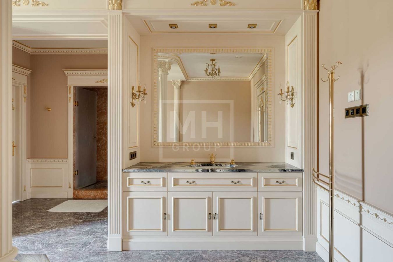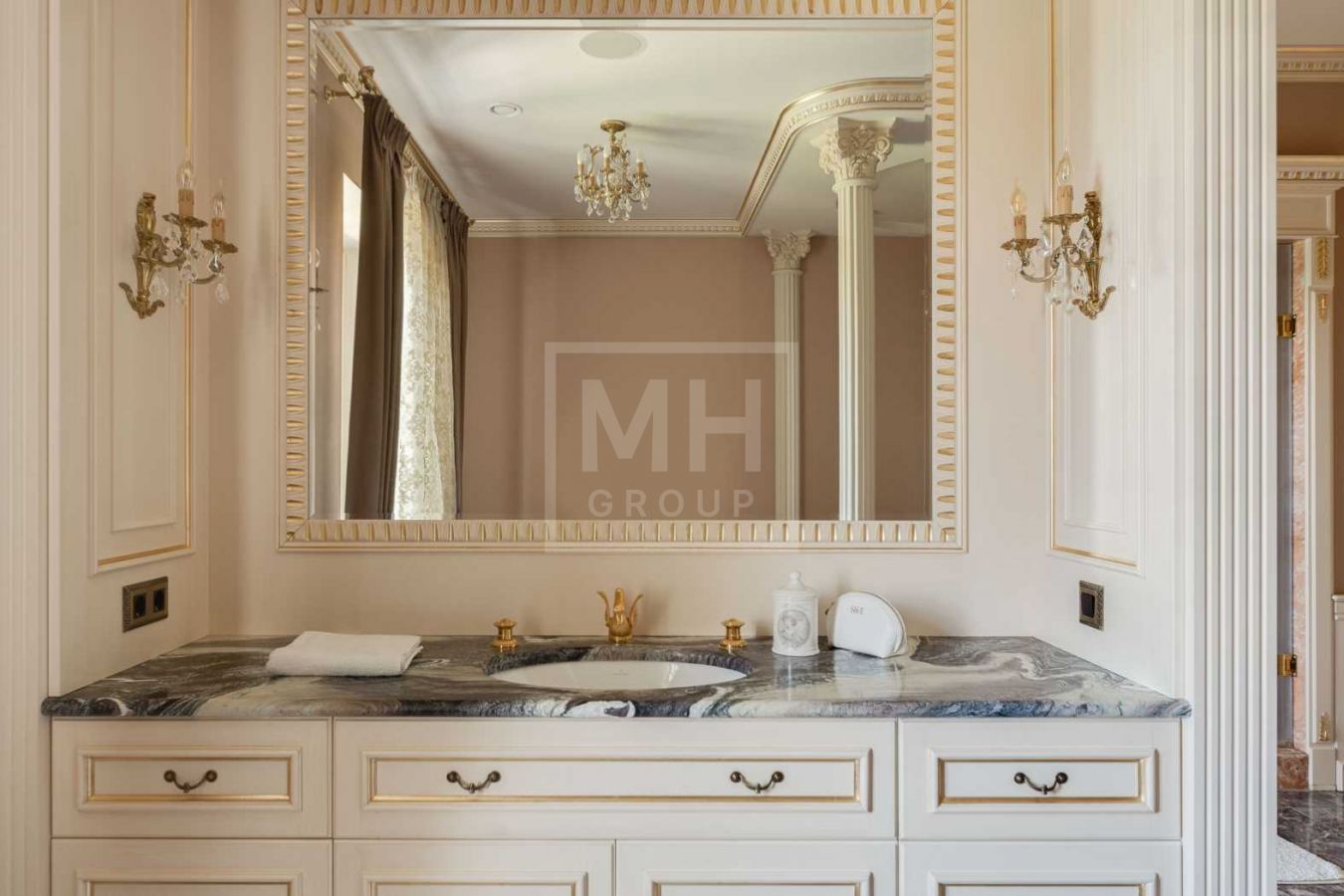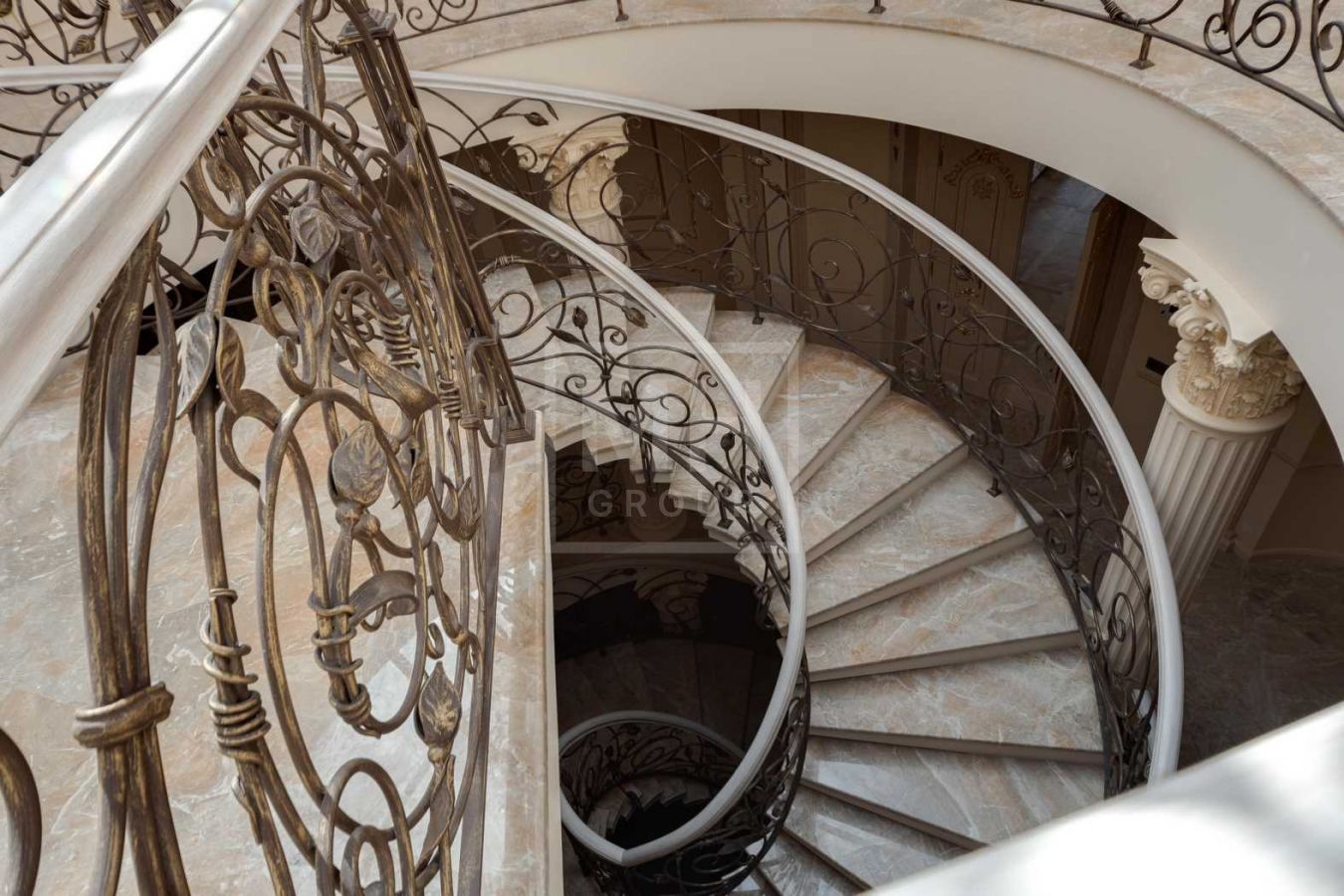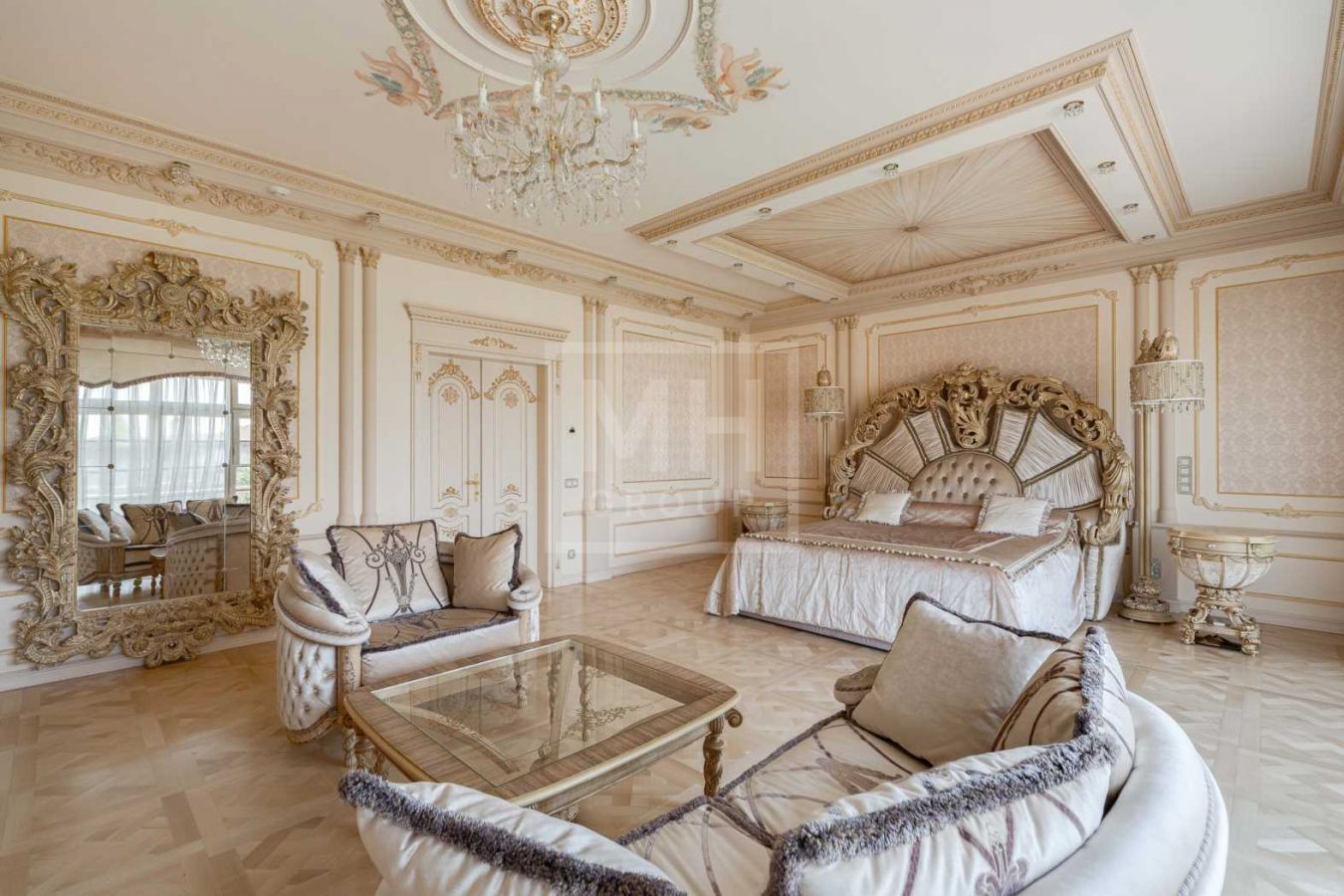 Дом с отделкой и мебелью в классическом стиле площадью 1 500 м2 на участке 53 сотки.В отделке много натуральных материалов: мрамор различных видов, натуральная мозаика, ковка, дерево. Фасад выполнен из облицовочного кирпича.