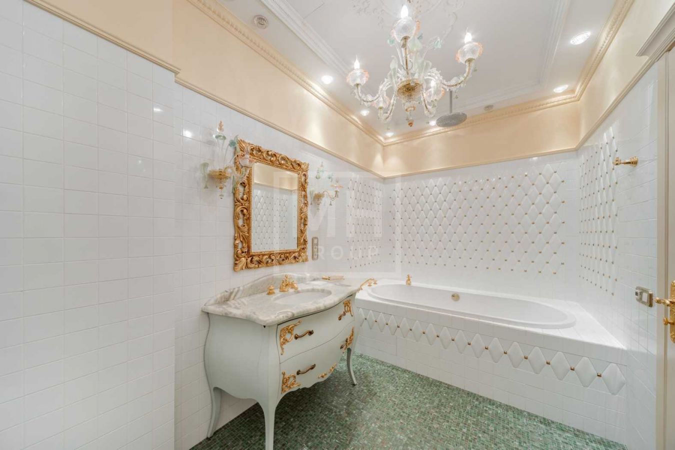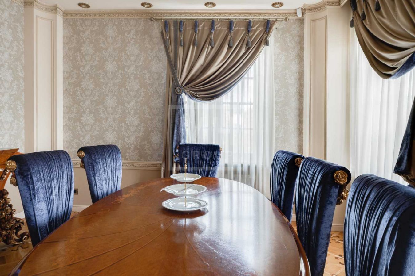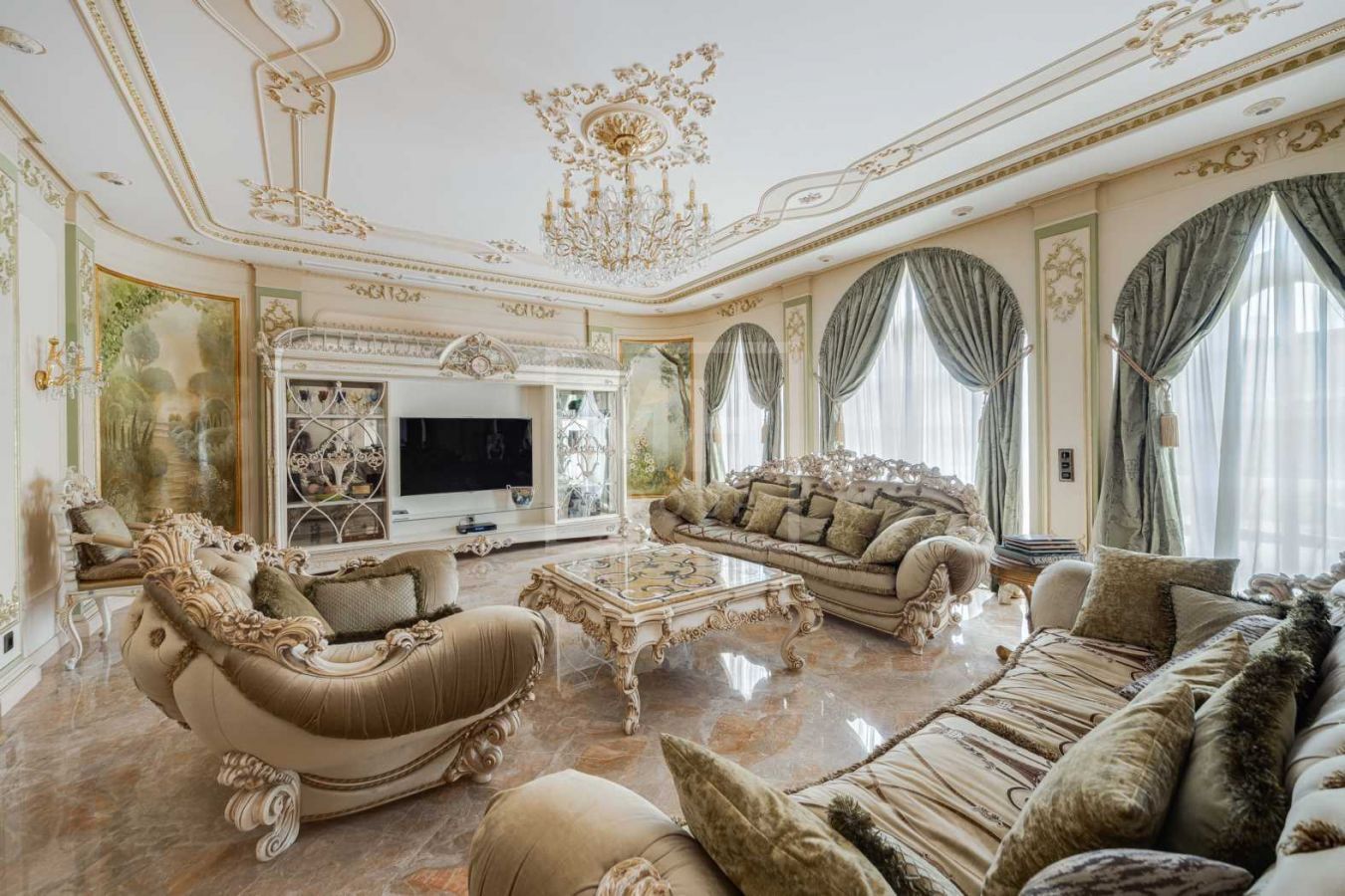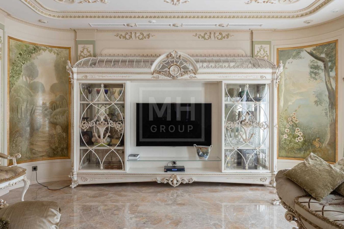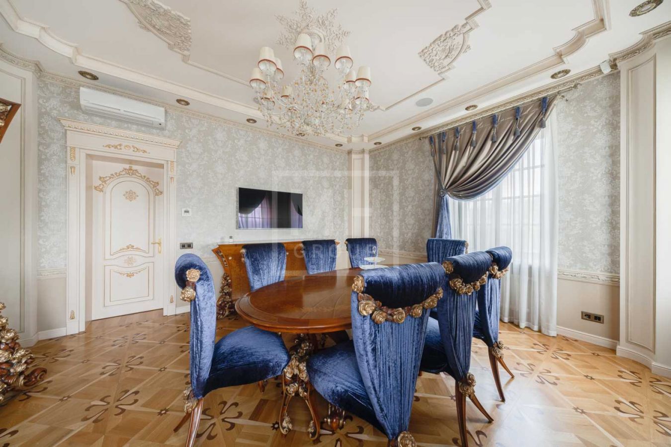 Дом с отделкой и мебелью в классическом стиле площадью 1 500 м2 на участке 53 сотки.В отделке много натуральных материалов: мрамор различных видов, натуральная мозаика, ковка, дерево. Фасад выполнен из облицовочного кирпича.