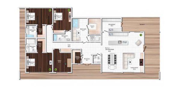 Этаж 1: Прихожая, гардеробная, кухня, столовая, гостиная, 2 спальни с с/у и гардеробными, спальня с с/у, кабинет/спальня, с/у, сауна, душевая, комната отдыха, котельная