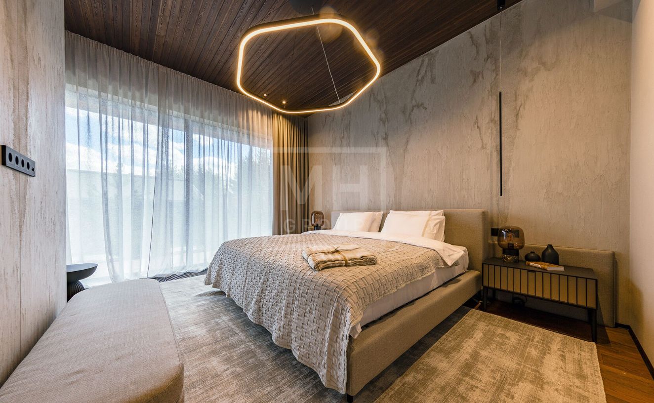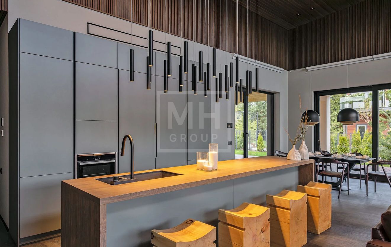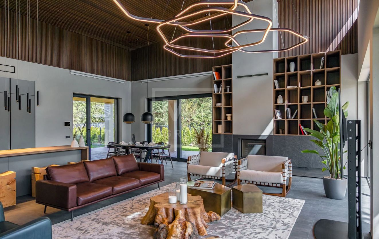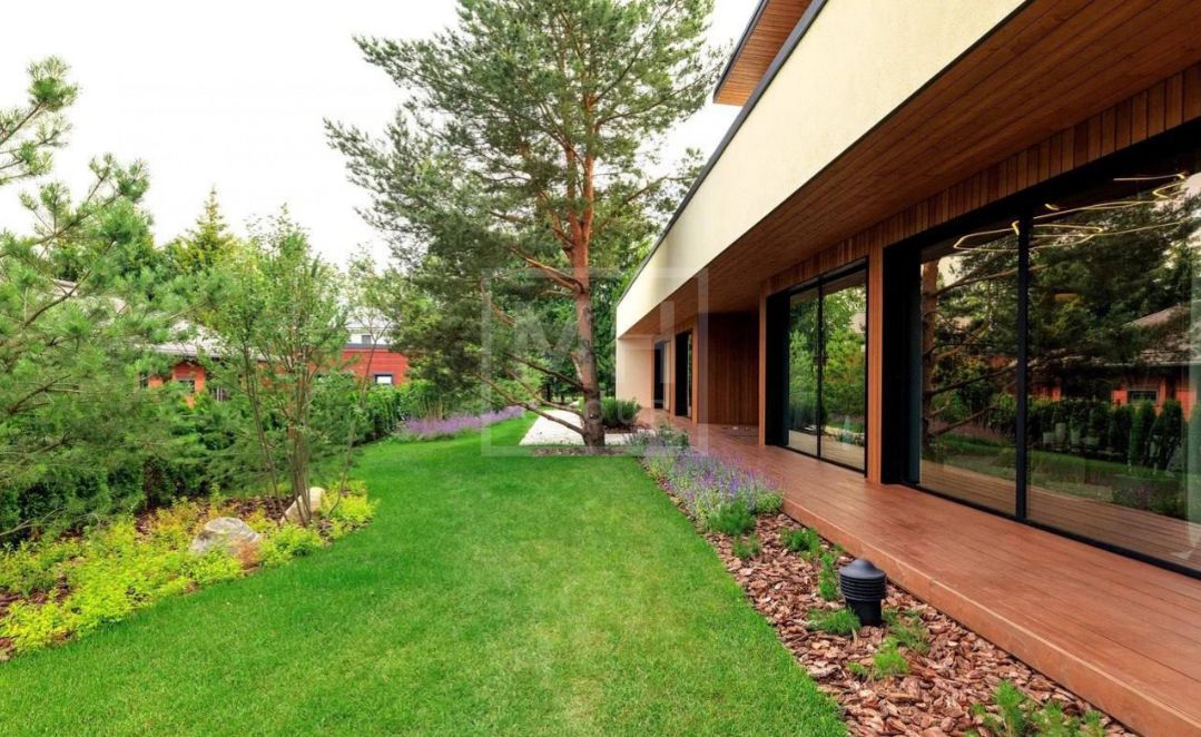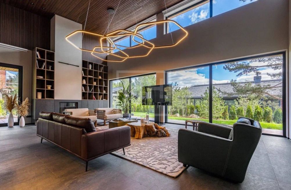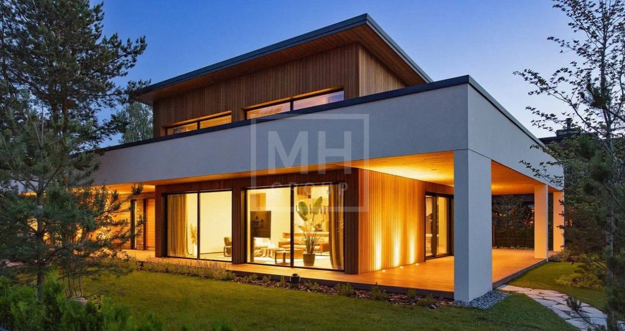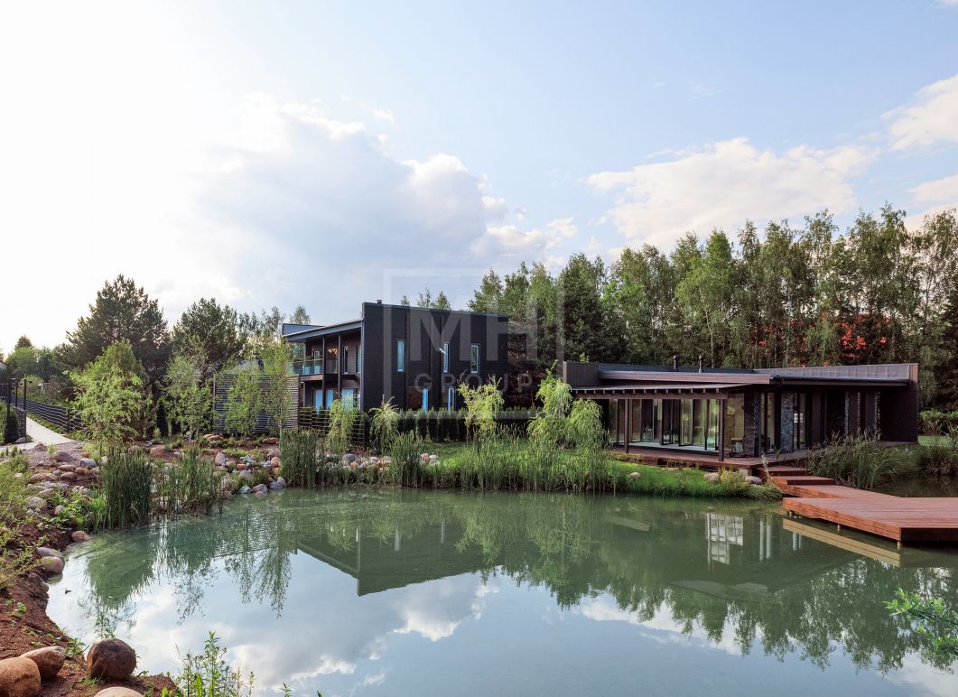 Дом премиум-класса в коттеджном поселке Gorki Lake спроектирован итальянским архитектором с мировым именем Giuseppe Arnone. Одноэтажный каменный дом в итальянским стиле выполнен из финских термоблоков Concrette ,имеющих утепленную трехслойную бетонную структуру (технология разработана в Финляндии, имеет лучшие экологические и теплотехнические показатели, сегодня признана лучшей на рынке каменных домов). Отделка фасада выполнена с применением вертикального планкена из лиственницы. Двухкамерные алюминиевые энергоэффективные окна с климат контролем фирмы Alutech. Двери финские деревянные двери Kaski с системой климат-контроля.На участке кроме основного дома гараж на две машины, в котором предусмотрена зарядка для электрокара, квартира для персонала и котельная.