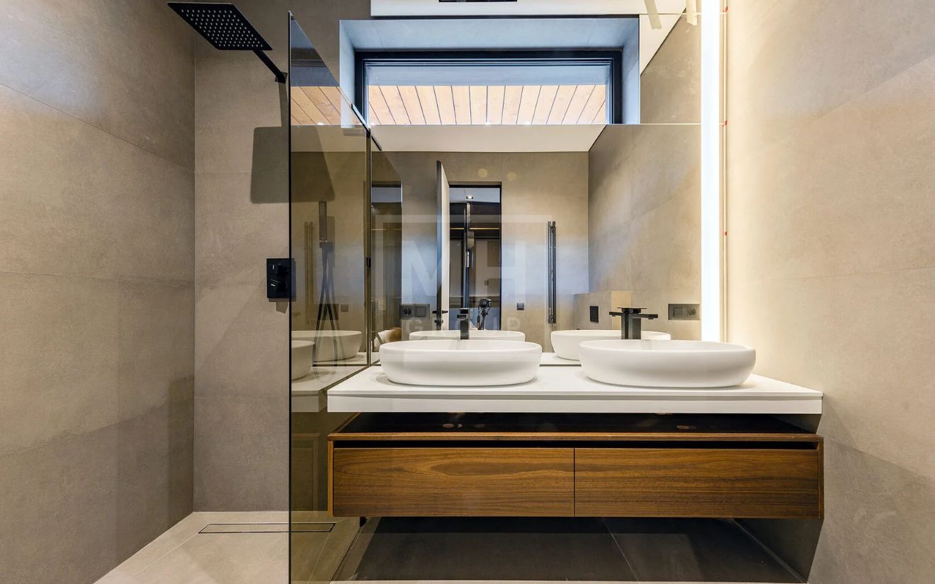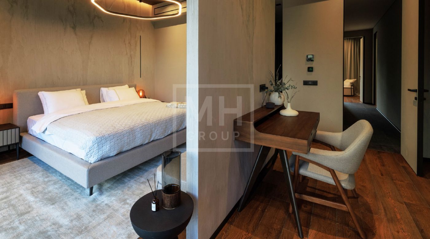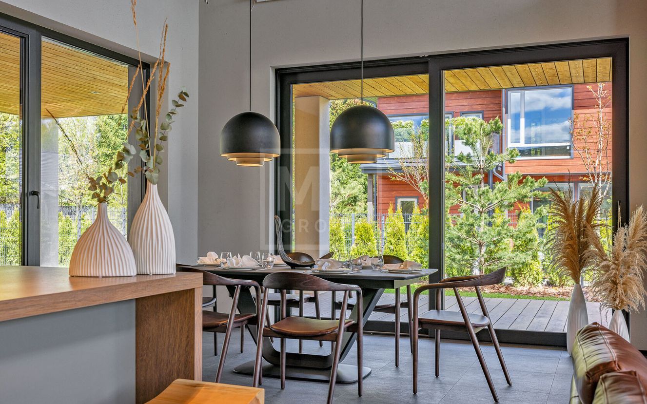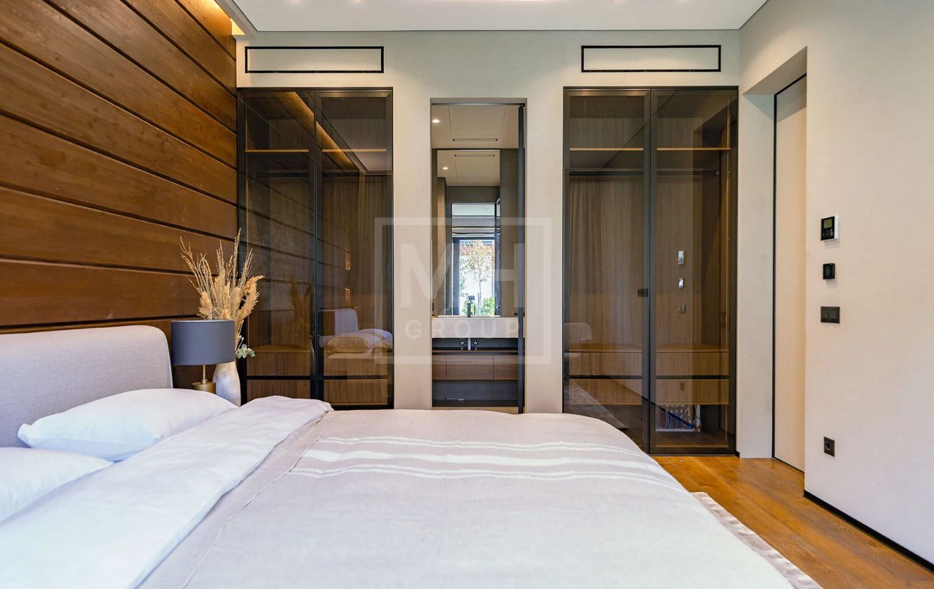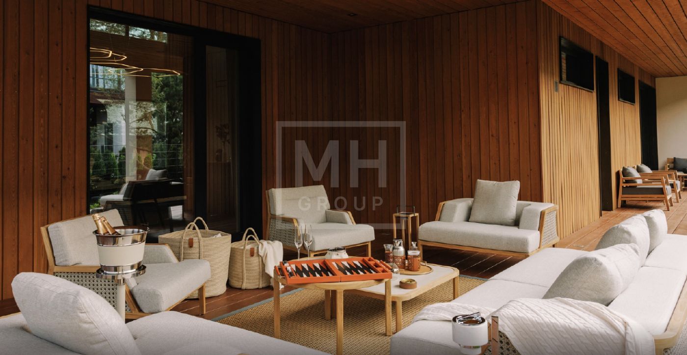Дом премиум-класса в коттеджном поселке Gorki Lake спроектирован итальянским архитектором с мировым именем Giuseppe Arnone. Одноэтажный каменный дом в итальянским стиле выполнен из финских термоблоков Concrette ,имеющих утепленную трехслойную бетонную структуру (технология разработана в Финляндии, имеет лучшие экологические и теплотехнические показатели, сегодня признана лучшей на рынке каменных домов). Отделка фасада выполнена с применением вертикального планкена из лиственницы. Двухкамерные алюминиевые энергоэффективные окна с климат контролем фирмы Alutech. Двери финские деревянные двери Kaski с системой климат-контроля.На участке кроме основного дома гараж на две машины, в котором предусмотрена зарядка для электрокара, квартира для персонала и котельная.