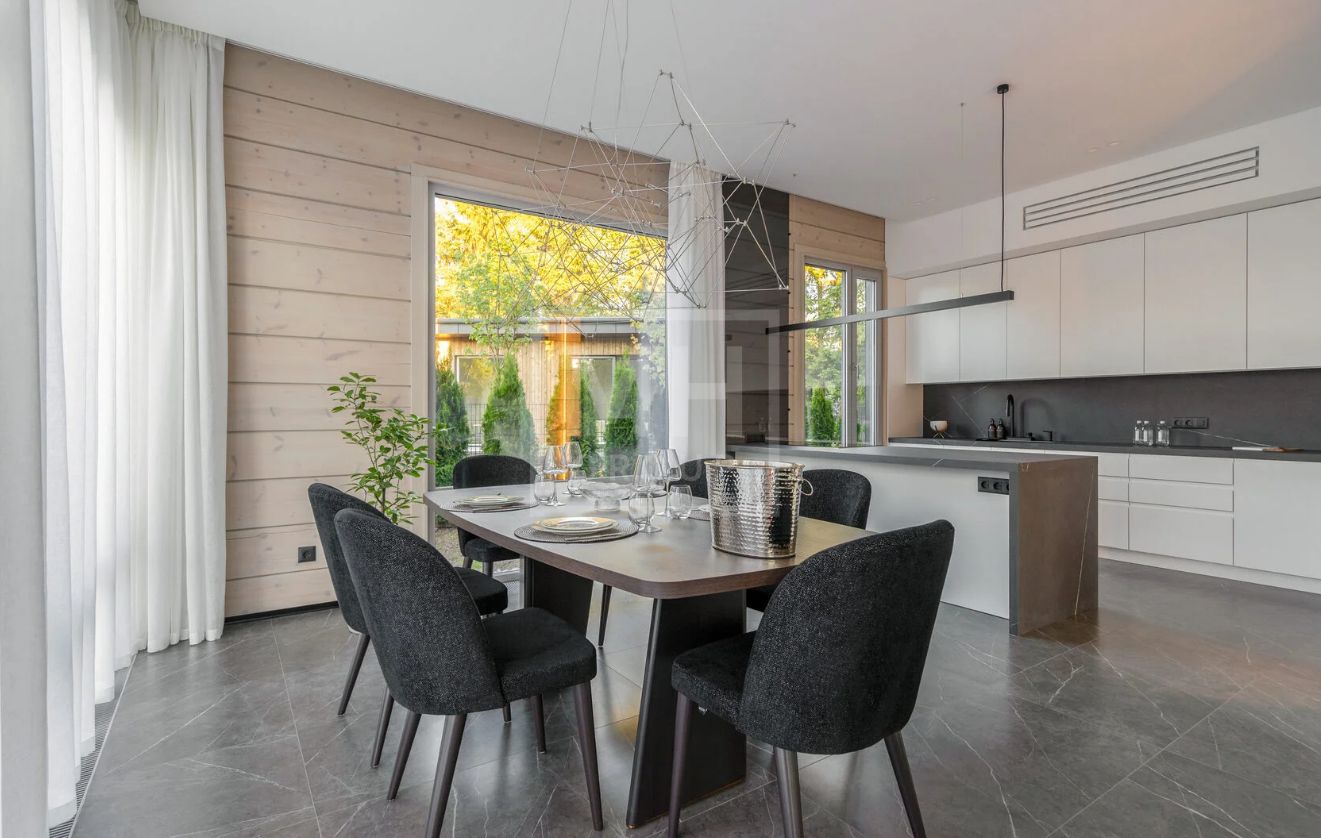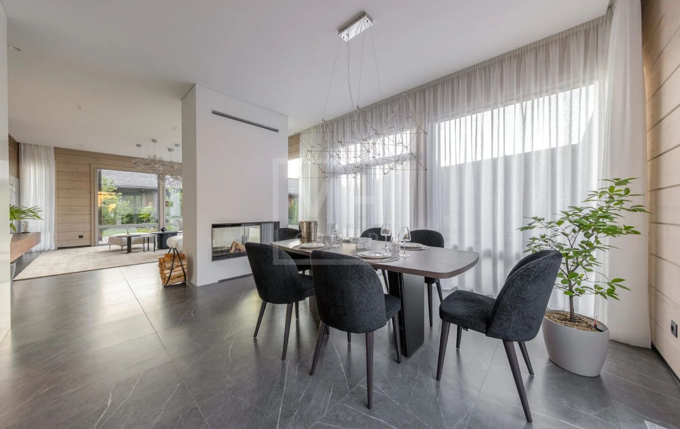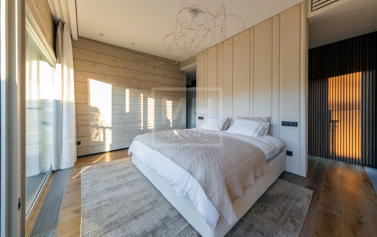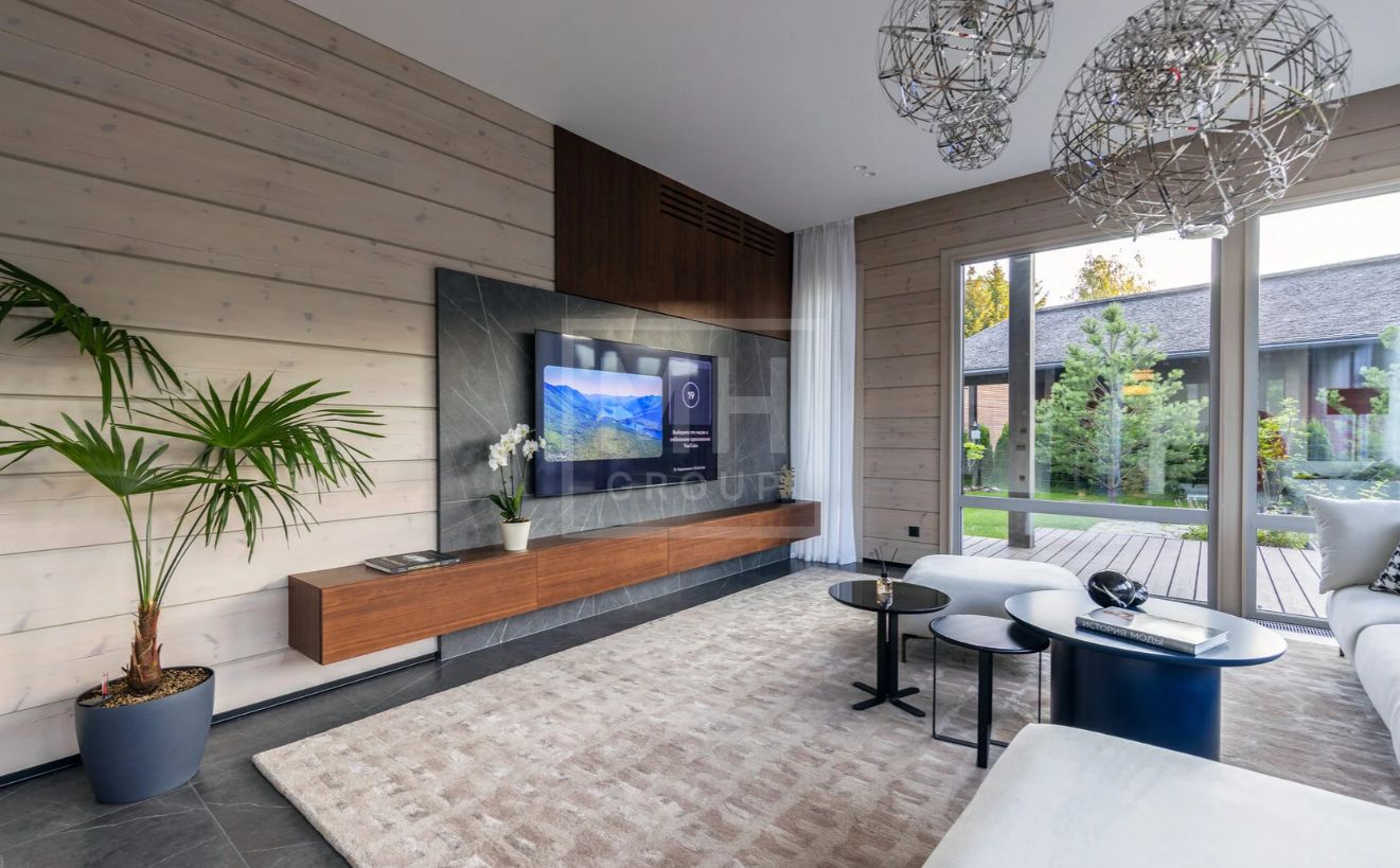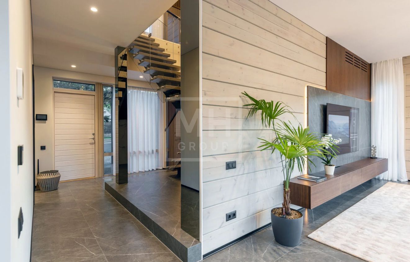 Дом премиум-класса в коттеджном поселке Gorki Lake спроектирован архитектором с мировым именем Matti Iiramo. Дом построен из элитной финской сосны по уникальной безусадочной технологии Nord Cross, единственной в России. Дом не требуют технического обслуживания, связанного с усадкой дома. Часть наружных стен выполнены из финских термо-модулей Concrette, имеющих утепленную трехслойную бетонную структуру (технология разработана в Финляндии, имеет лучшие экологические и технические показатели, сегодня признана лучшей на рынке каменных домов). Панорамные двухкамерные алюминиевые энергоэффективные окна с климат контролем фирмы Alutech и мансардные окна Velux дополняют архитектурный облик дома . Деревянные финские двери Kaski с системой климат-контроля. Итальянский стиль интерьера: дизайн и комплектация разработаны итальянским архитектором Fabiano Vidussi.Проектом предусмотрена квартира для персонала. Гараж на два машиноместа.