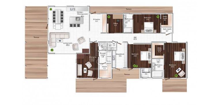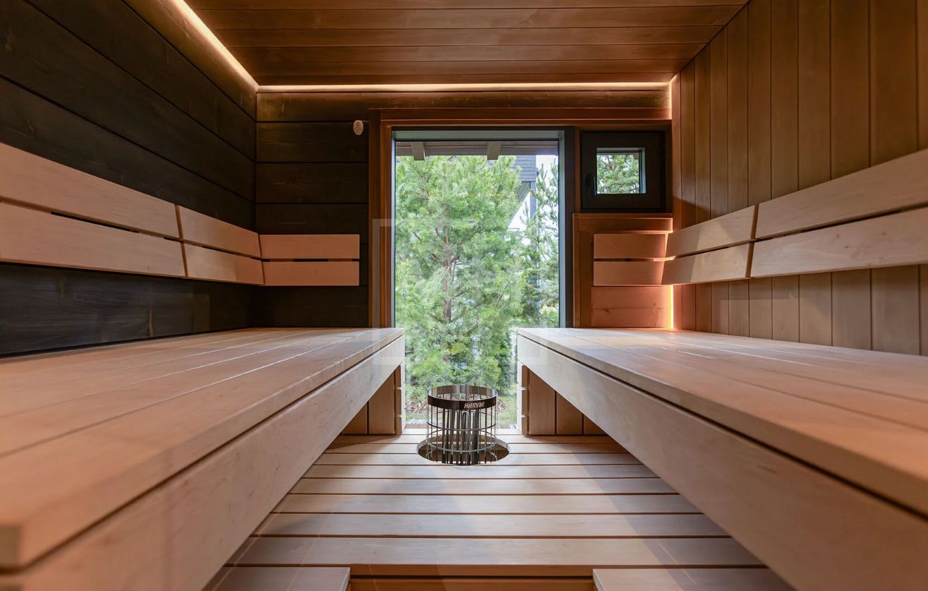 Этаж 1: Прихожая, гардеробная, кухня, столовая гостиная, 2 спальни с с/у и гардеробными, спальня с с/у, кабинет/спальня, с/у, сауна, душевая, комната отдыха, с/у, котельная