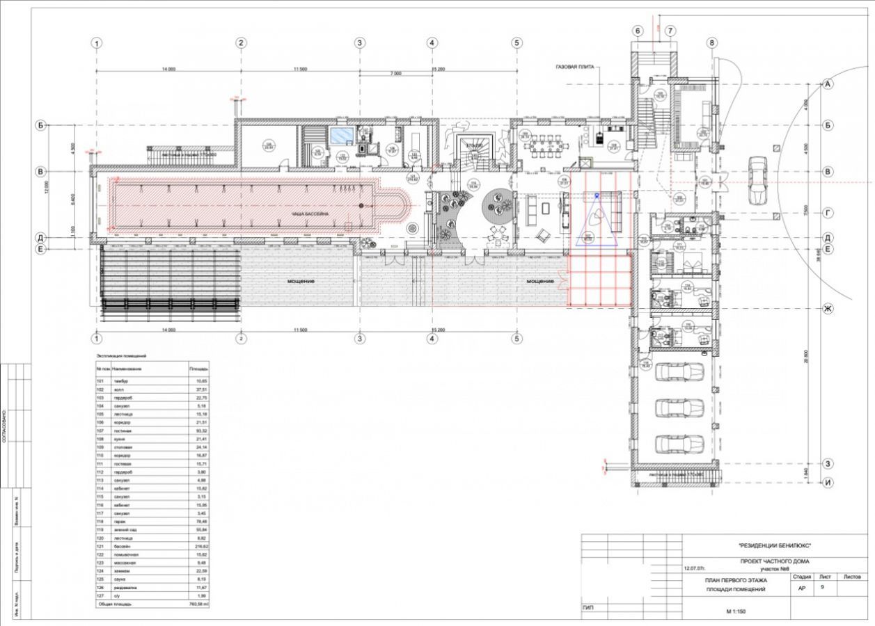Цоколь: холл с с/у, техническое помещение, бар, кинотеатр, студия звукозаписи, игровая, танцзал, тренажерная, кардиозона с с/у, рабочая кухня с лифтом для подачи и выходом на участок, с/у, зона для персонала с отдельным входом, постирочная, две кладовые , с/у .