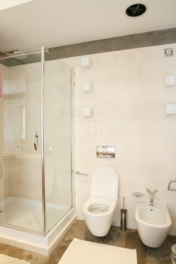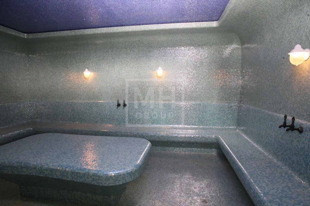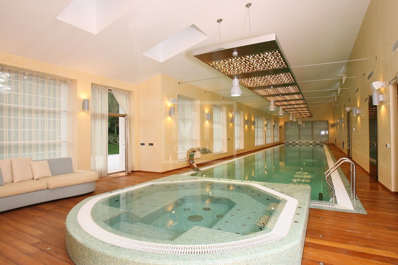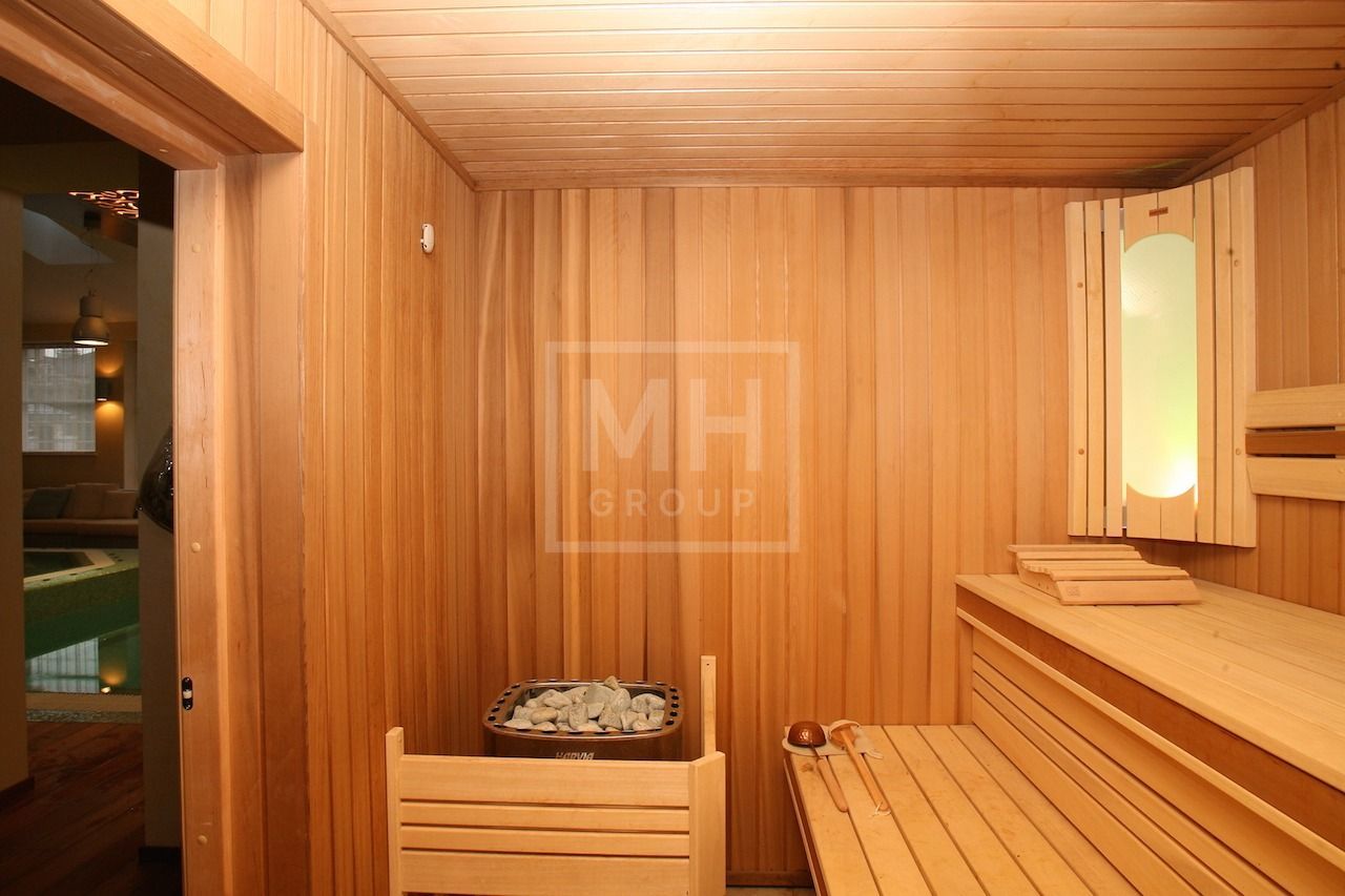 Этаж 1: холл, гараж, с/у, гостевая спальня с с/у, два кабинета с с/у, кухня, гостинная, столовая, телевизионная гостинная с выходом на террасу, зимний сад с выхдом на террасу, зона бассейна (25 метров), джакузи, сауна, солярий, хаммам.