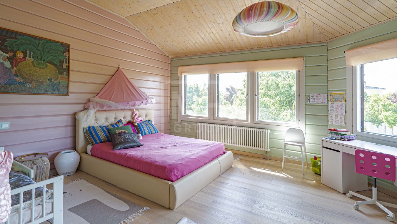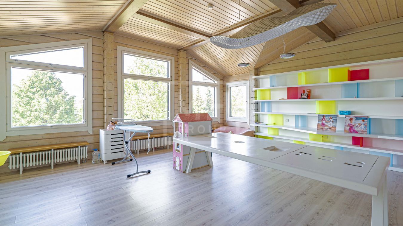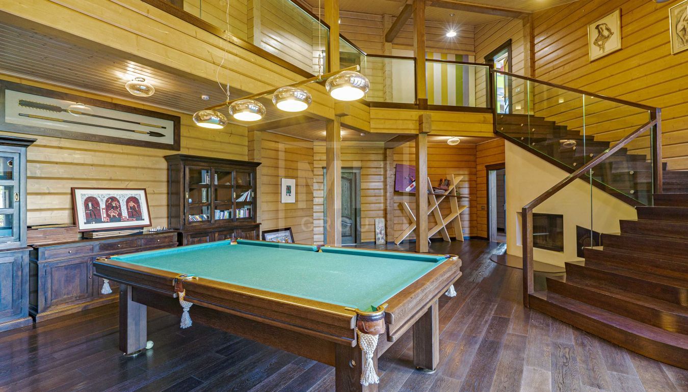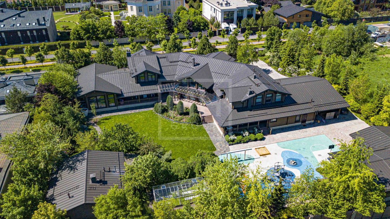 Деревянный дом 1455м, дом для персонала 135 м, гараж на 4 м/м, с баней и большим бассейном на просторном участке 44 сотки. Вся задняя часть дома окружена просторной террасой.Участок зеленый, плодовые и хвойные деревья.