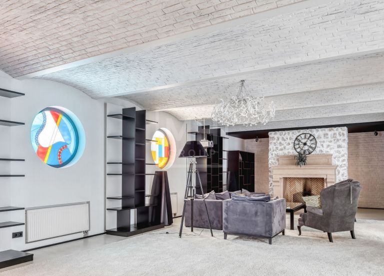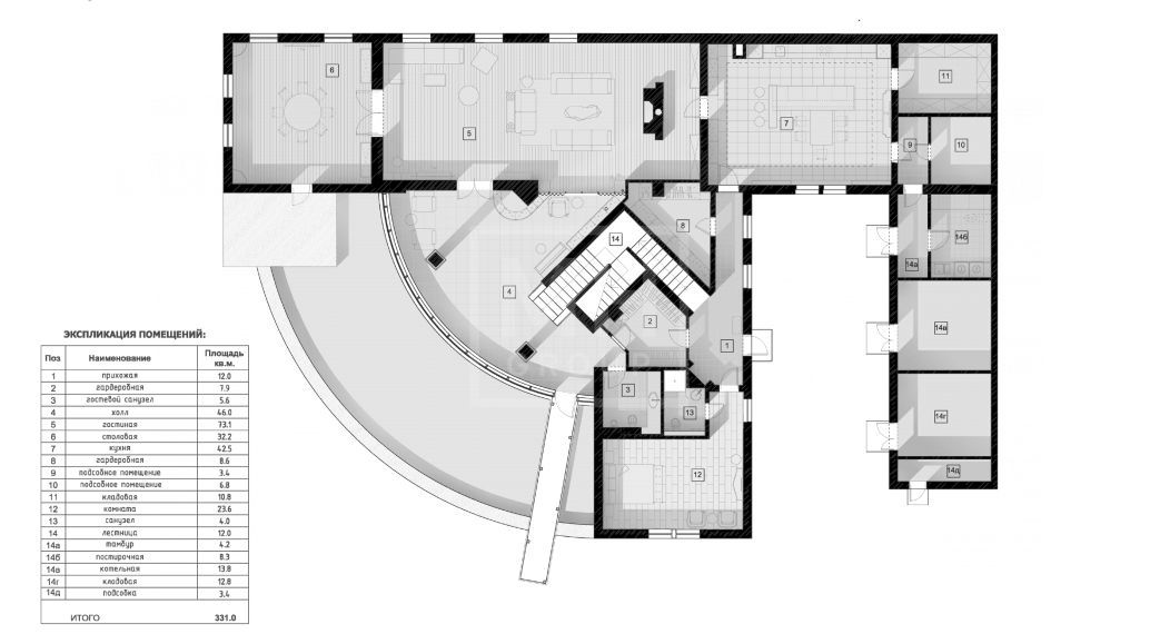 Этаж 1: гостиная с камином, столовая, кухня, с/у, подсобные помещения, блок для няни с с/у.