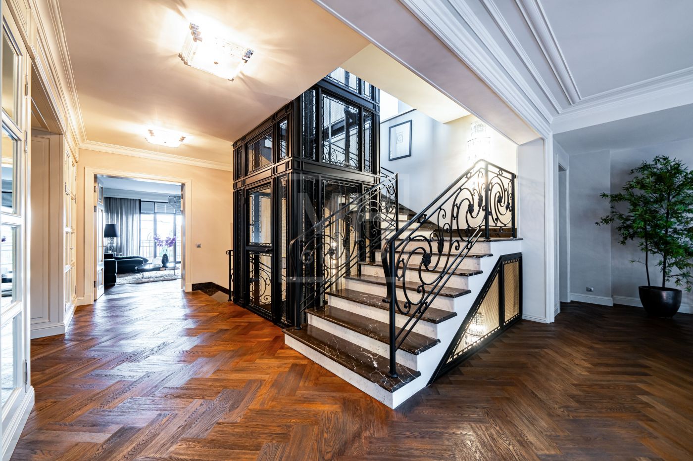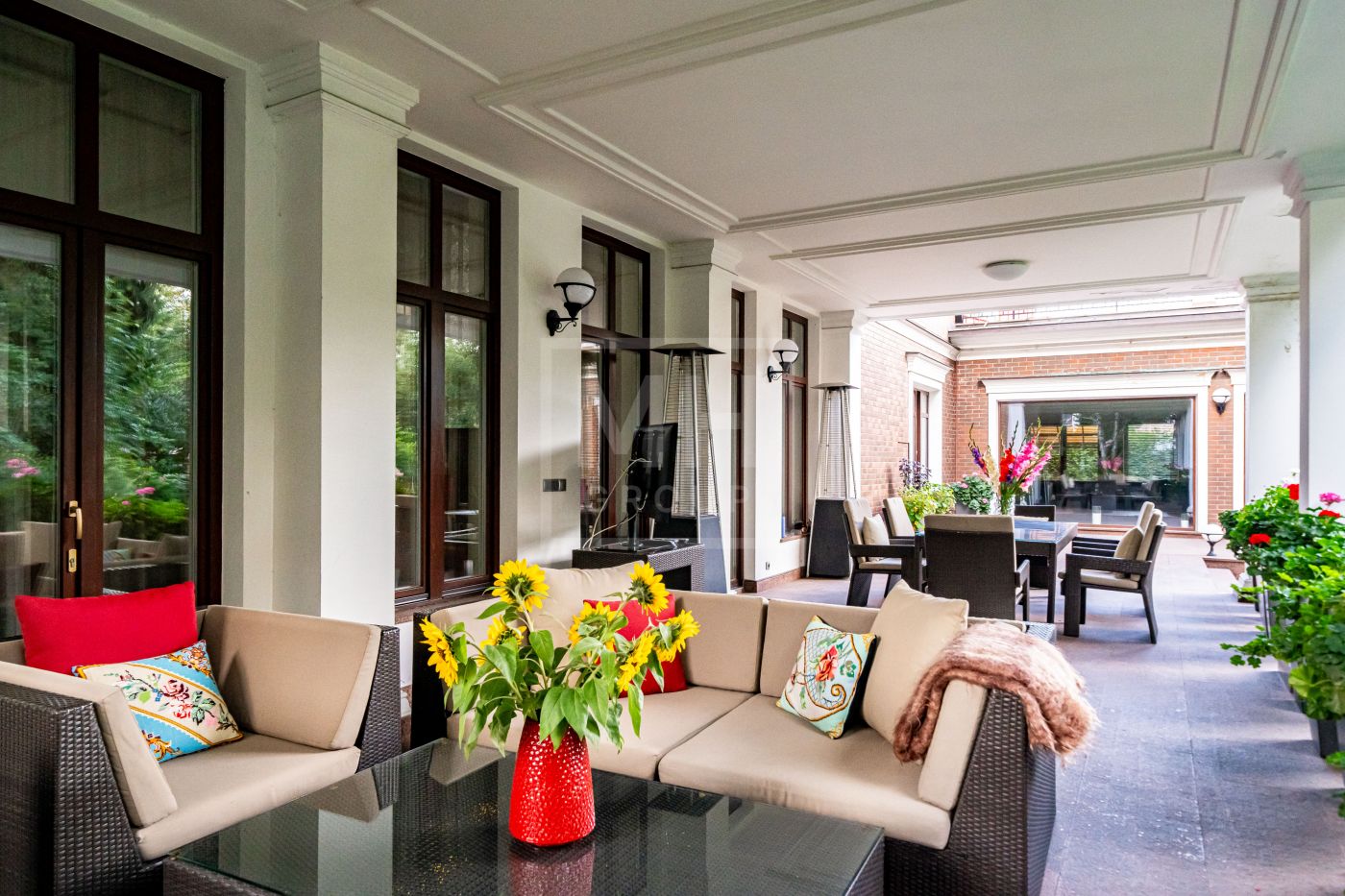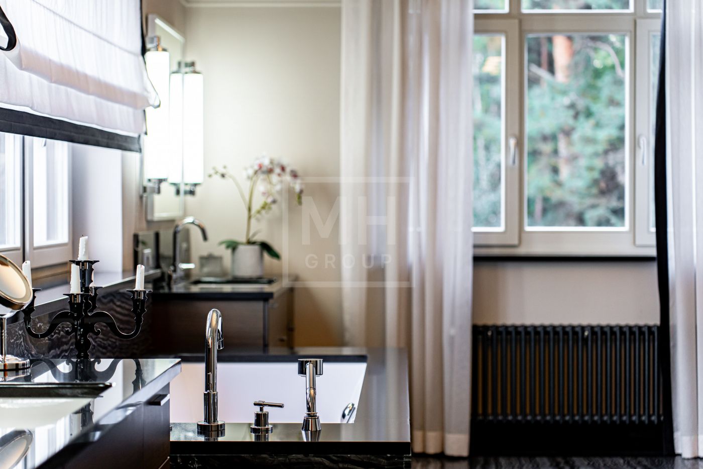 Красивая загородная резиденция в окружение реликтового соснового леса. Из поселка собственный выход в благоустроенный Мещерский парк. Дизайн проект заказывался у модного московского дизайнера. Продуманные планировочные решения. Стильное решение пространства с четким зонированием в духе эклектики с элементами американской классики. В отделке использованы дорогие натуральные отделочные материалы: дубовый паркет, мрамор и т.п. Передвигаться с этажа на этаж можно как на лифте, так и по лестнице. На первом этаже шикарный блок СПА с большим бассейном.от МКАД