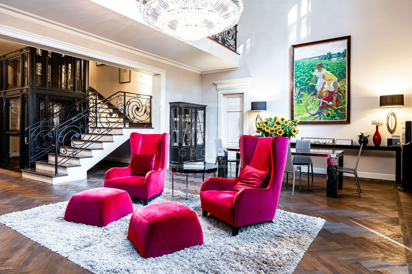 Этаж 2: Мастер-спальня с гардеробной, с/у и выходом на эксплуатируемую кровлю, кабинет с камином и выходом на эксплуатируемую кровлю, спальня гардеробной, с/у и выходом на балкон, спальня с камином, гардеробной, с/у и выходом на балкон