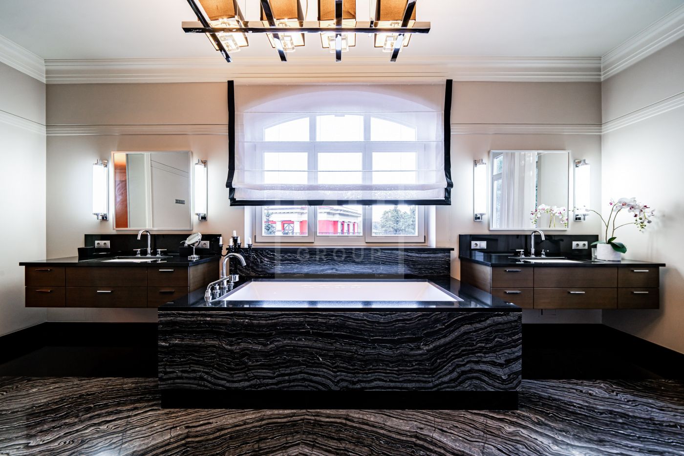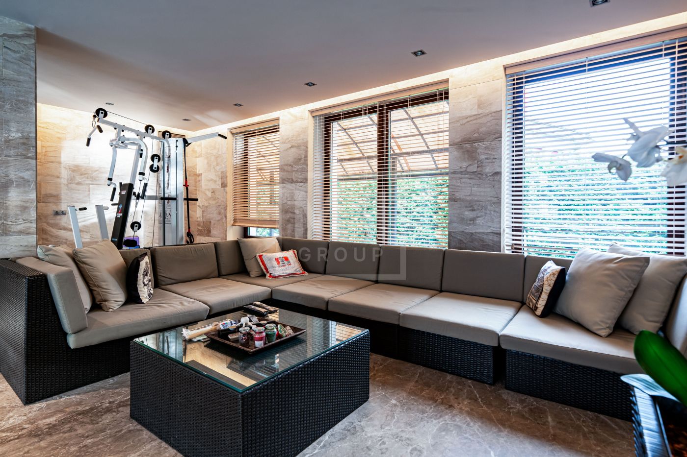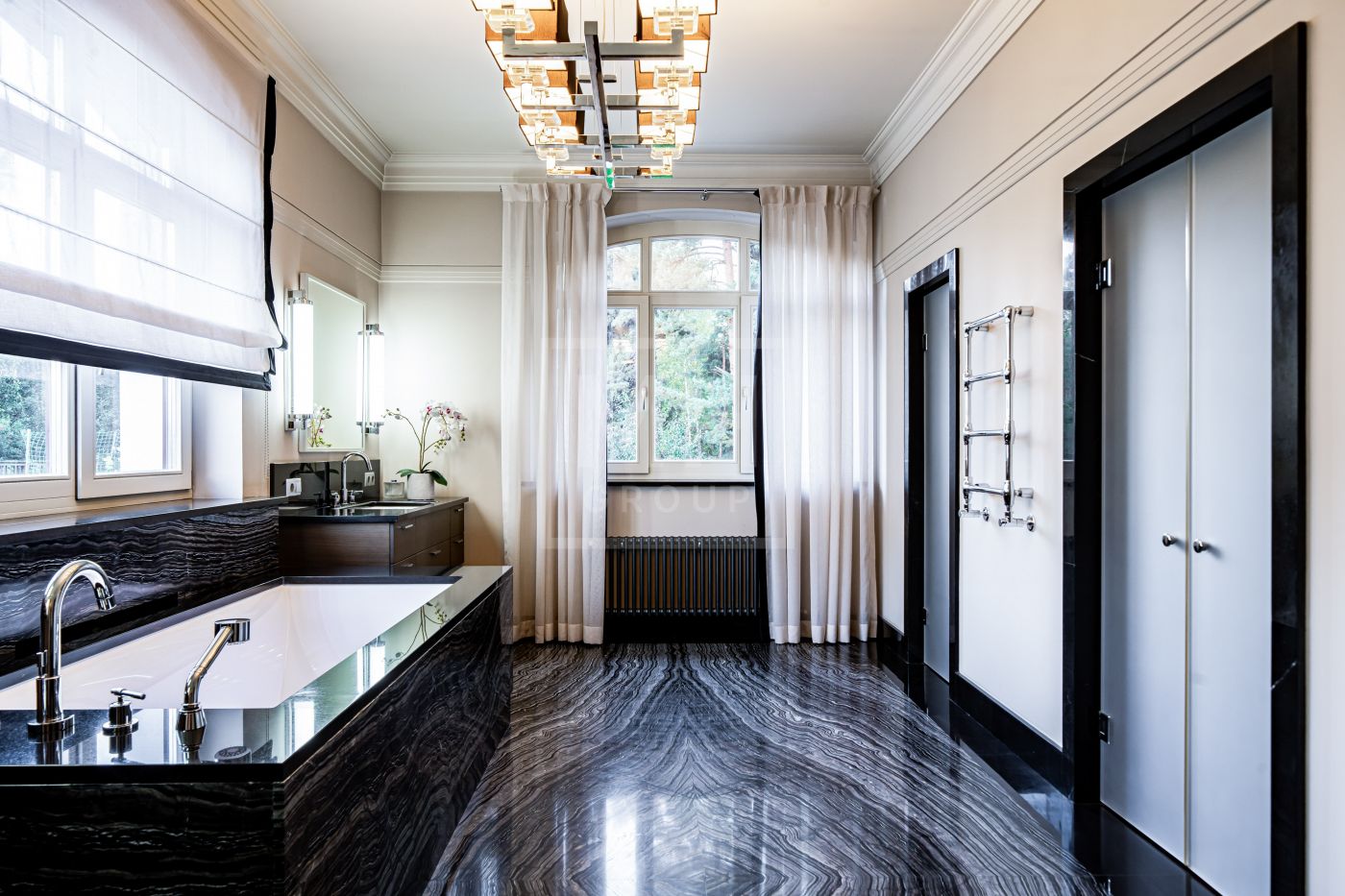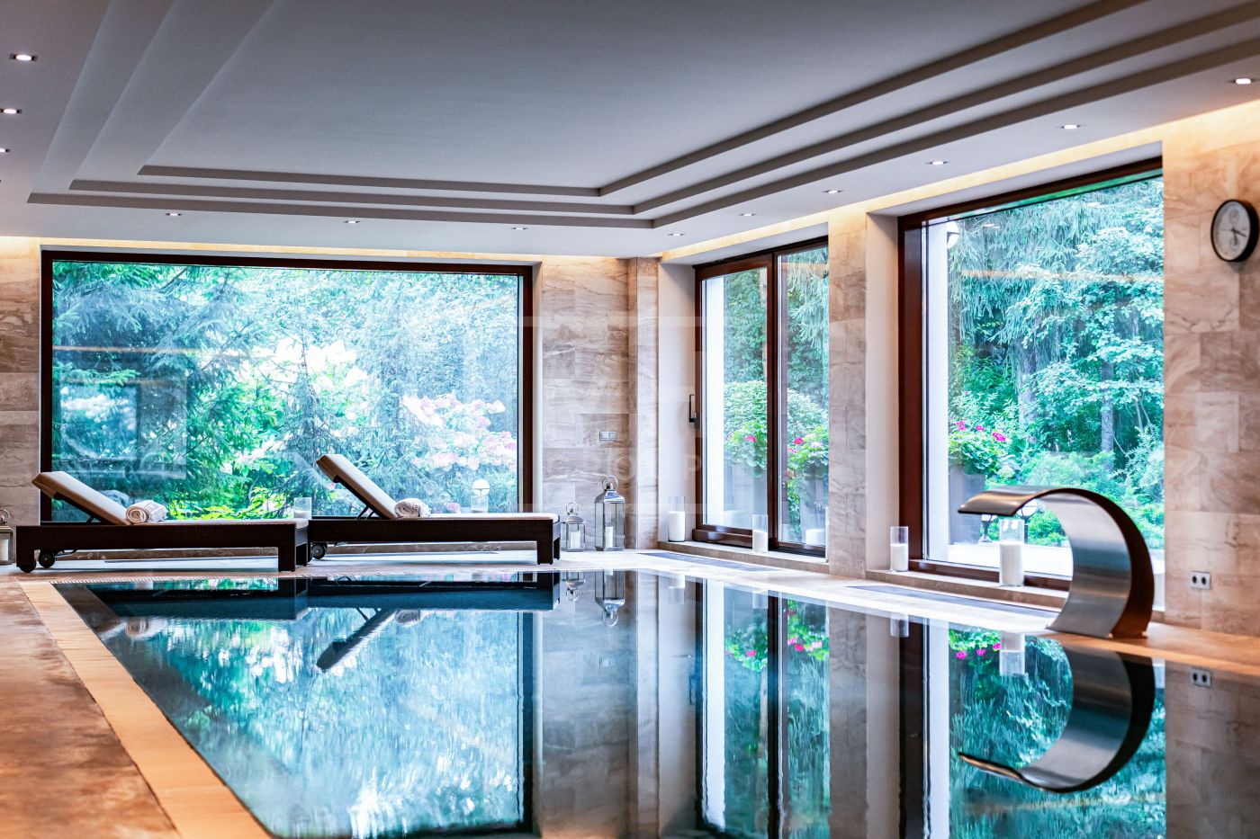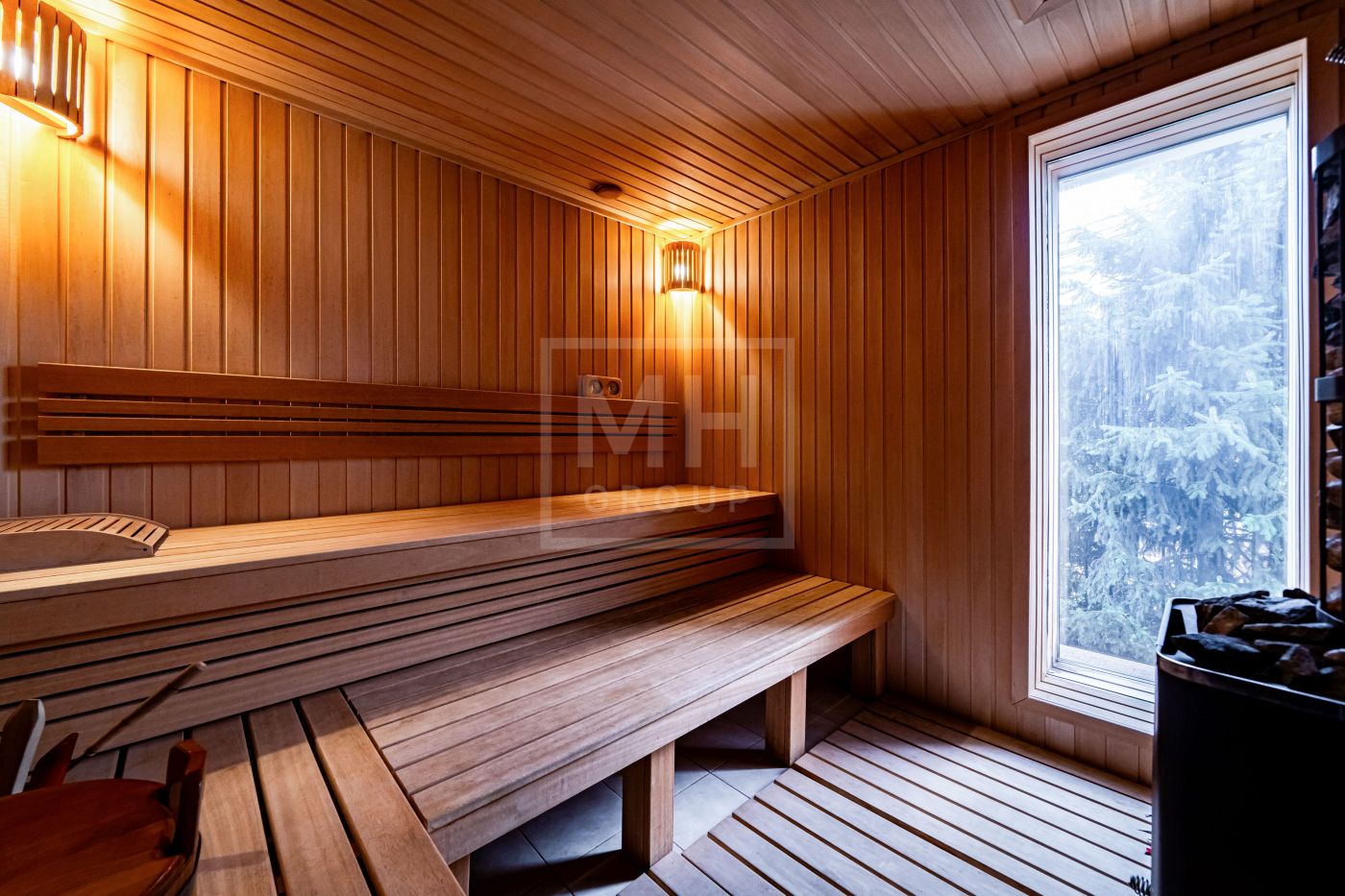 Этаж 1: Холл с гардеробной, с/у и выходом в гараж, кабинет с с/у (можно использовать как спальню) малая гостиная, столовая-гостиная со 2-м светом камином и выходом на террасу, каминная, кухня с выходом на террасу, с/у, черный вход с с/у и выходом в гараж. SPA-зона: бассейн 12*4 с выходом на террасу, массажный кабинет с с/у, сауна, хамам, купель, 2 душевые, зона отдыха, с/у, выход на участок