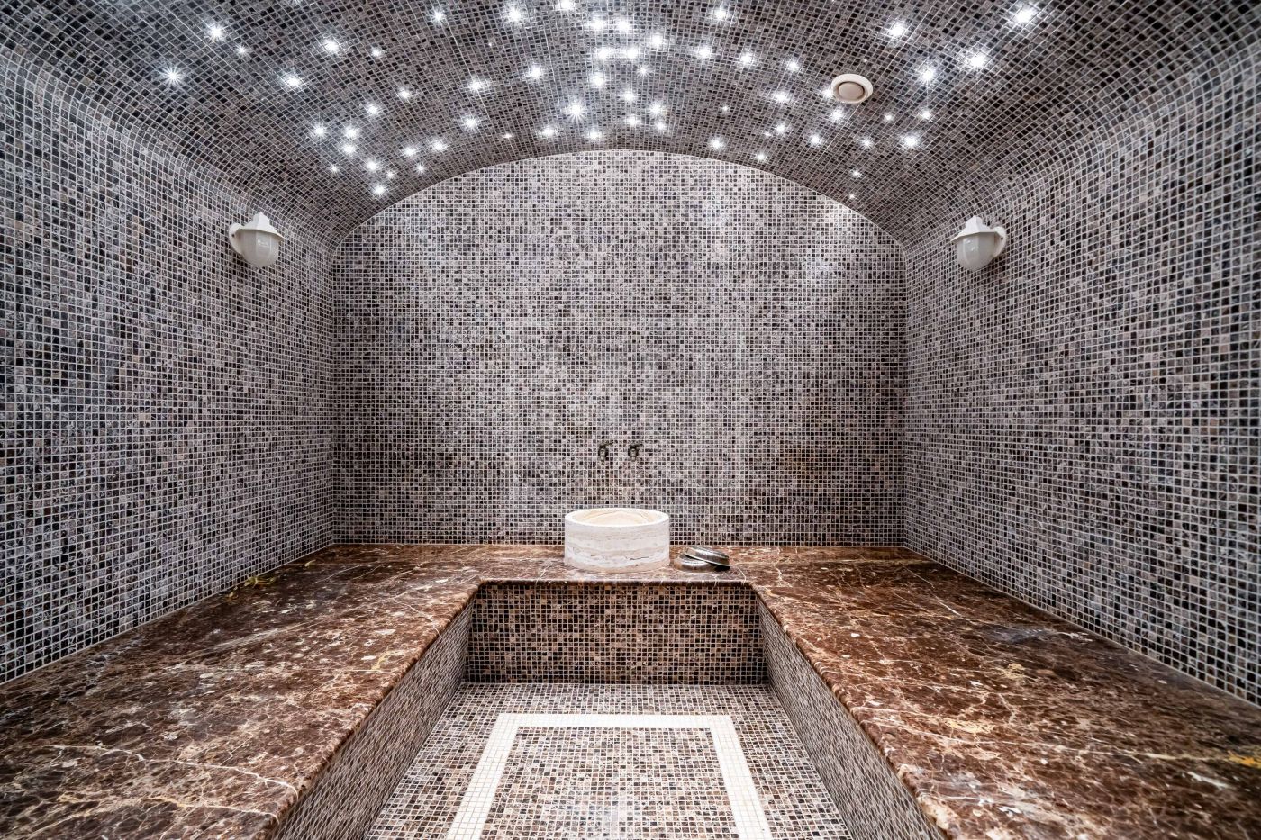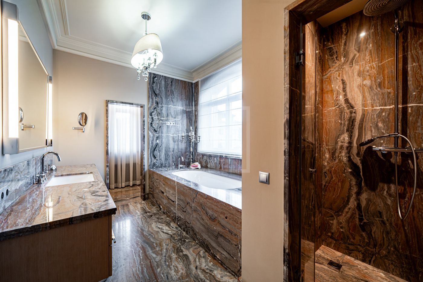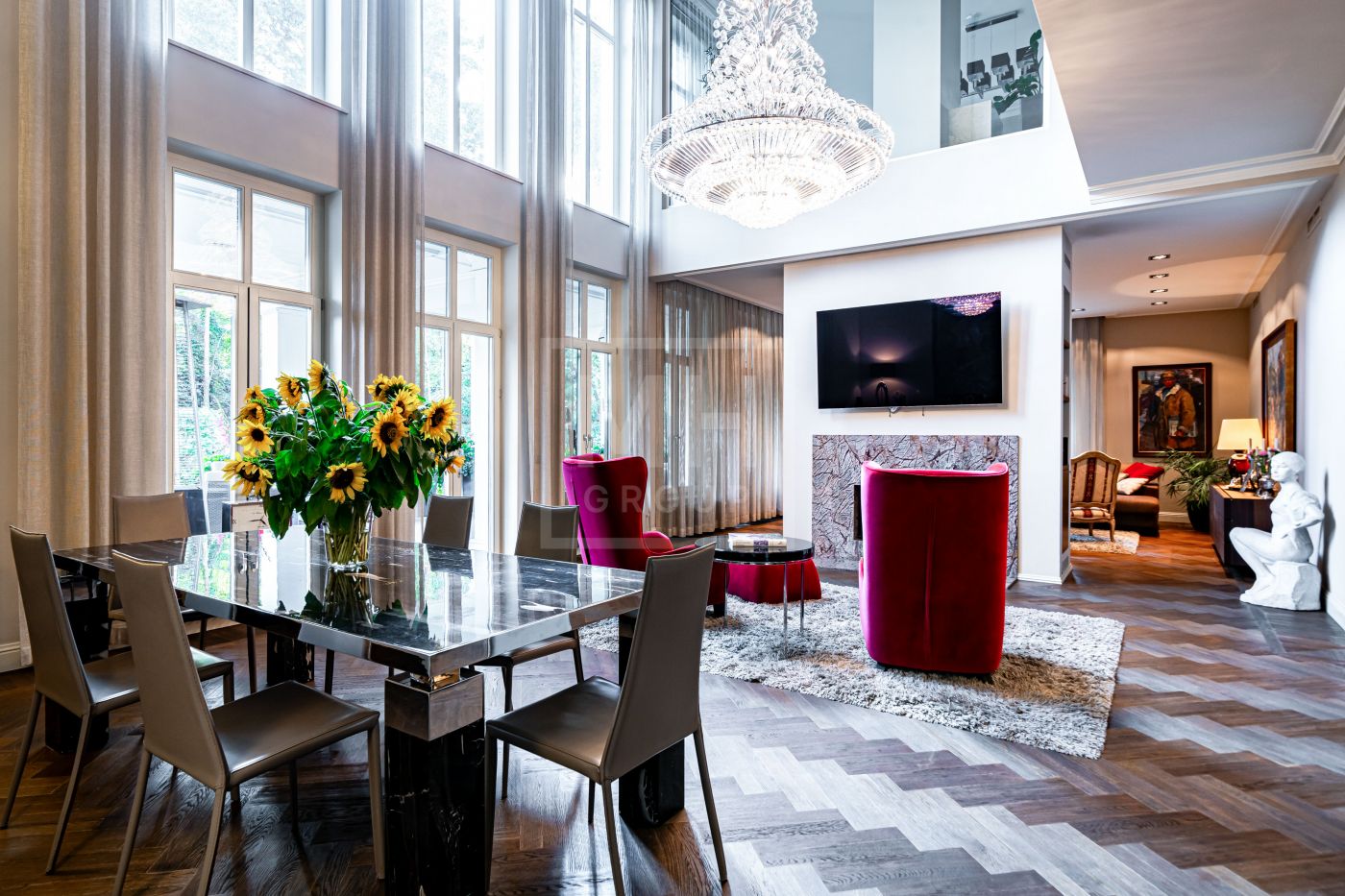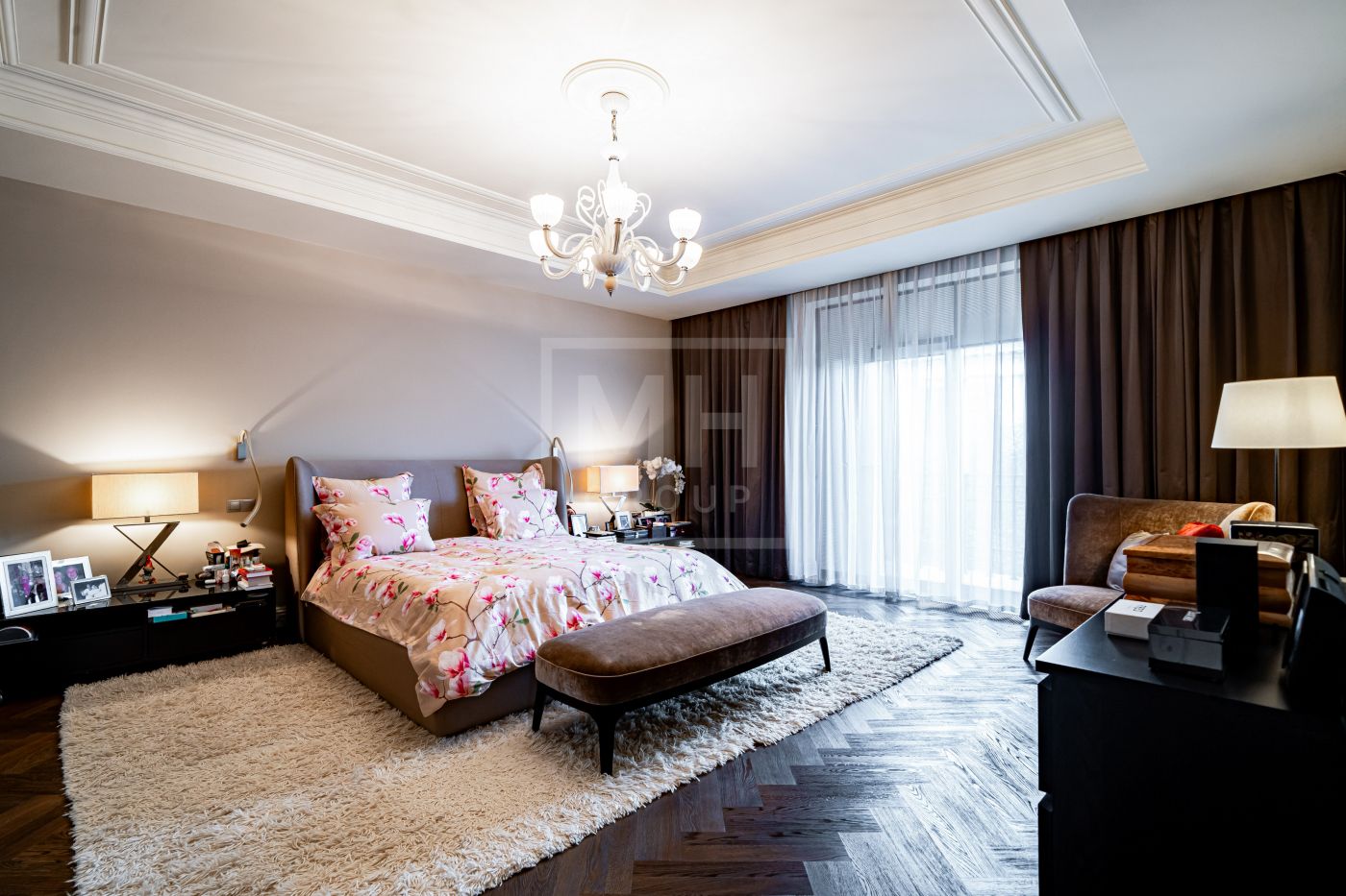 Этаж 1: Холл с гардеробной, с/у и выходом в гараж, кабинет с с/у (можно использовать как спальню) малая гостиная, столовая-гостиная со 2-м светом камином и выходом на террасу, каминная, кухня с выходом на террасу, с/у, черный вход с с/у и выходом в гараж. SPA-зона: бассейн 12*4 с выходом на террасу, массажный кабинет с с/у, сауна, хамам, купель, 2 душевые, зона отдыха, с/у, выход на участок